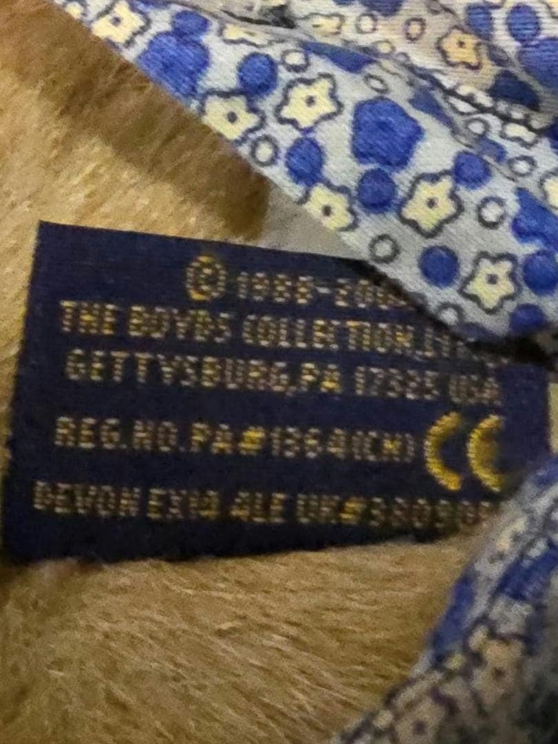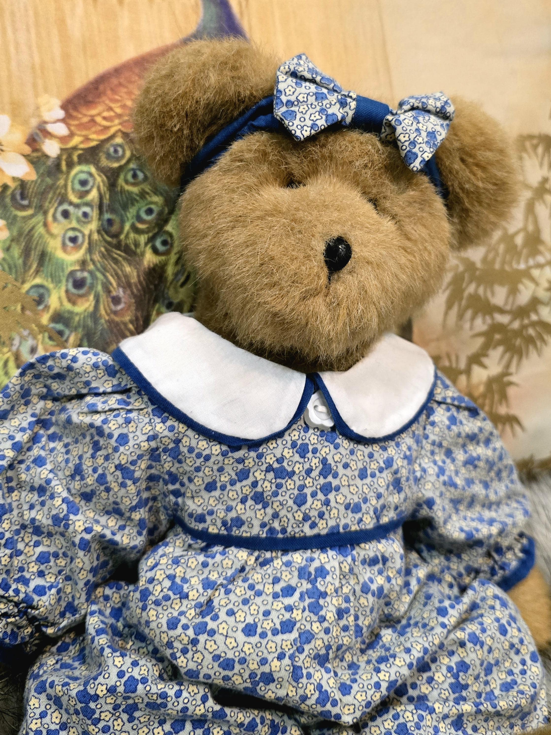 This vintage Boyds bear from 1988 stands 38cm tall, dressed in a freshly laundered blue floral outfit with puffed sleeves, a Peter Pan collar, and a matching headband bow. Her tag affirms Boyds’ protected design, marking her as part of their collectible plush lineage.