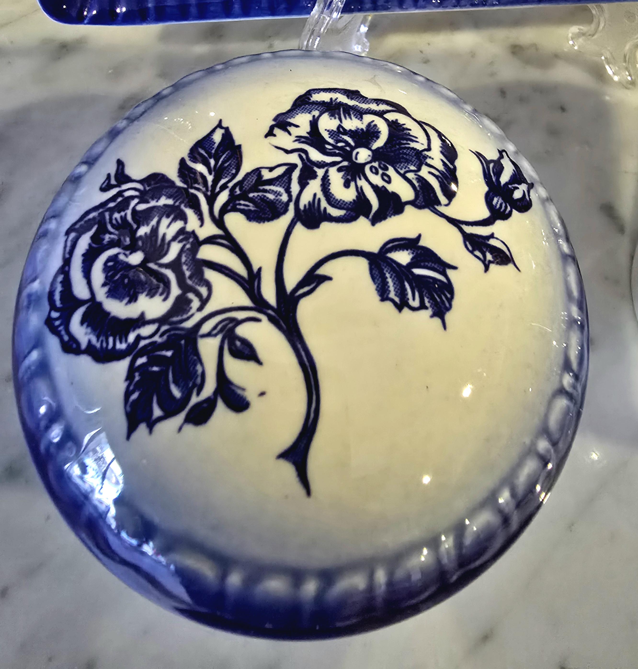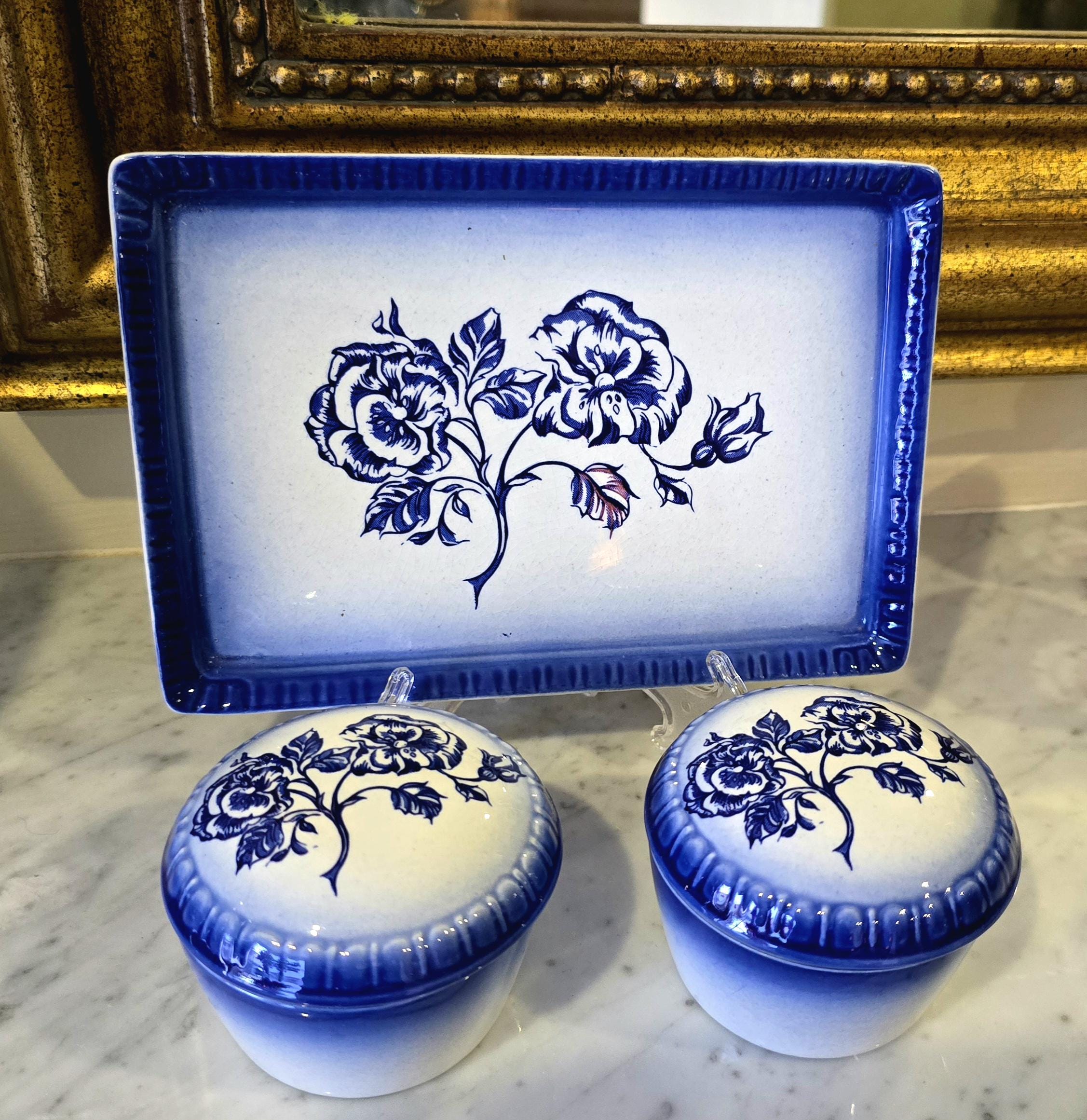 A delicate trio for the sanctuary of your dressing table — this vintage Carlton Ware set includes a rectangular tray (19 × 13cm) and two matching lidded trinket pots (each 9cm wide). Glazed in a soft gradient of blue fading to white, the set features a traditional floral motif of roses and leaves, rendered with quiet elegance.