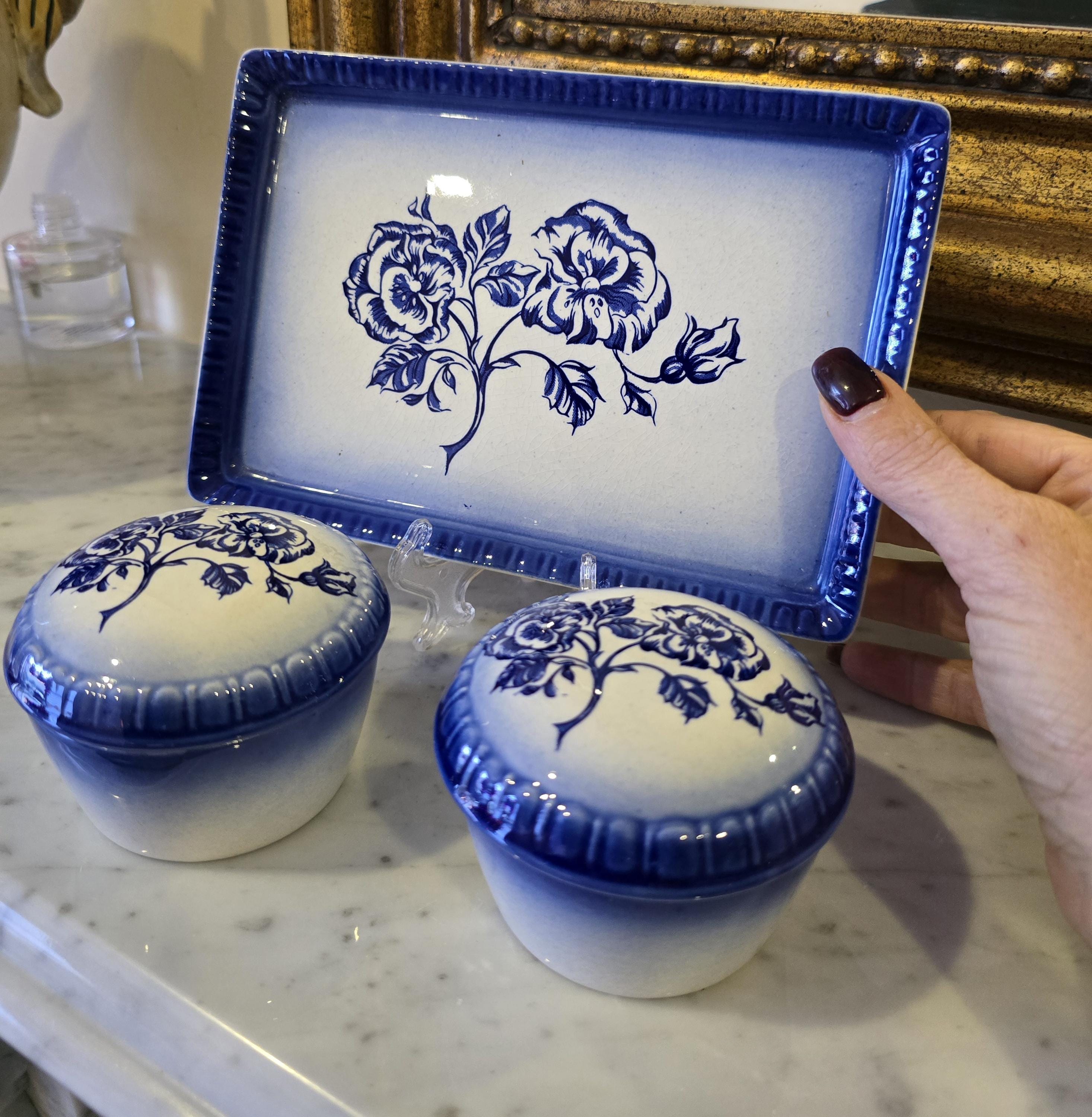 The tray’s ribbed border frames a central bloom, while the pots echo the design with matching lids and gentle curves. Ideal for storing rings, earrings, or small keepsakes — or simply for display as a layered offering of beauty and function.