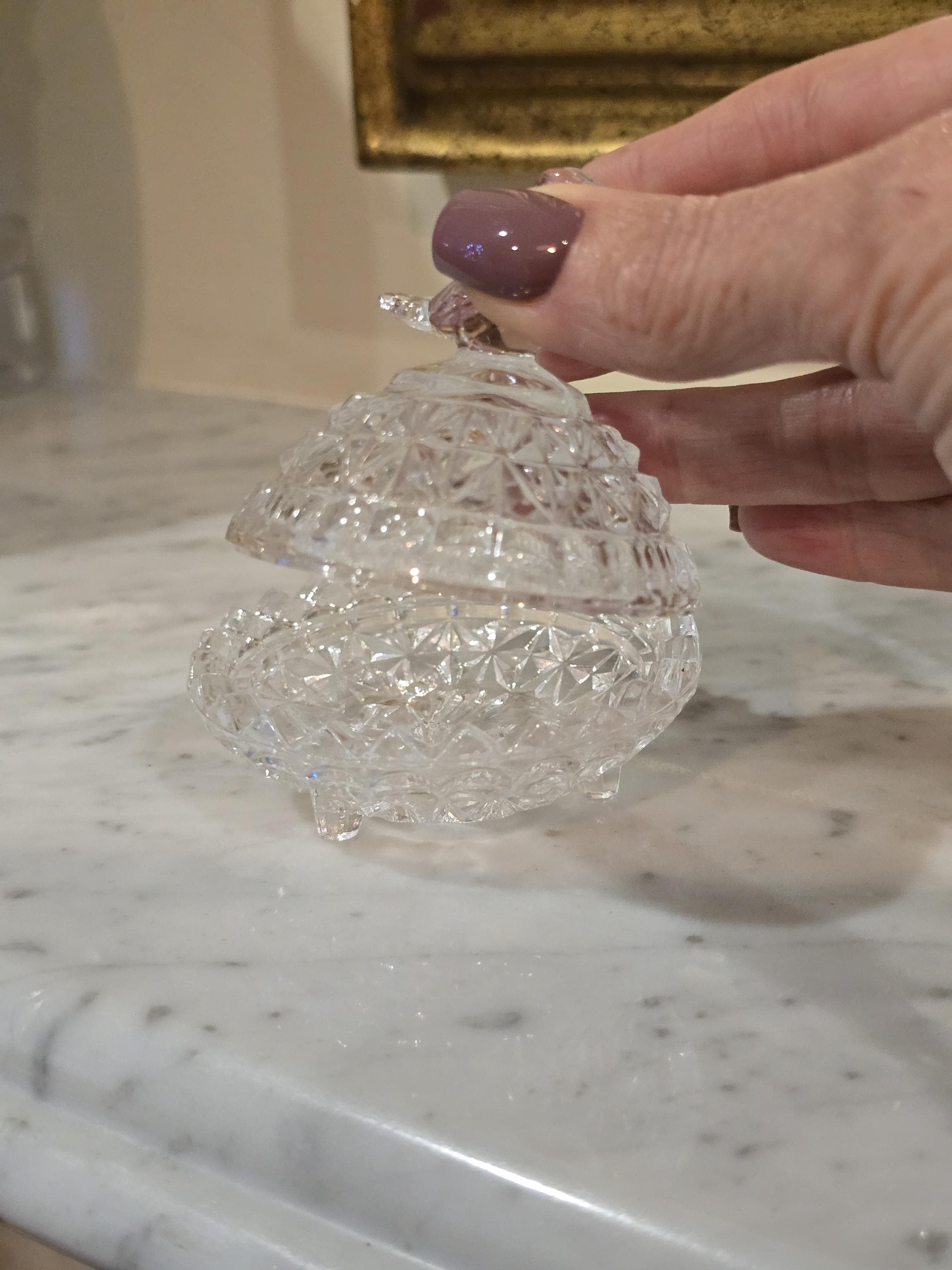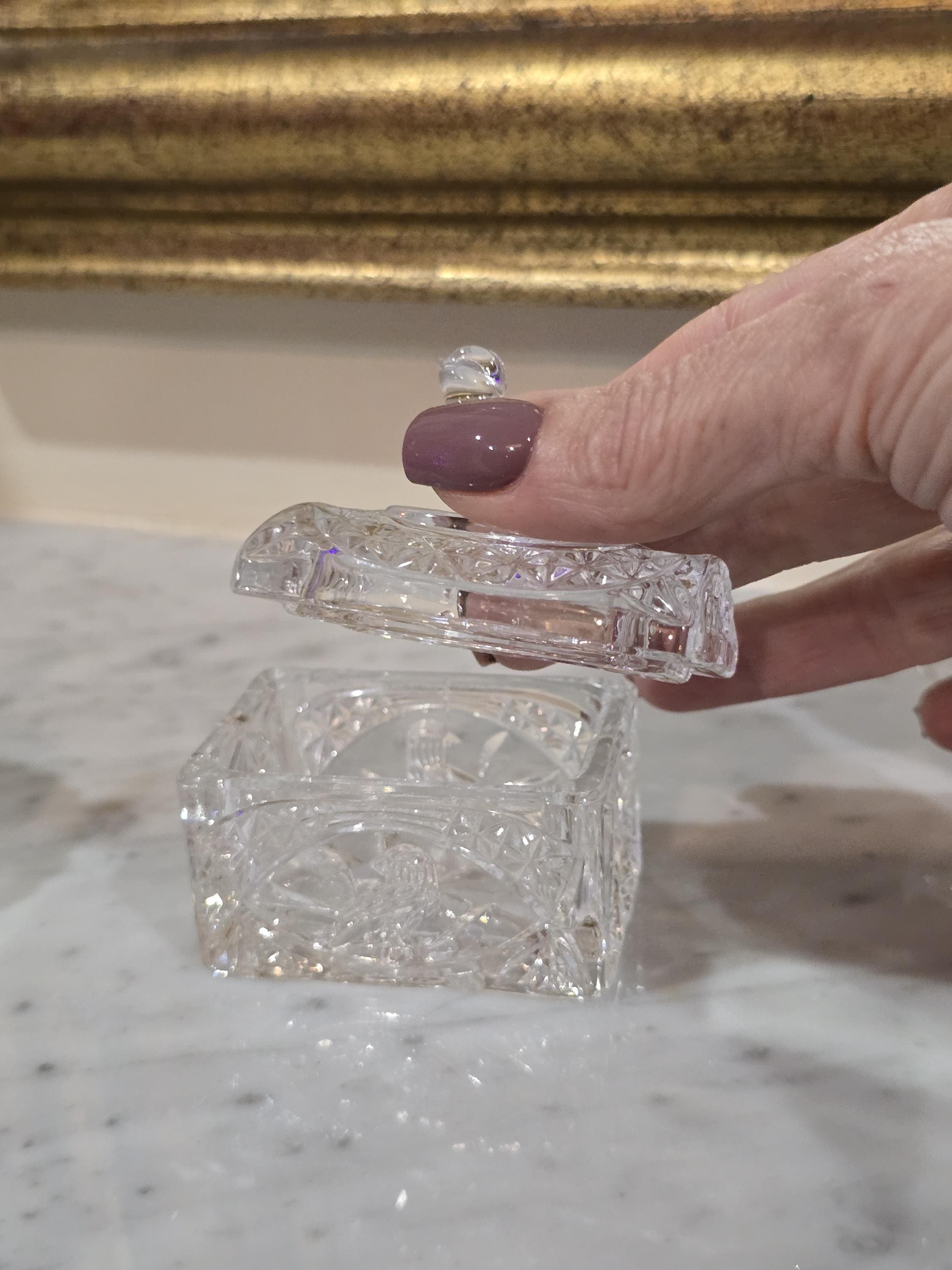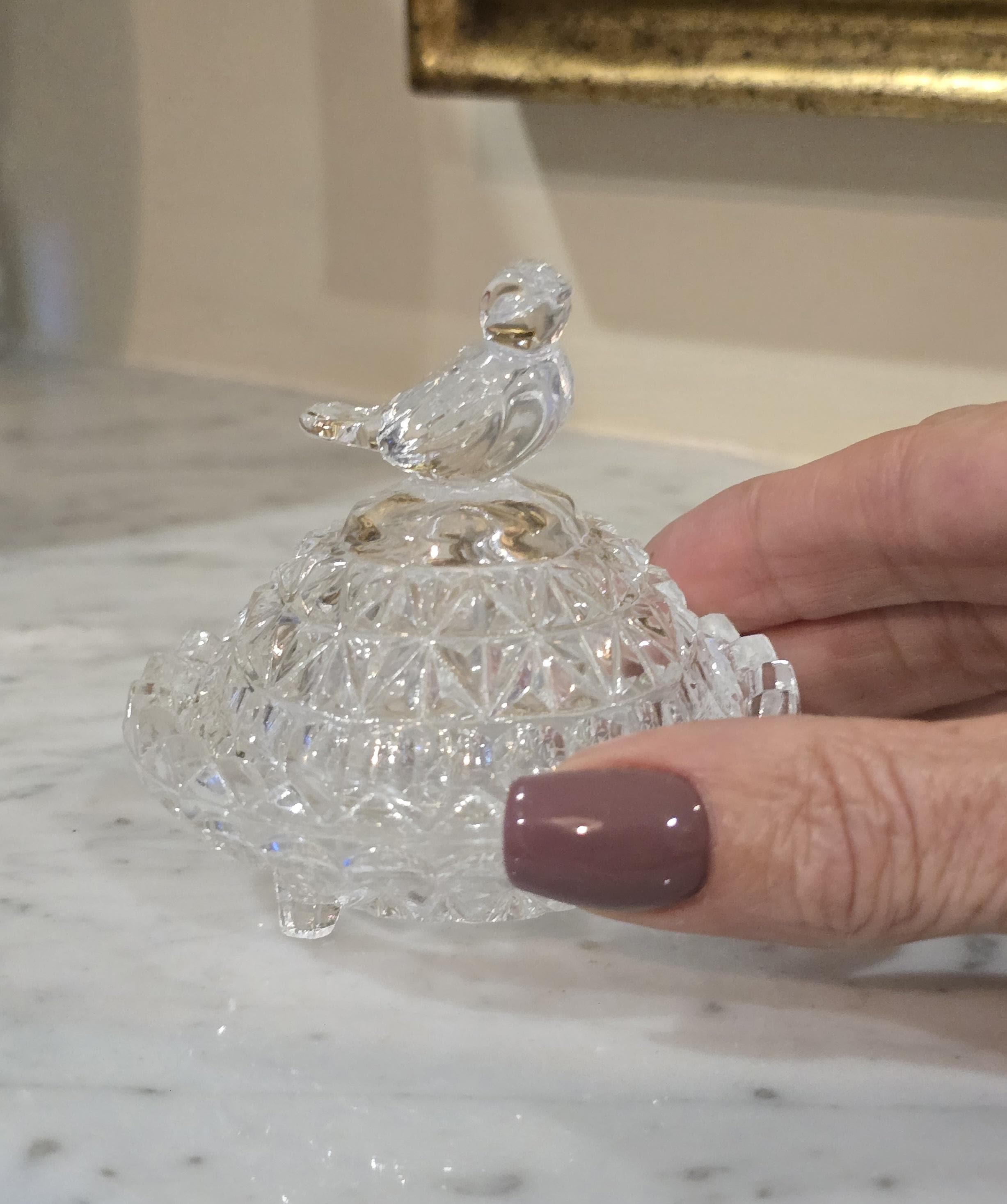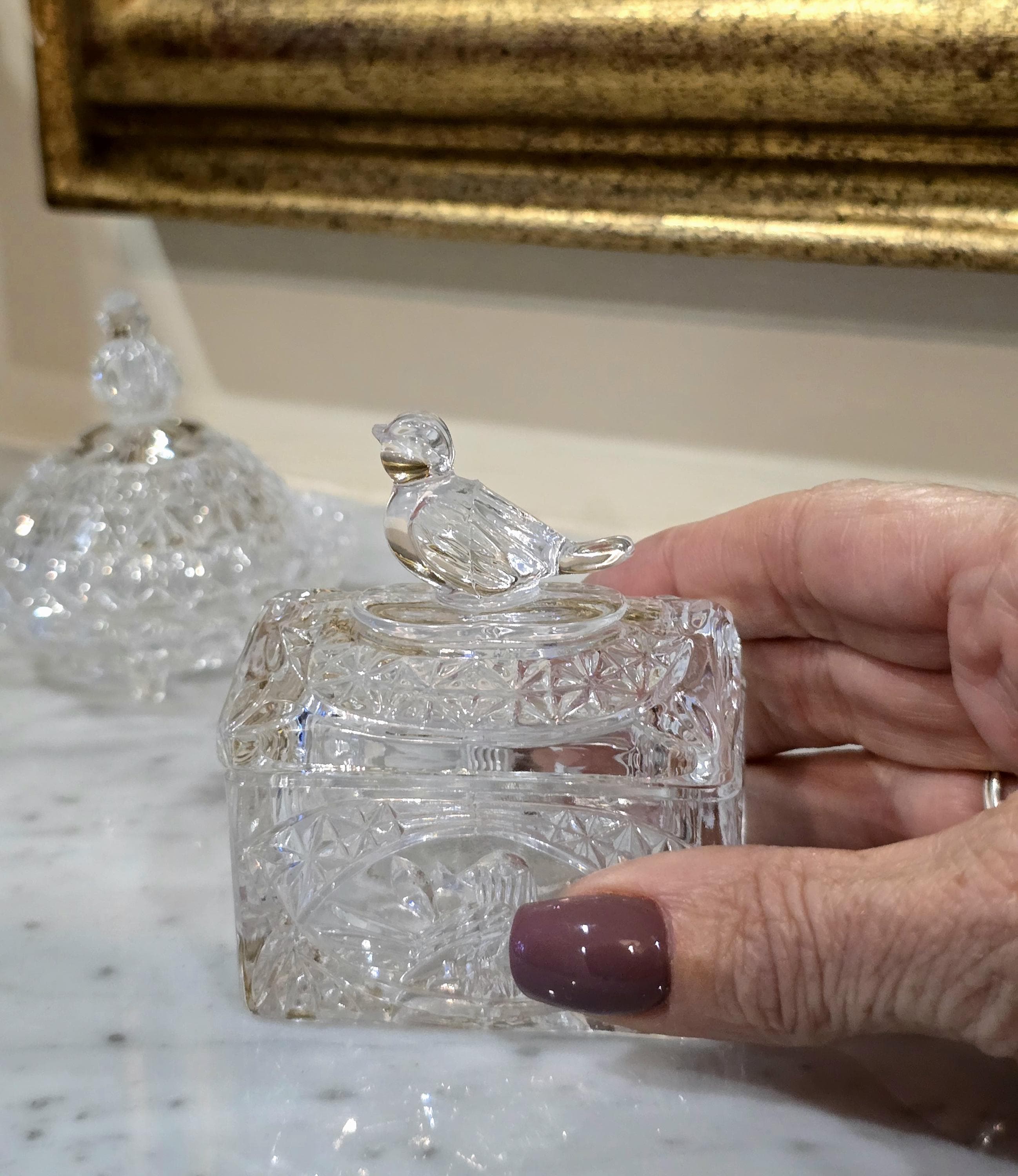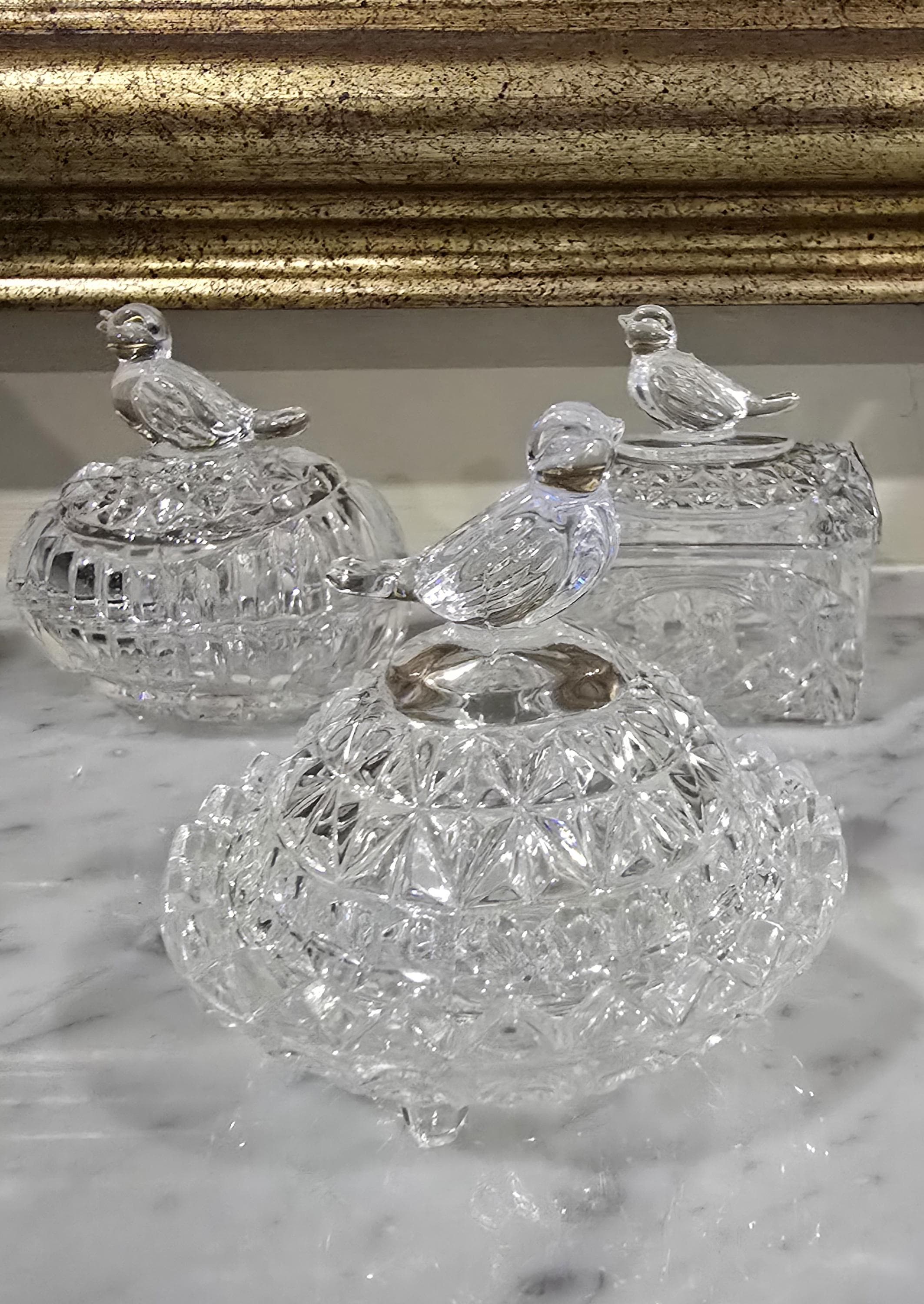 These vintage containers, ranging from 5 to 7 cm in height, shimmer with cut-glass detail and gentle charm. One rests on tiny feet with a starburst base, another smooth and rounded like a plum in winter light, and the third ribbed with vertical grace. Each bird perches atop its lid, wings poised, tail feathers etched in glass memory.