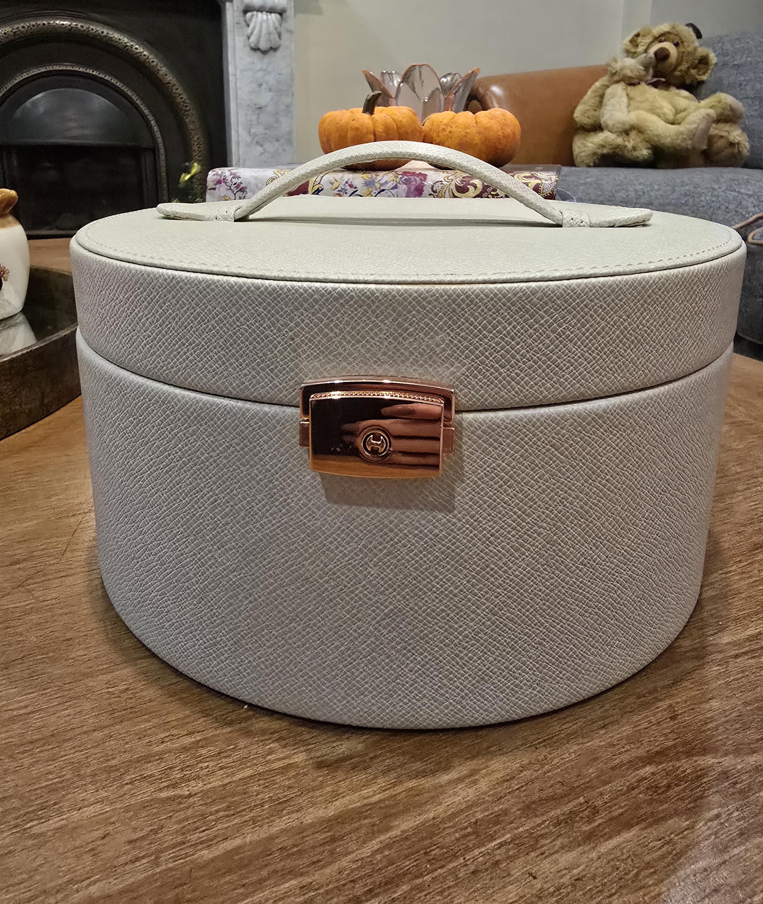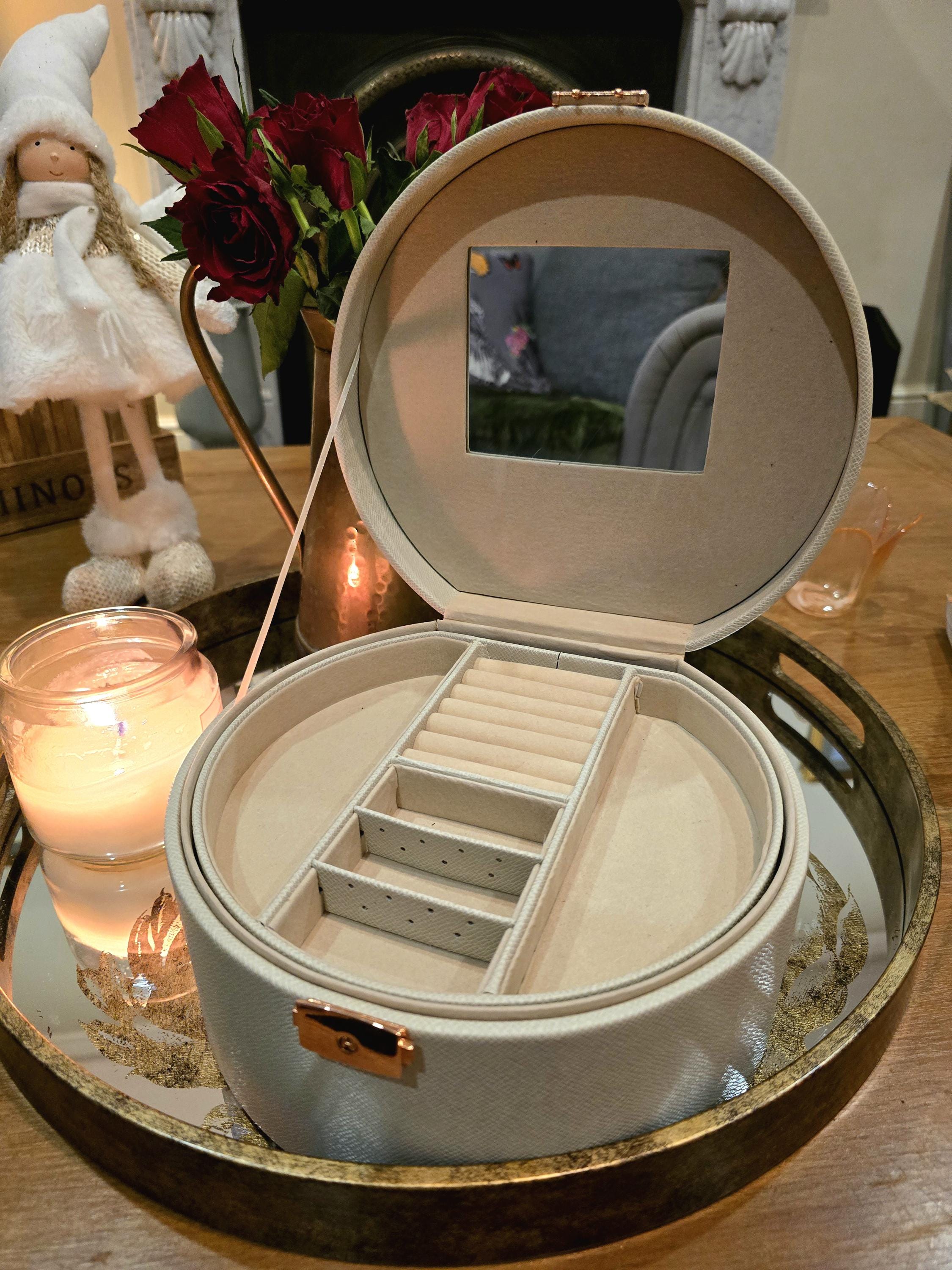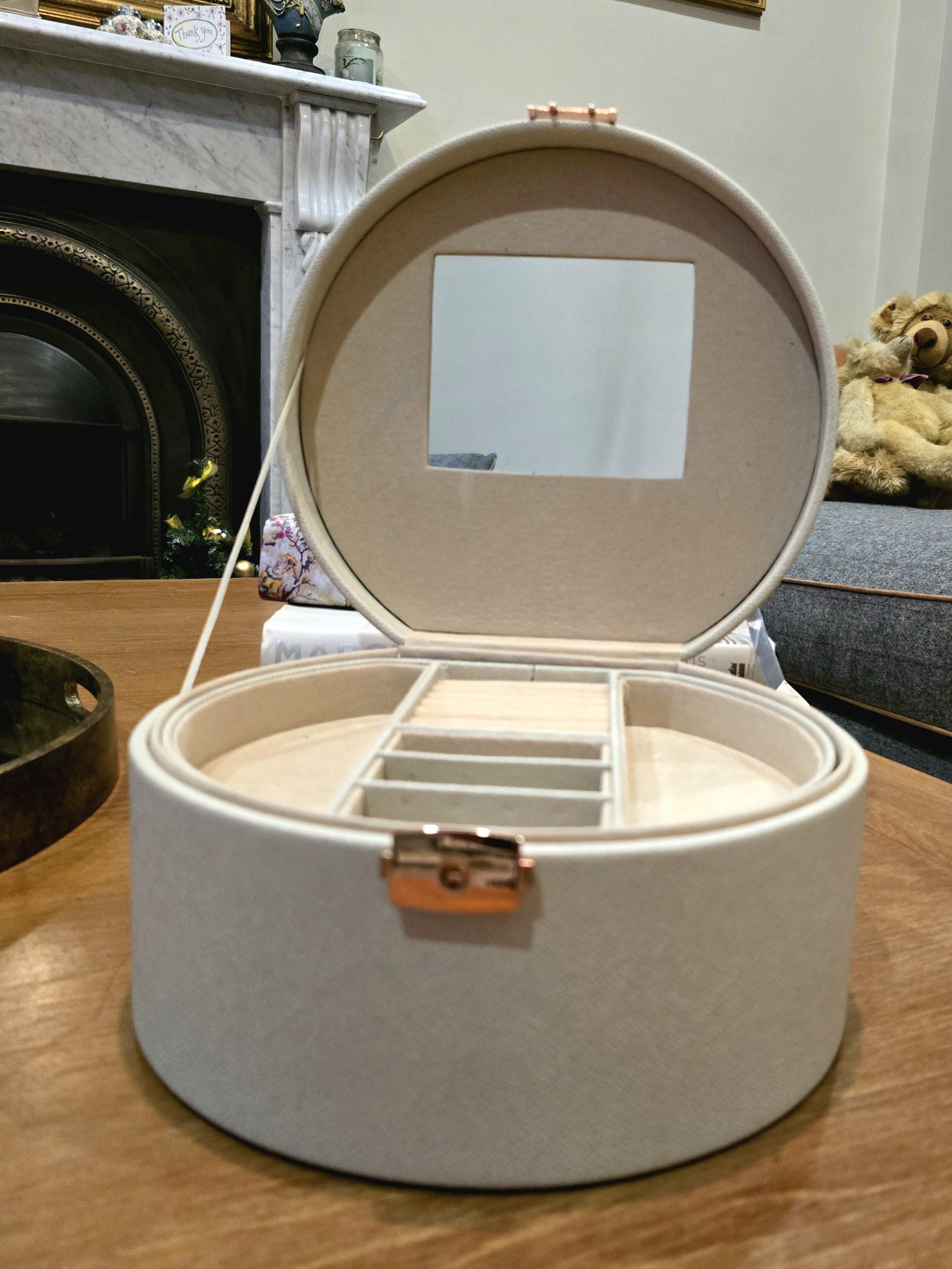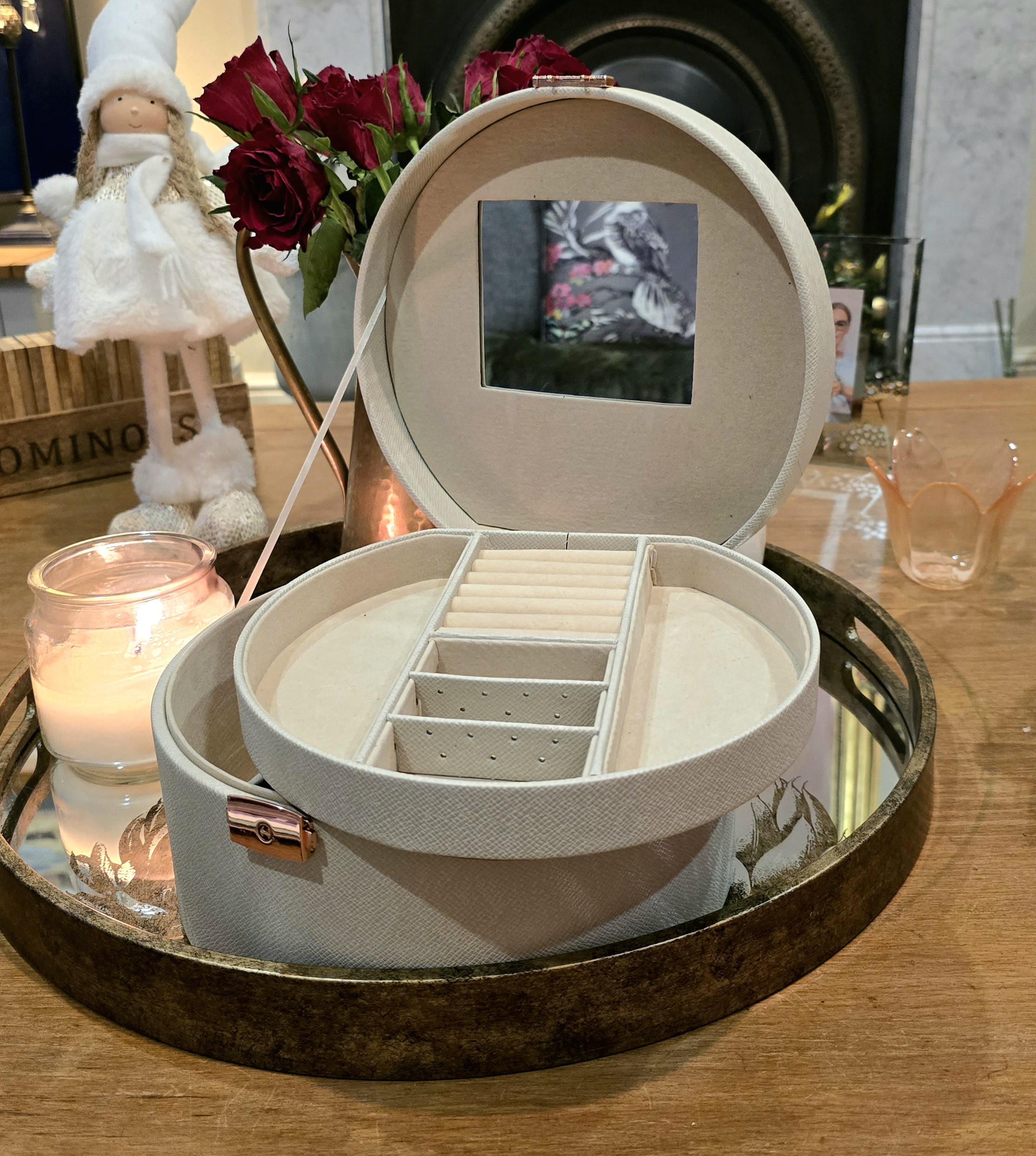 A soft echo of boudoir elegance, this vintage-inspired round jewellery box blends vanity charm with practical grace. Finished in a cream leather-effect texture and lined with gentle compartments, it’s a sanctuary for rings, earrings, and keepsakes.