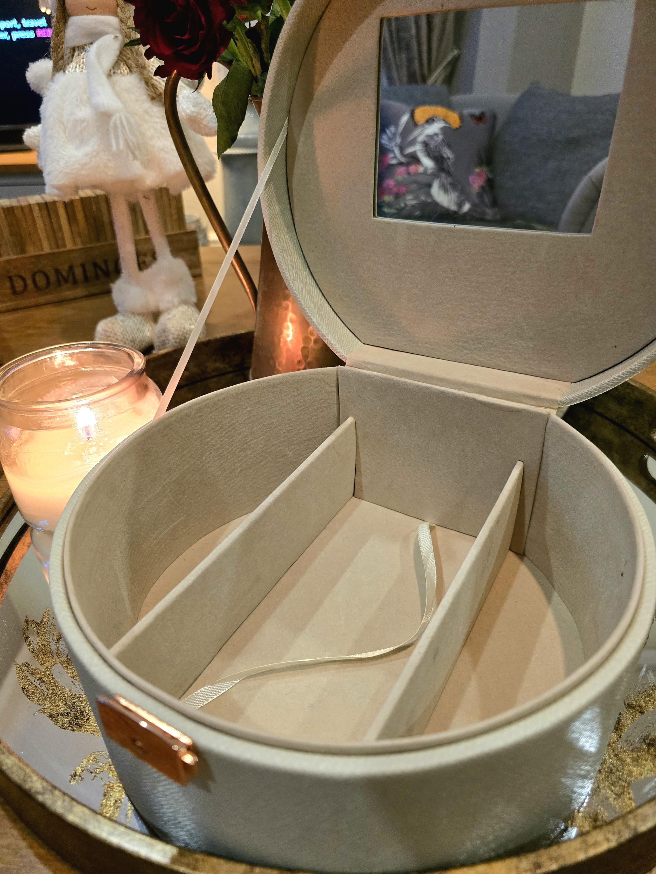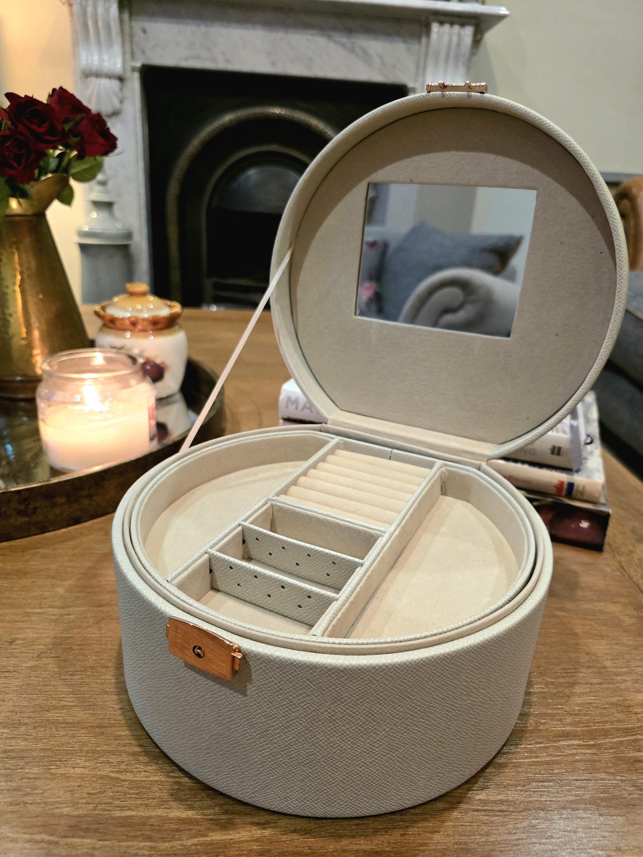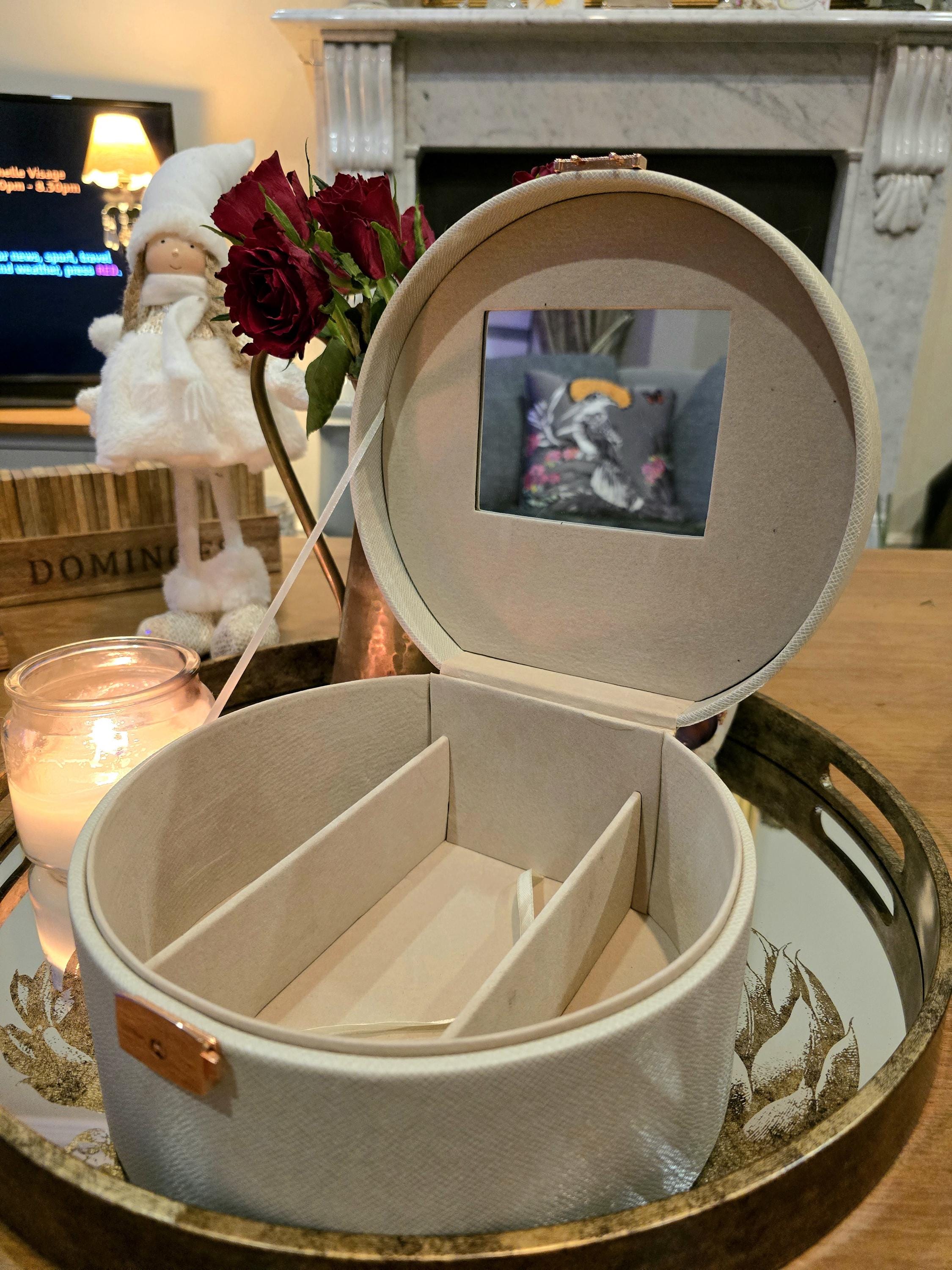 A soft echo of boudoir elegance, this vintage-inspired round jewellery box blends vanity charm with practical grace. Finished in a cream leather-effect texture and lined with gentle compartments, it’s a sanctuary for rings, earrings, and keepsakes.