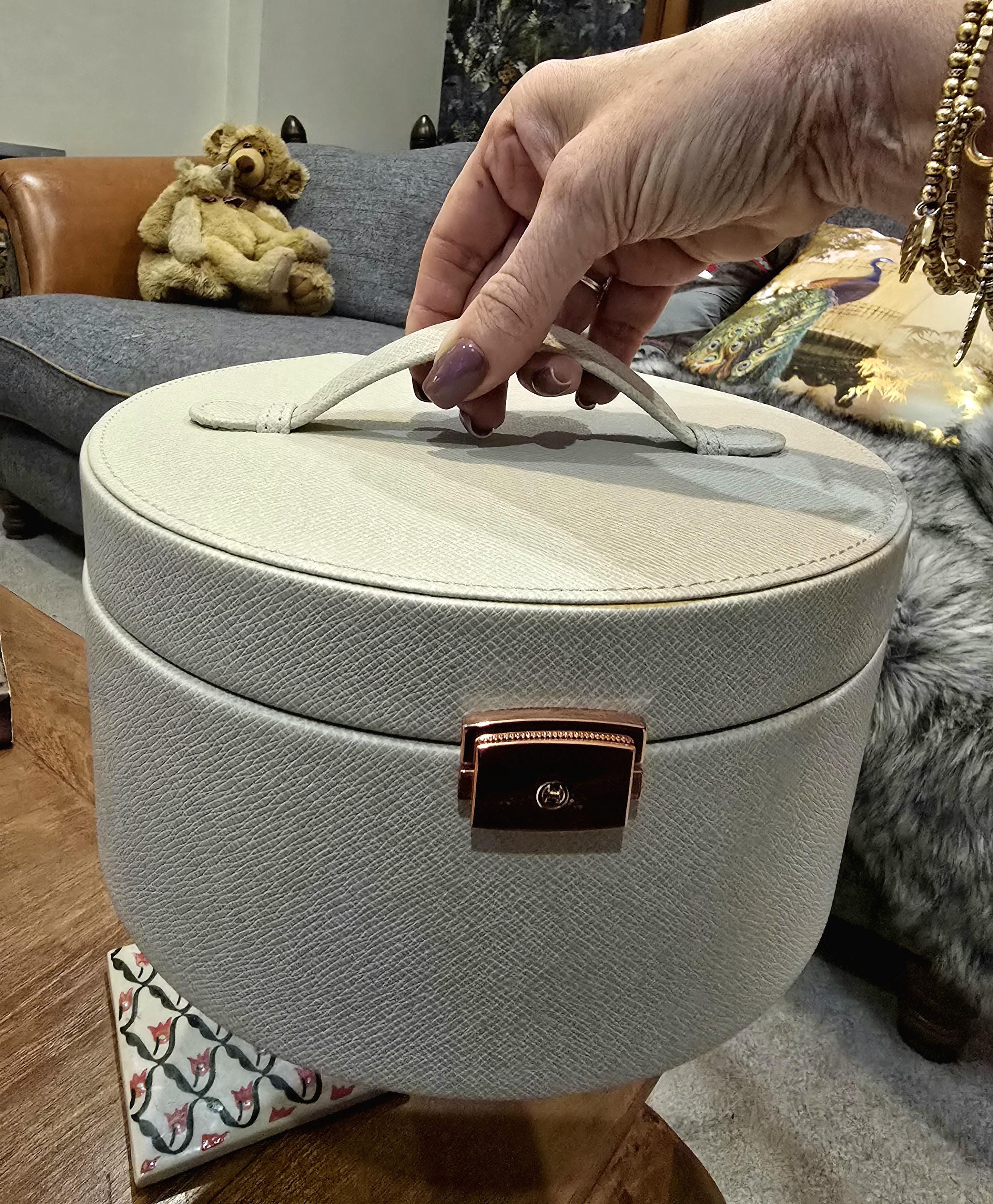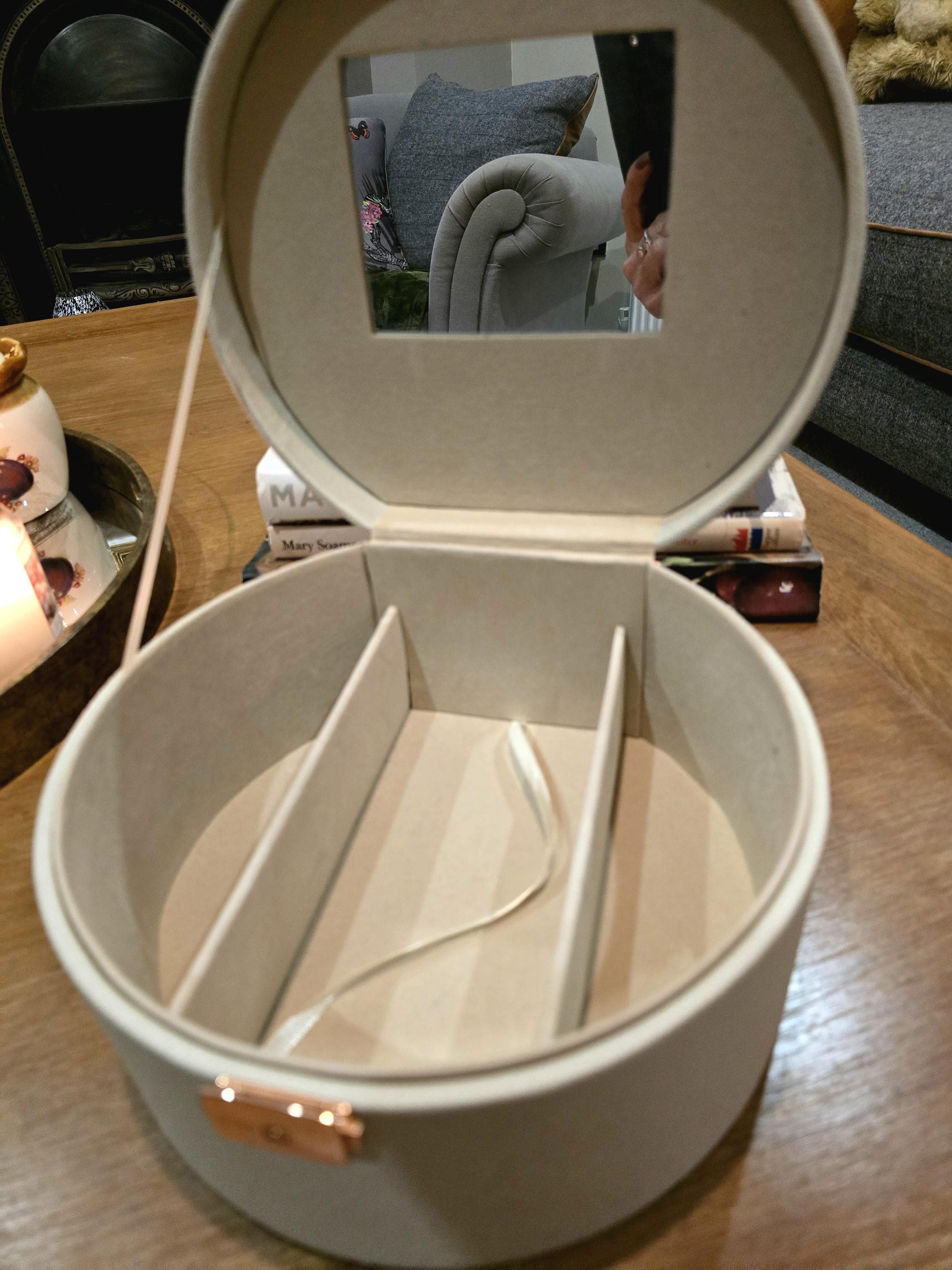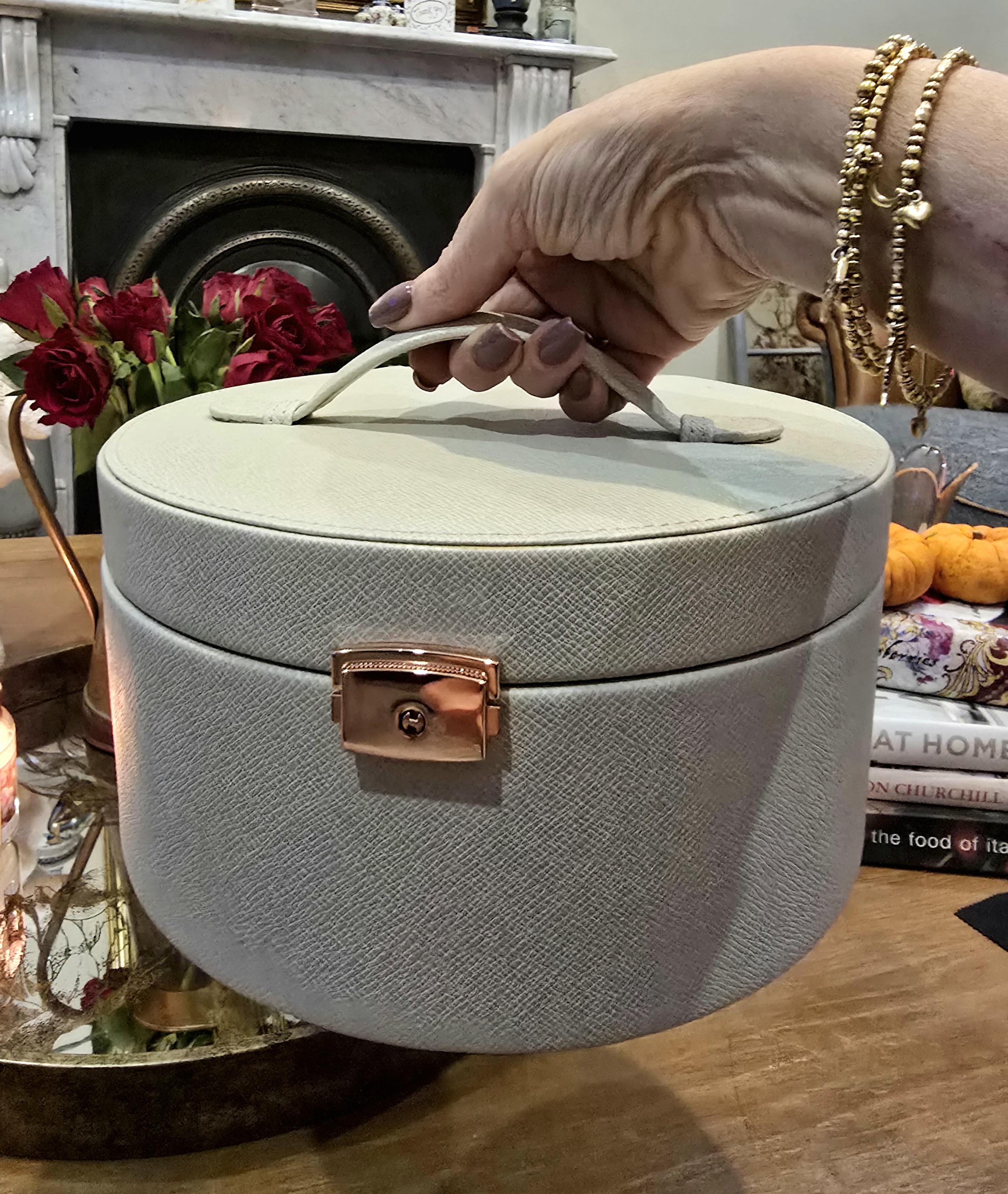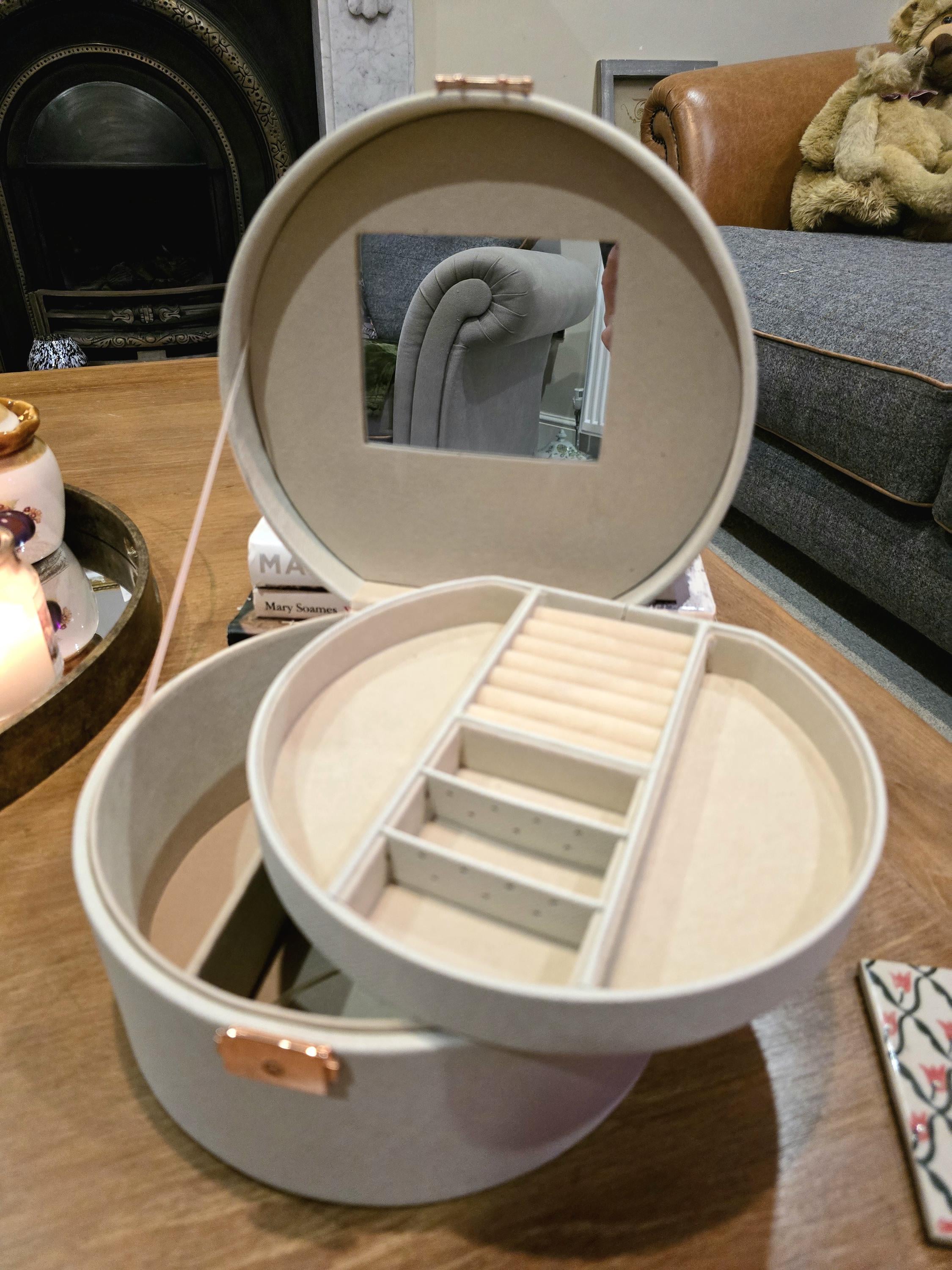 A soft echo of boudoir elegance, this vintage-inspired round jewellery box blends vanity charm with practical grace. Finished in a cream leather-effect texture and lined with gentle compartments, it’s a sanctuary for rings, earrings, and keepsakes.