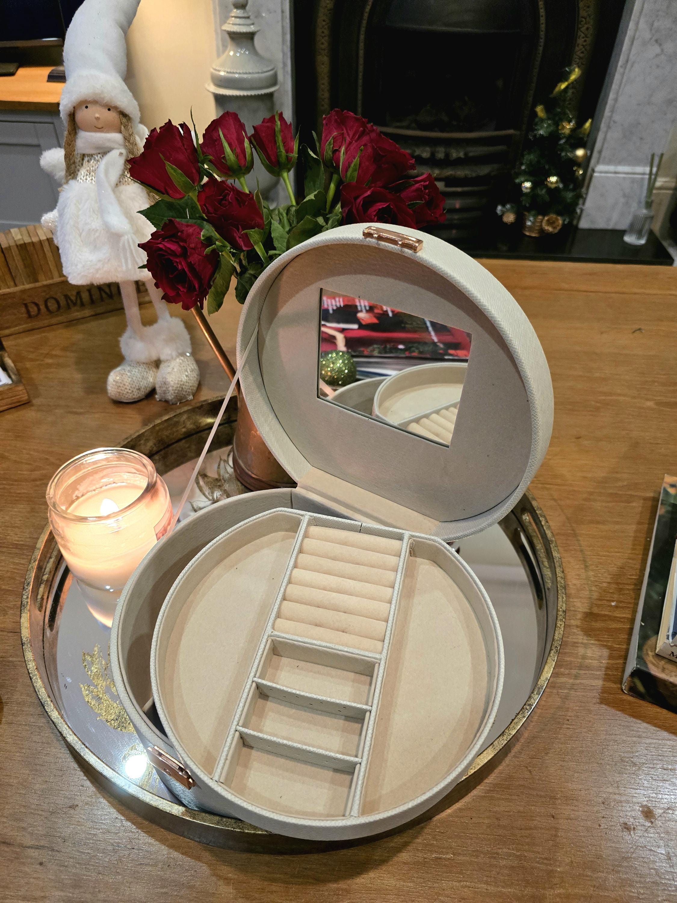 Vintage Cream Round Jewellery Box – Boudoir Chic Leather-Effect Vanity Case with Mirror | Gifts for Her