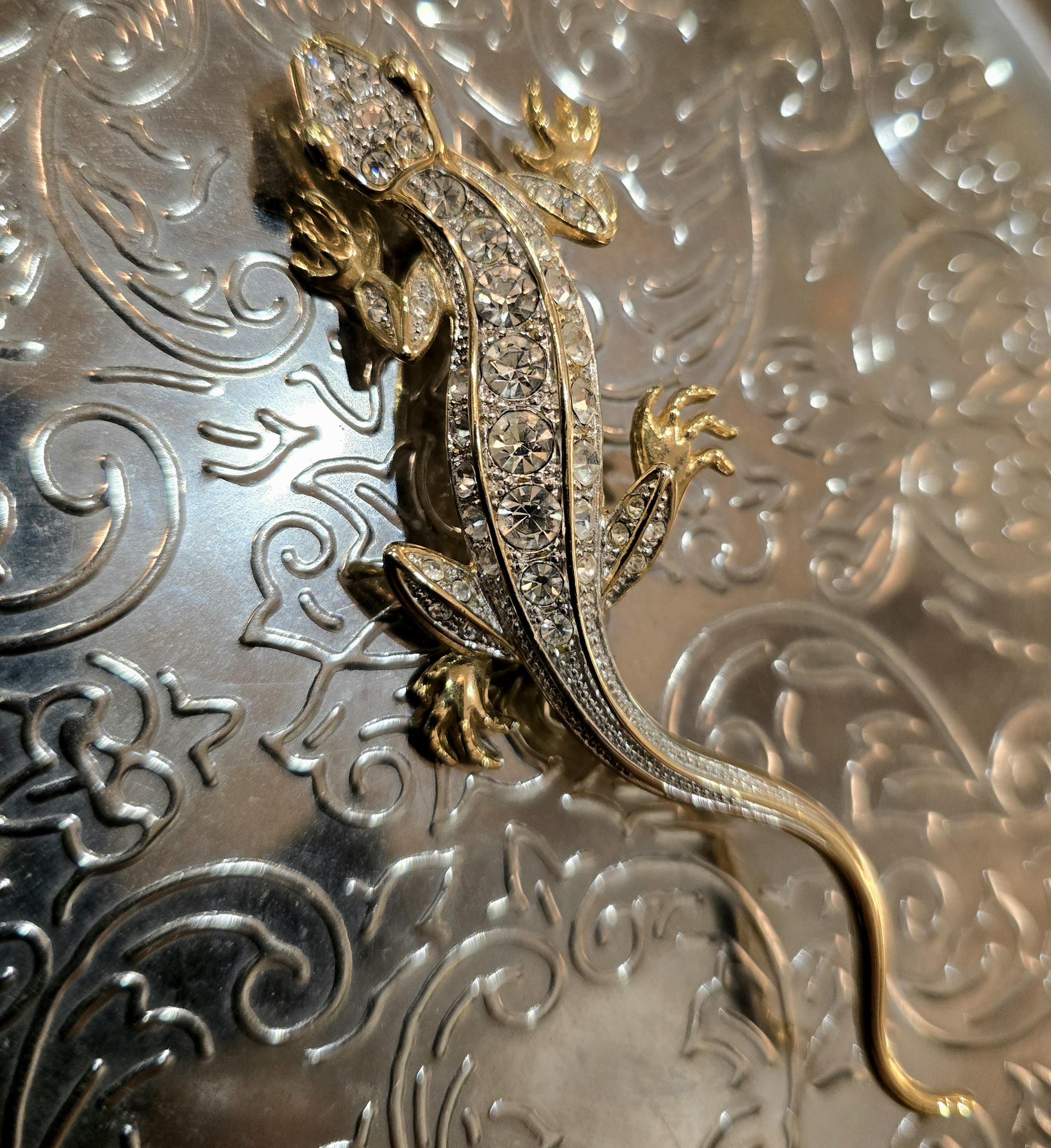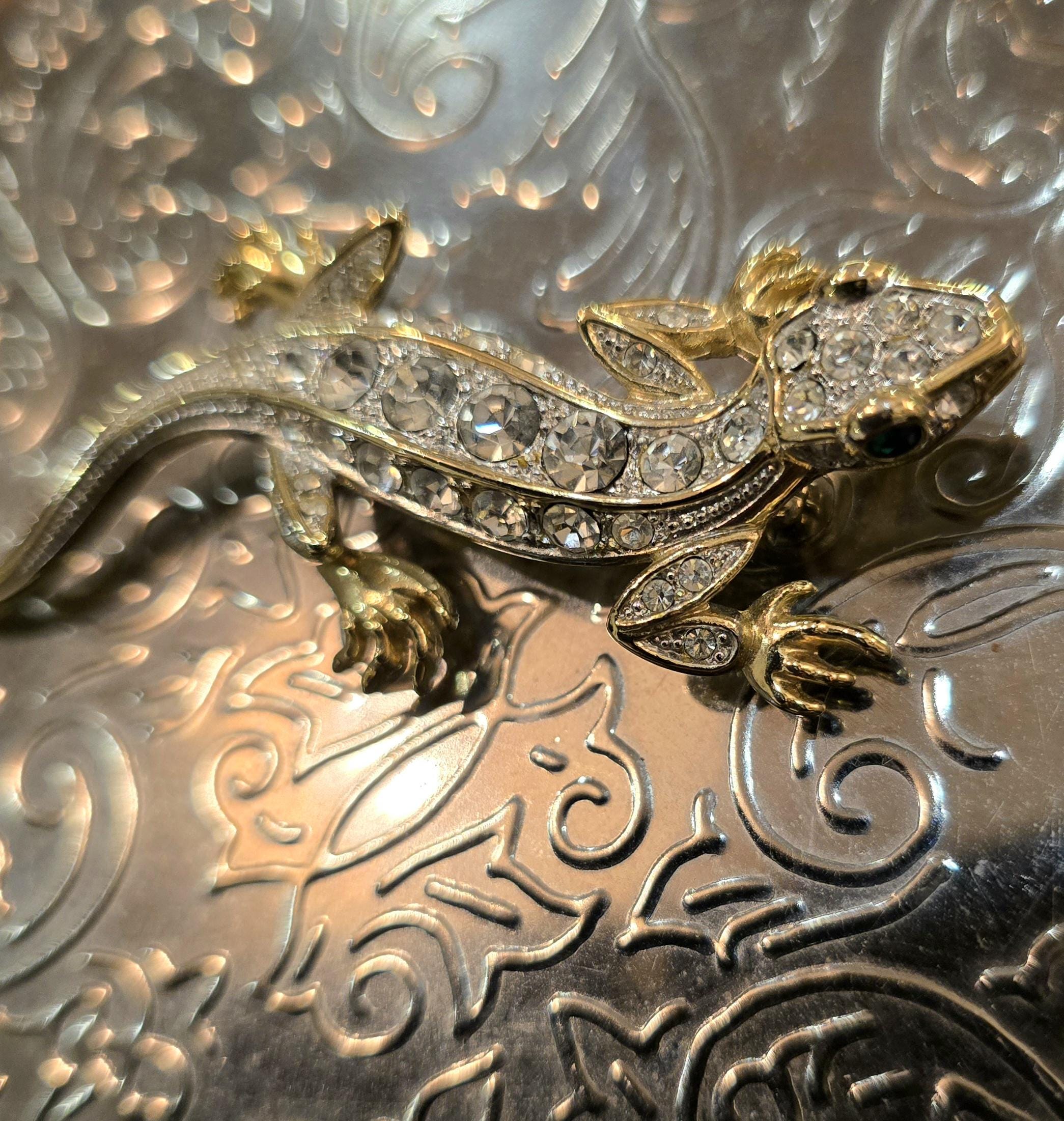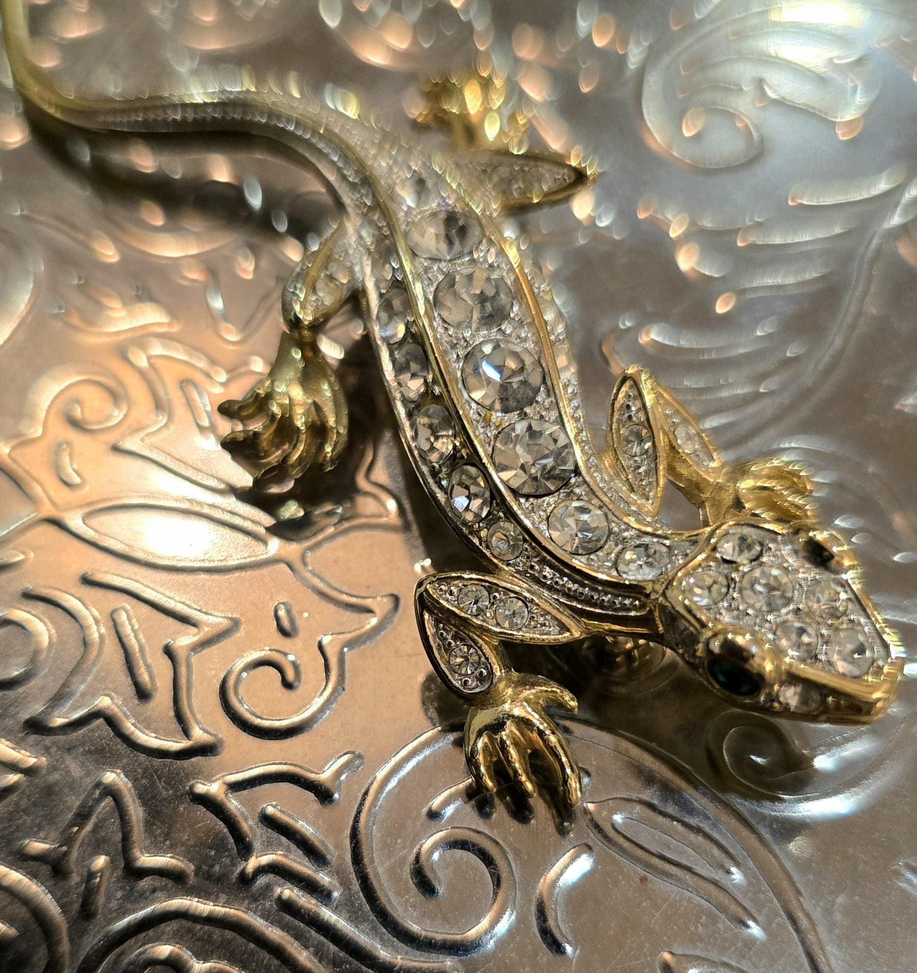 Vintage Gold Tone Lizard Brooch Rhinestone Gecko Pin | Sparkling Hollywood Glamour Statement Keepsake