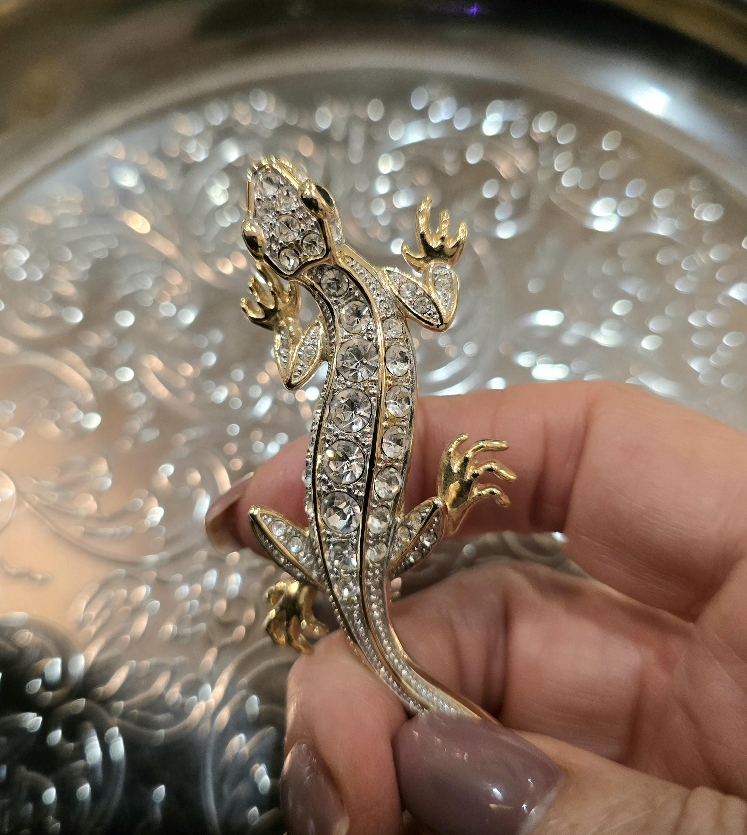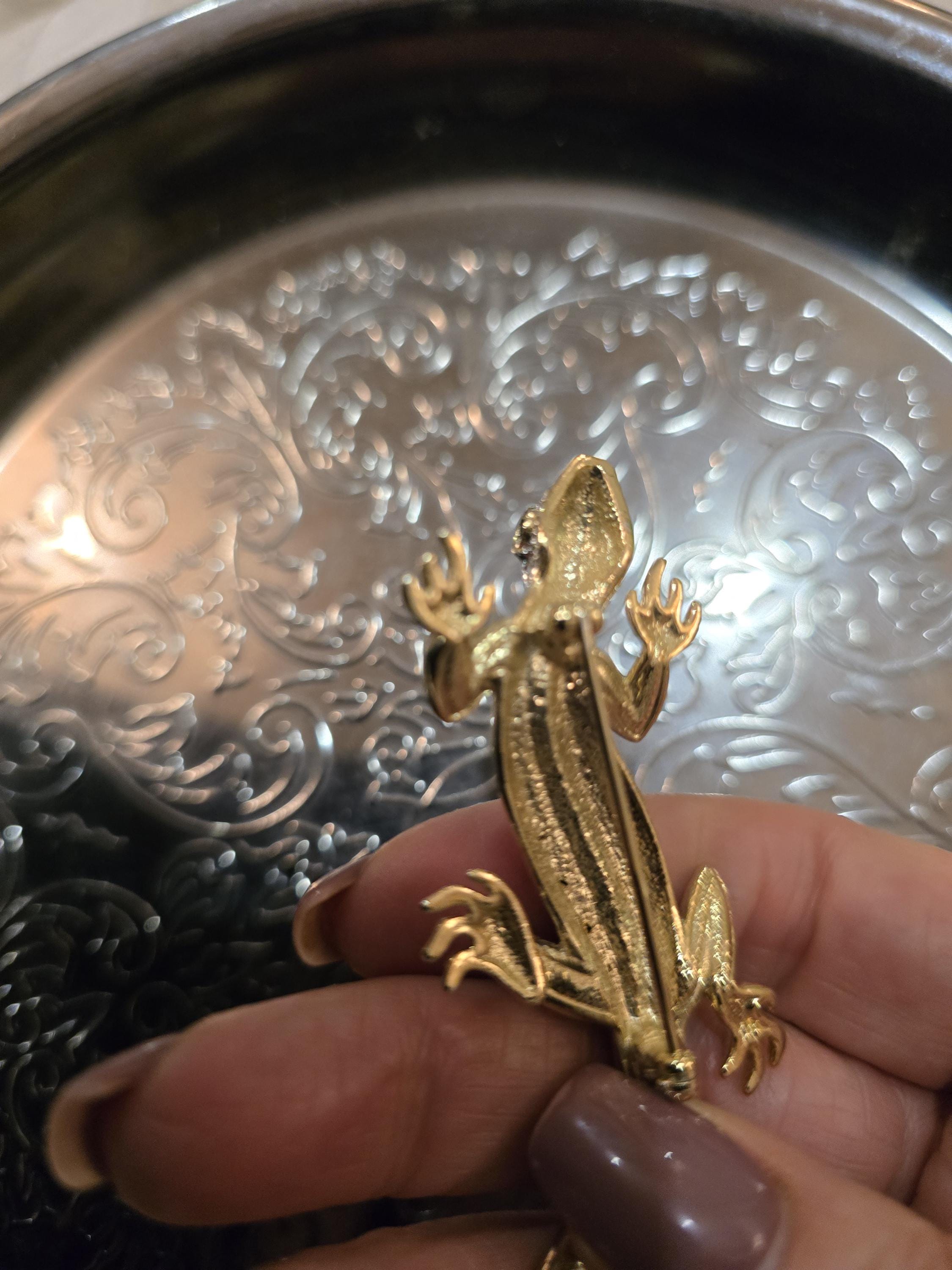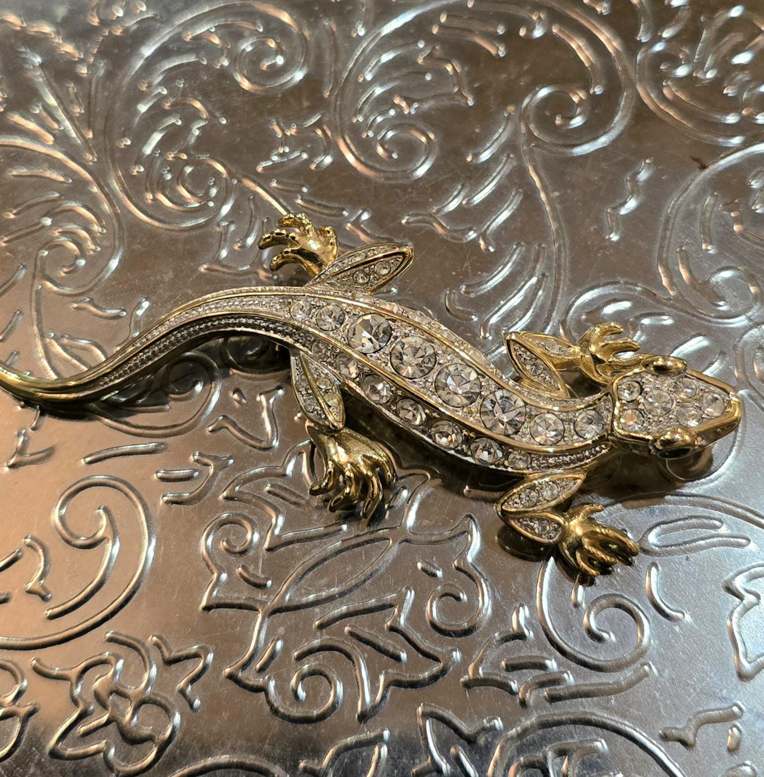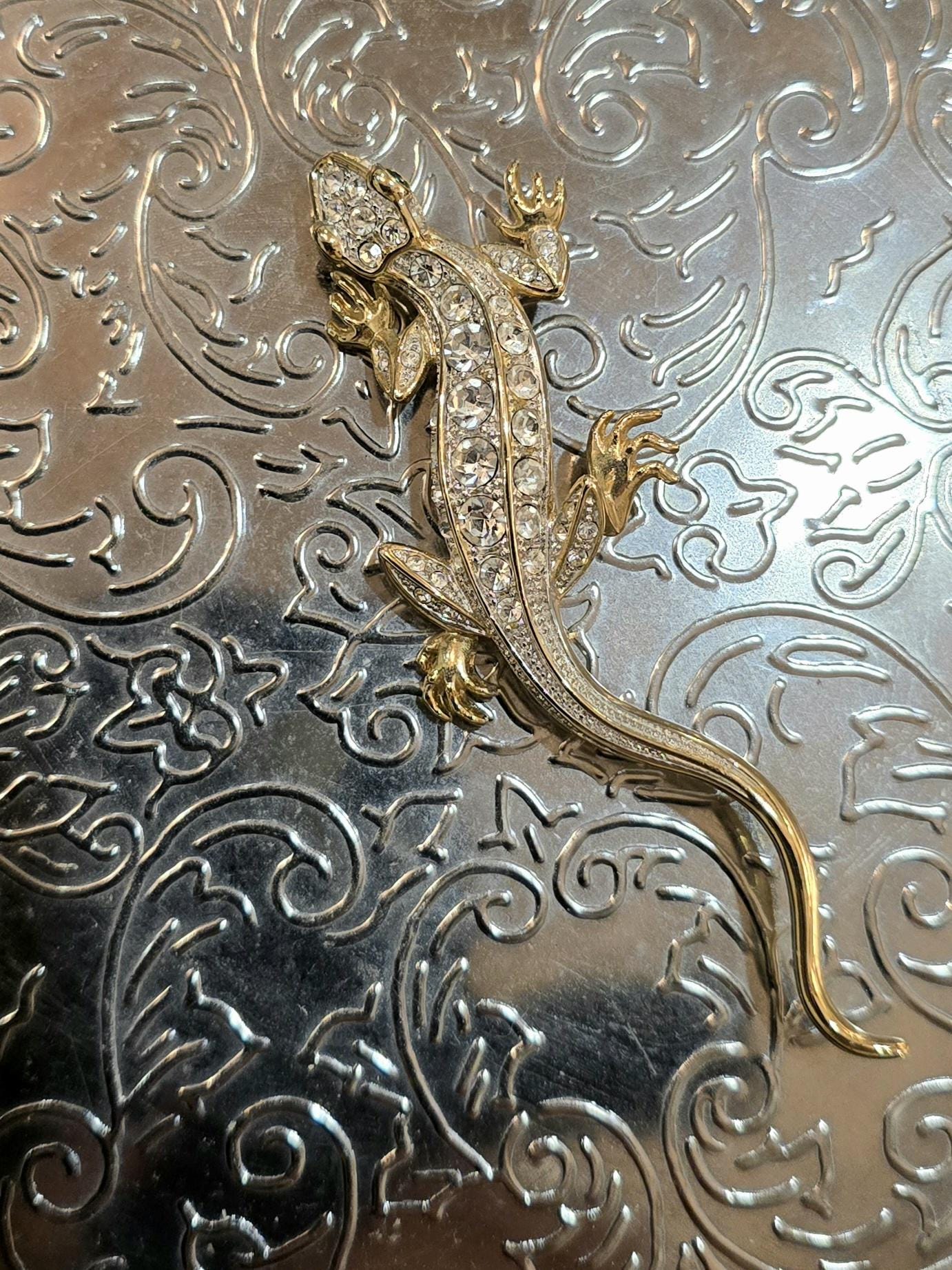 Vintage Gold Tone Lizard Brooch Rhinestone Gecko Pin | Sparkling Hollywood Glamour Statement Keepsake