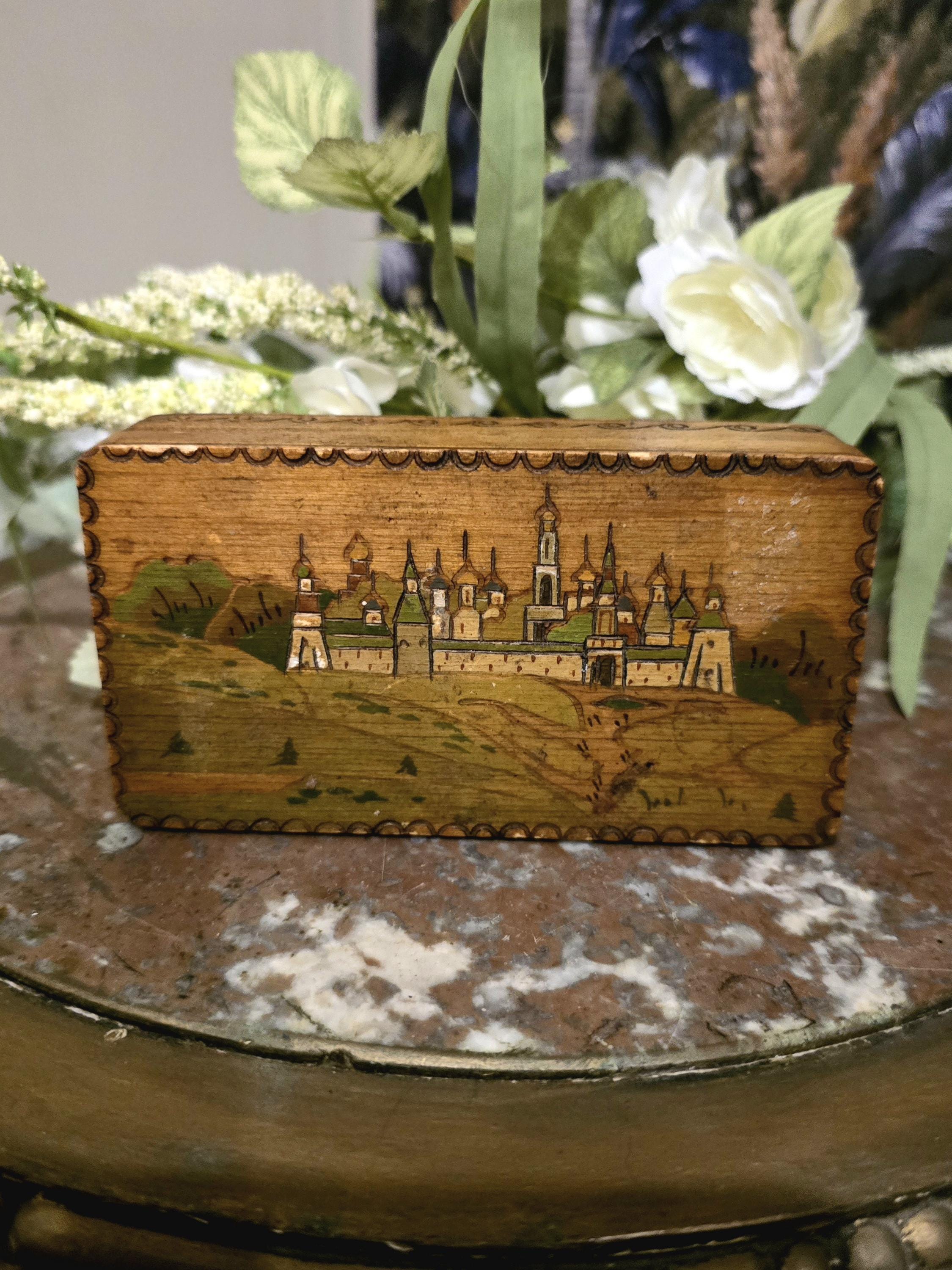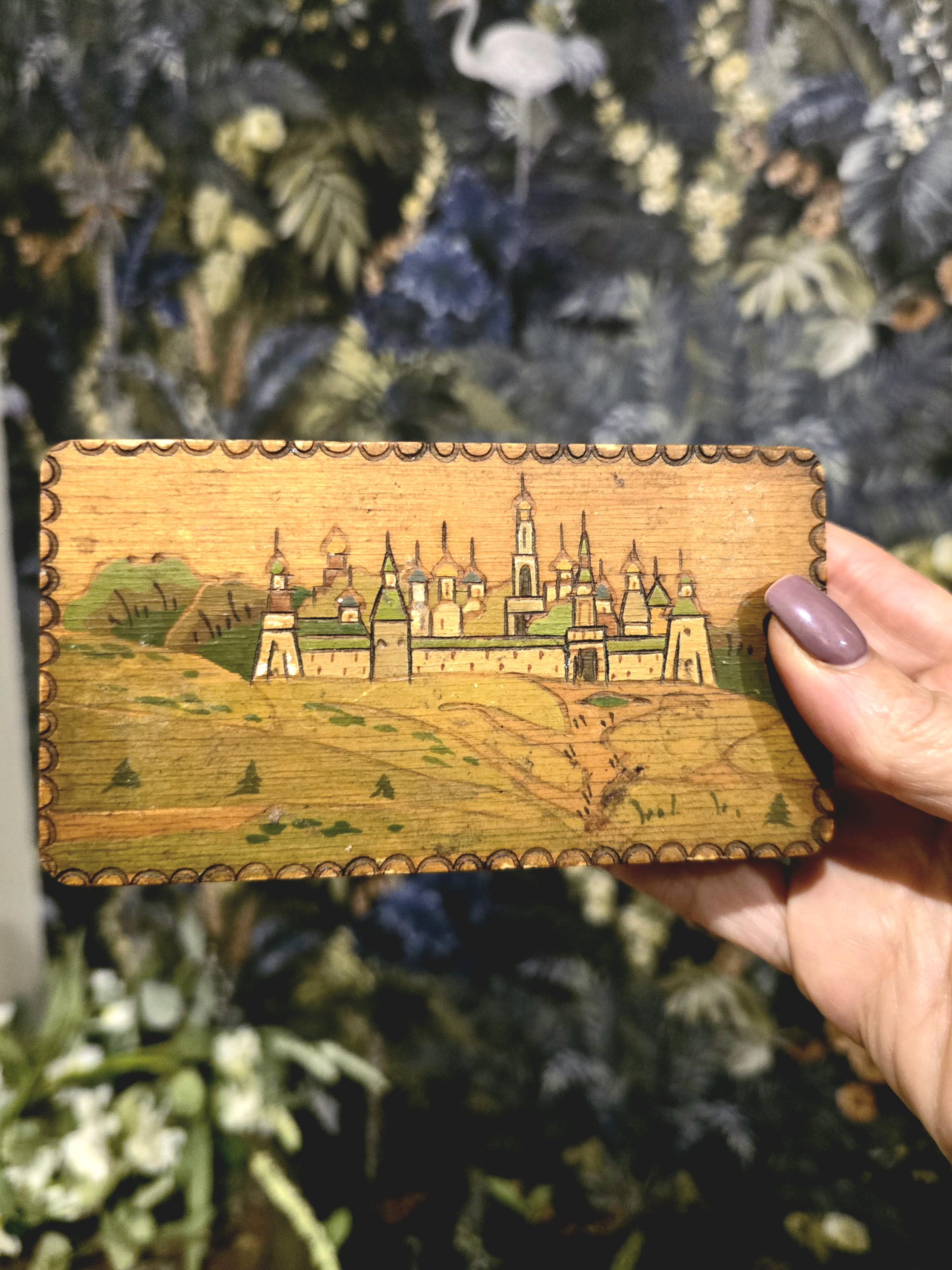 Vintage Russian Hand-Painted Wooden Box | Small Birch Bark Casket with Kremlin/Monastery Scene | Folk Art Keepsake Box | 5x3 inches