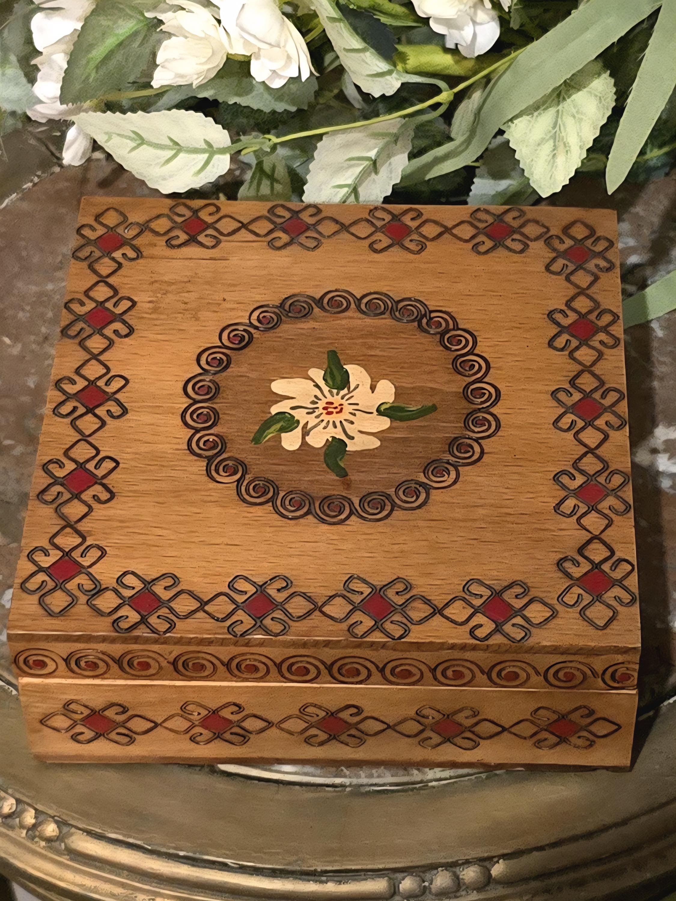 This is a beautiful vintage wooden trinket box with a rich, warm patina, perfect for adding a touch of rustic charm or folk art style to any room. It features exquisite hand-decorated detailing on the lid and sides.