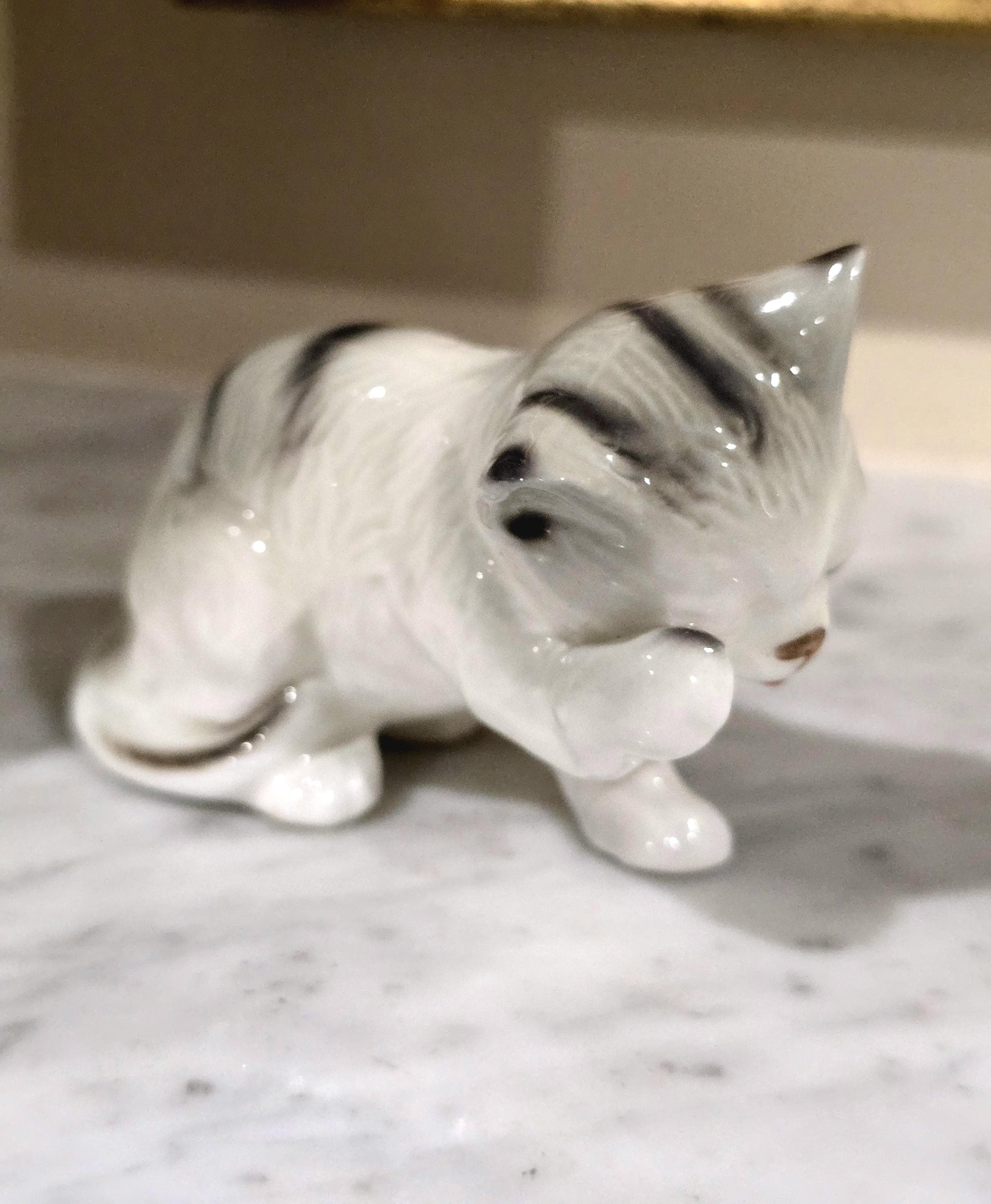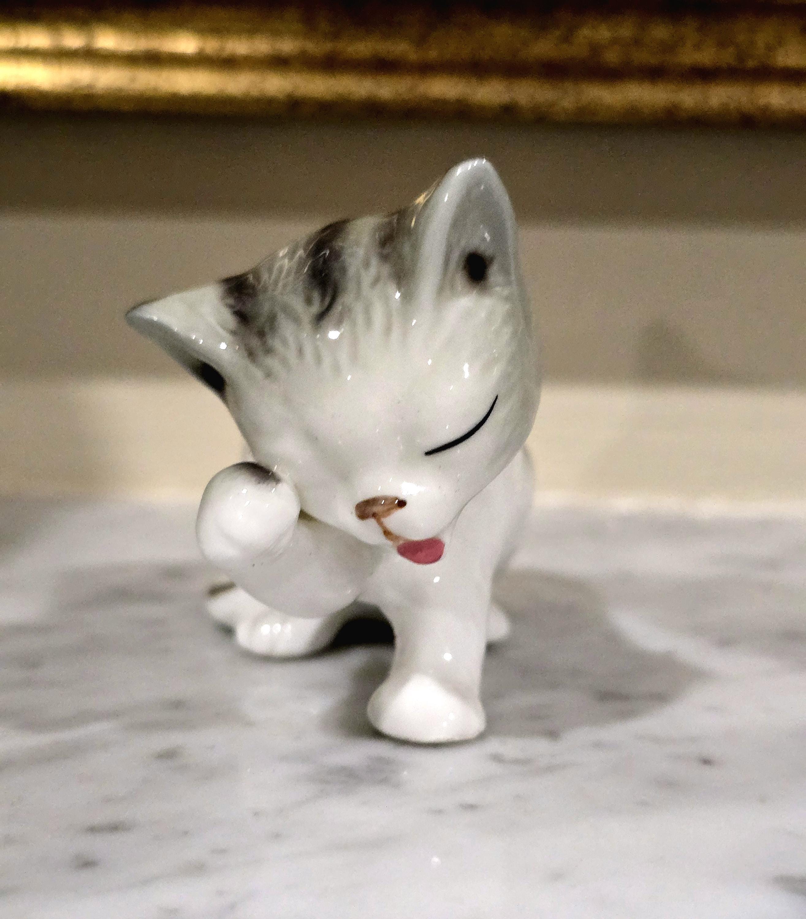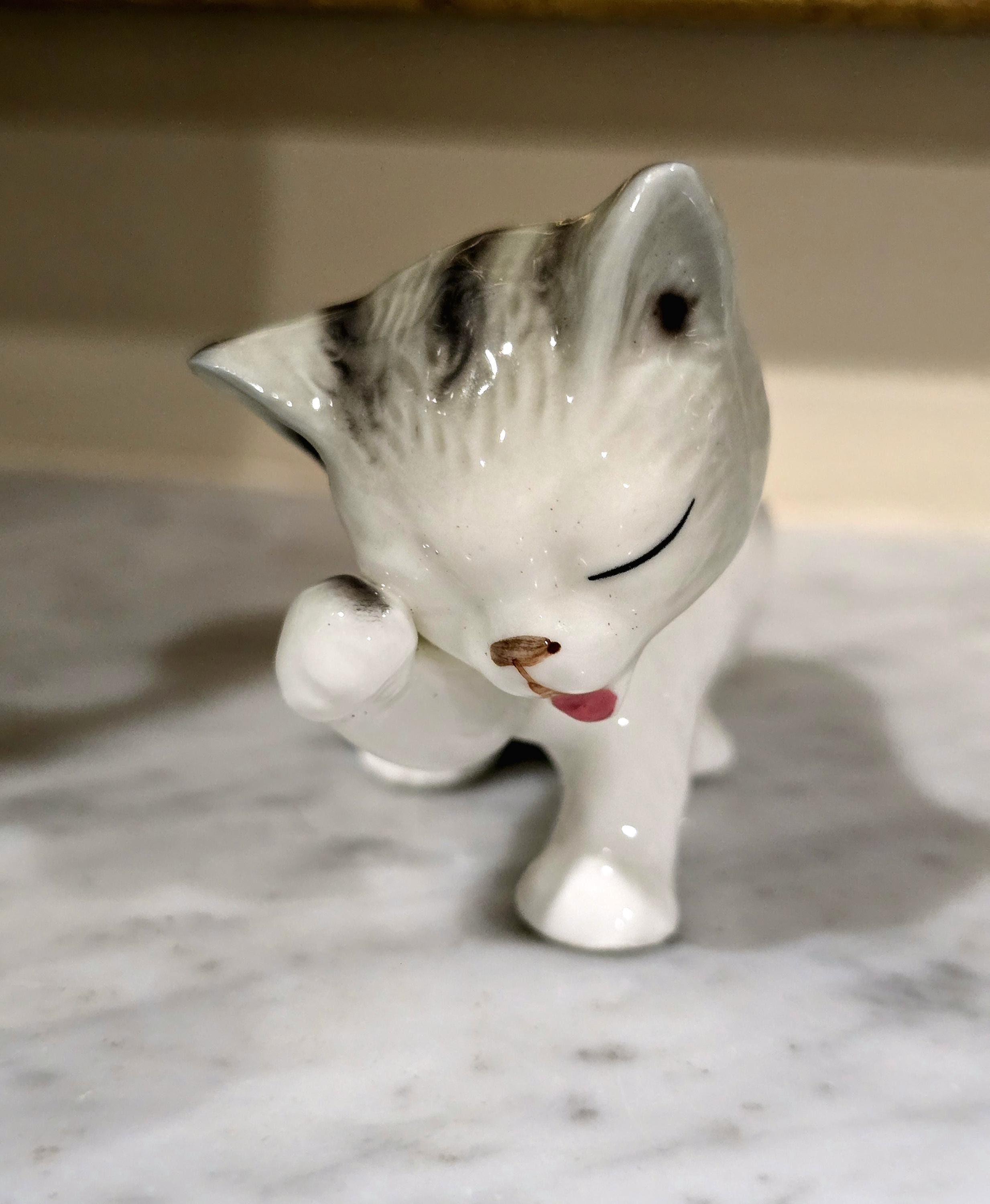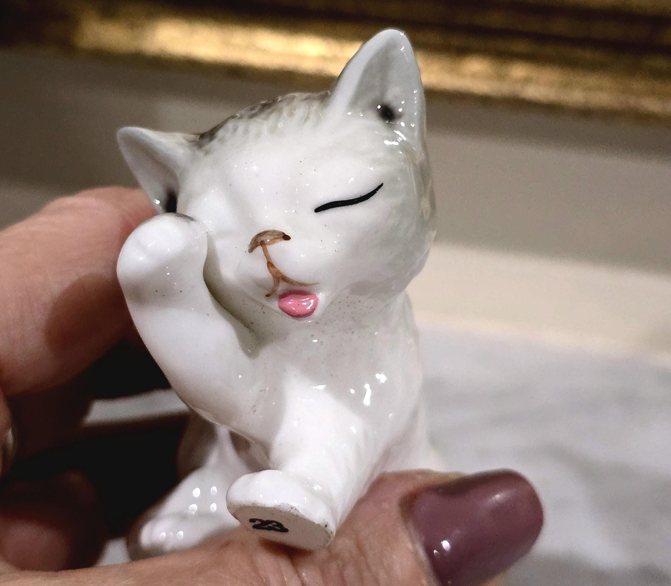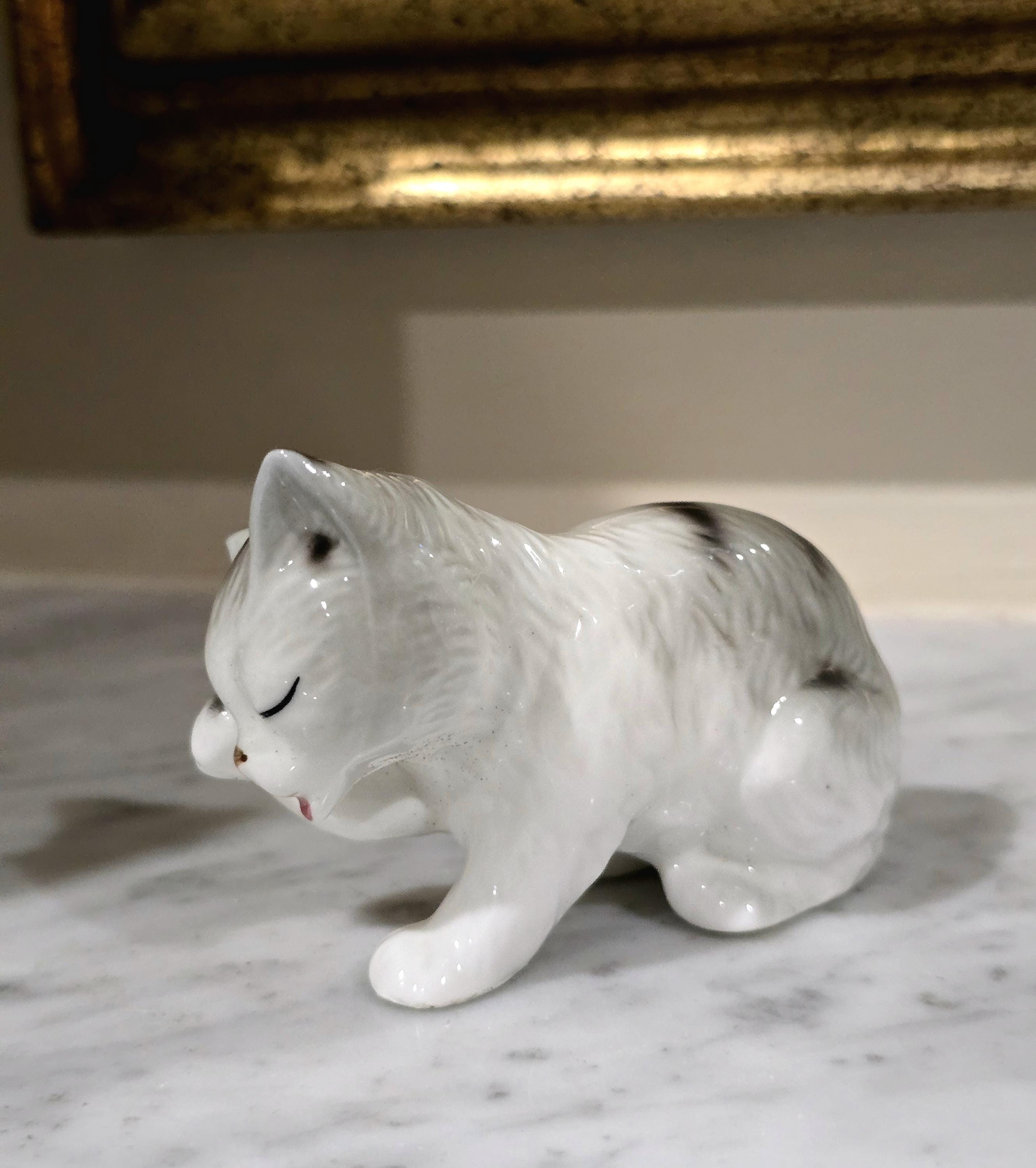 A whimsically kitsch 🐱 ceramic cat figurine captured mid-groom, with one paw raised to its face and tongue playfully out. Measuring approx. 3 inches (7.5 cm) in length, this expressive little companion brings charm, character, and sanctuary sweetness to any shelf or windowsill.