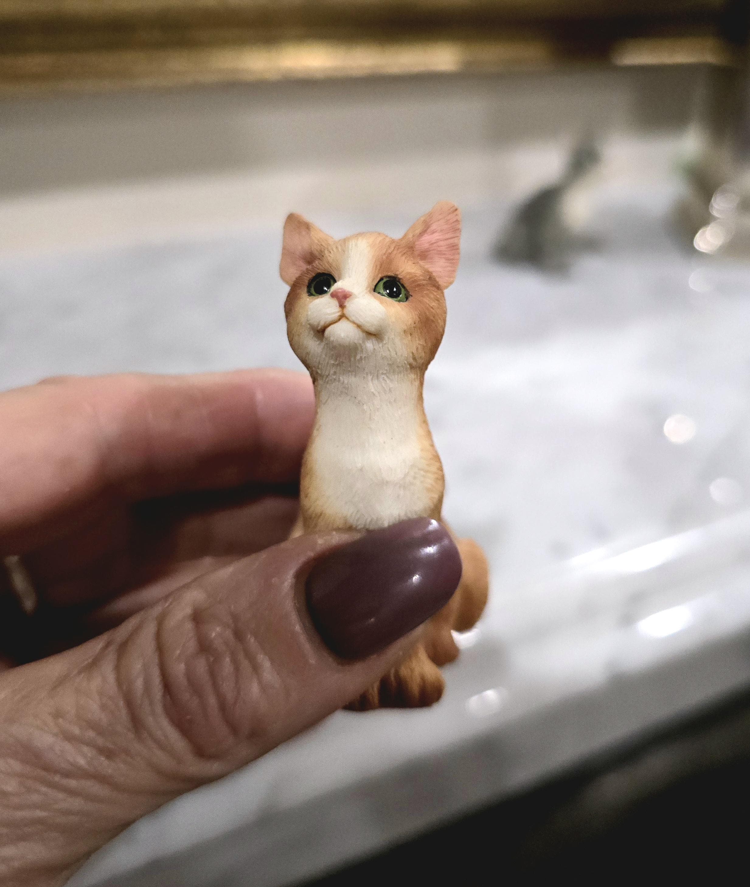 A lifelike resin cat duo 🐱🐱 featuring one grey-and-white and one ginger-and-white feline, each sitting upright with expressive green eyes. Measuring approx. 3 inches (7.5 cm) tall, these detailed companions bring quiet charm and collector-worthy realism to any shelf or sanctuary.