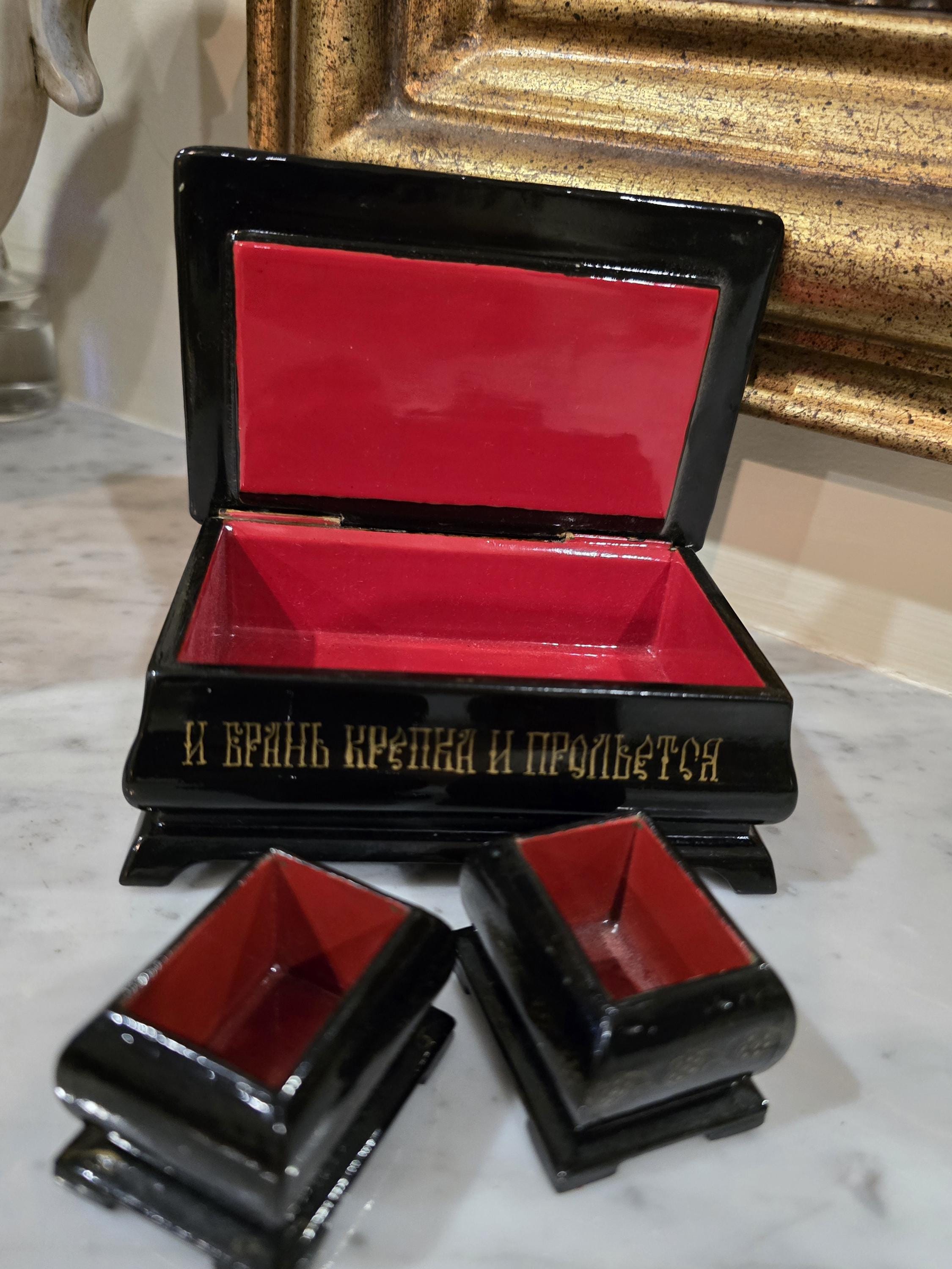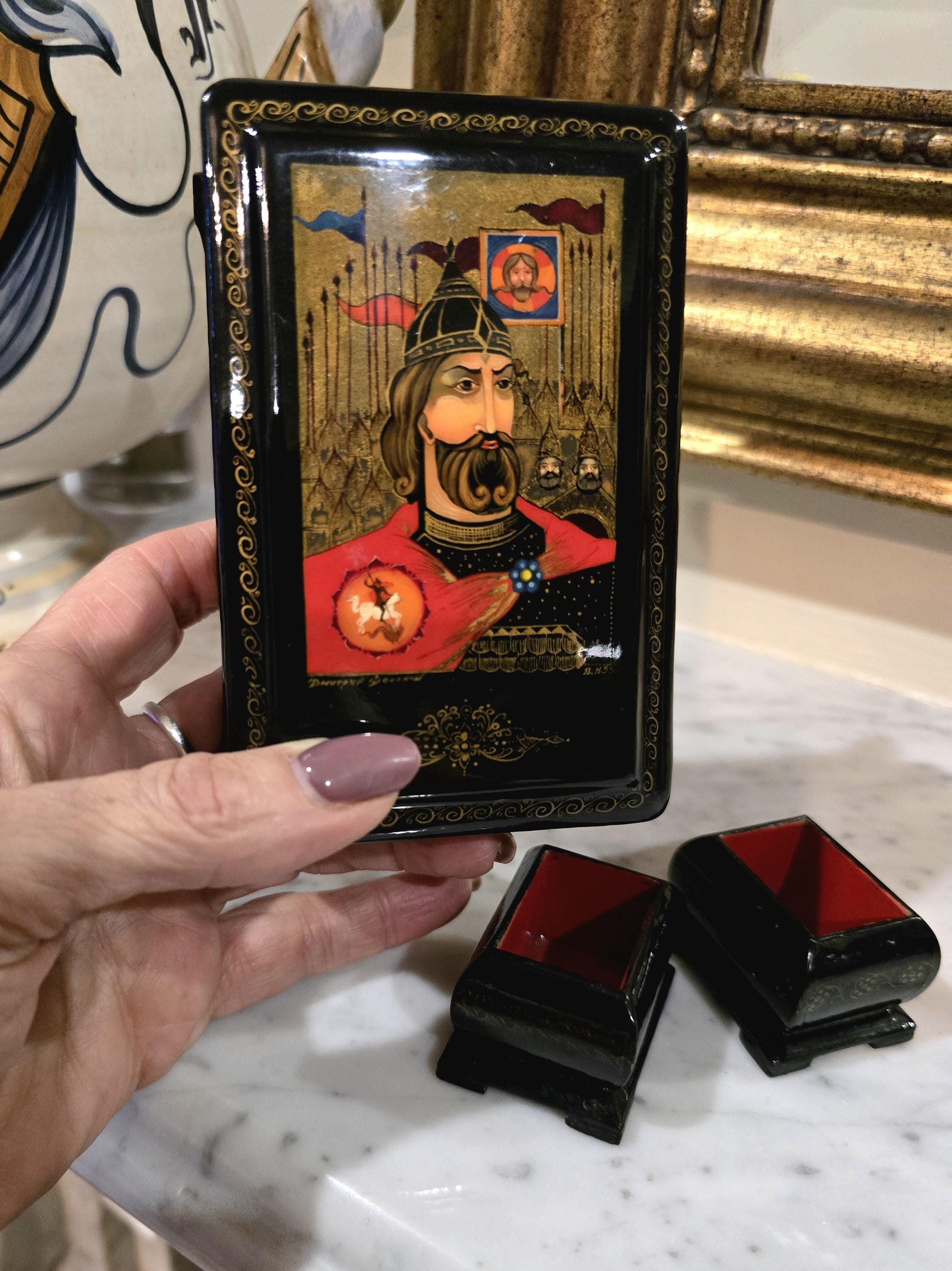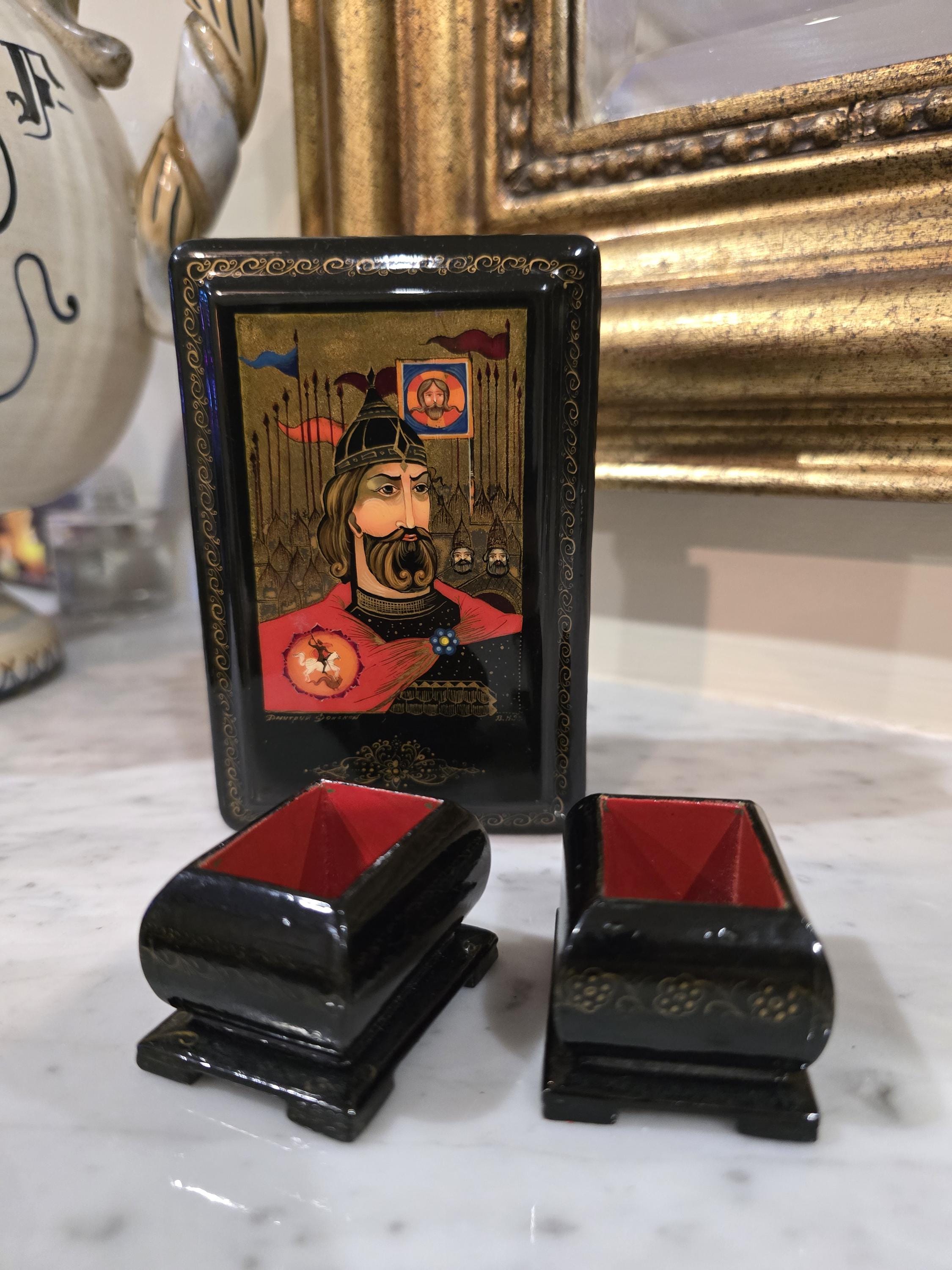 A striking Russian lacquered wooden box paired with two matching open salt cellars, each lined in vivid red. The box is adorned with a hand-painted warrior in ornate armour, flanked by soldiers and crowned by a saintly icon.