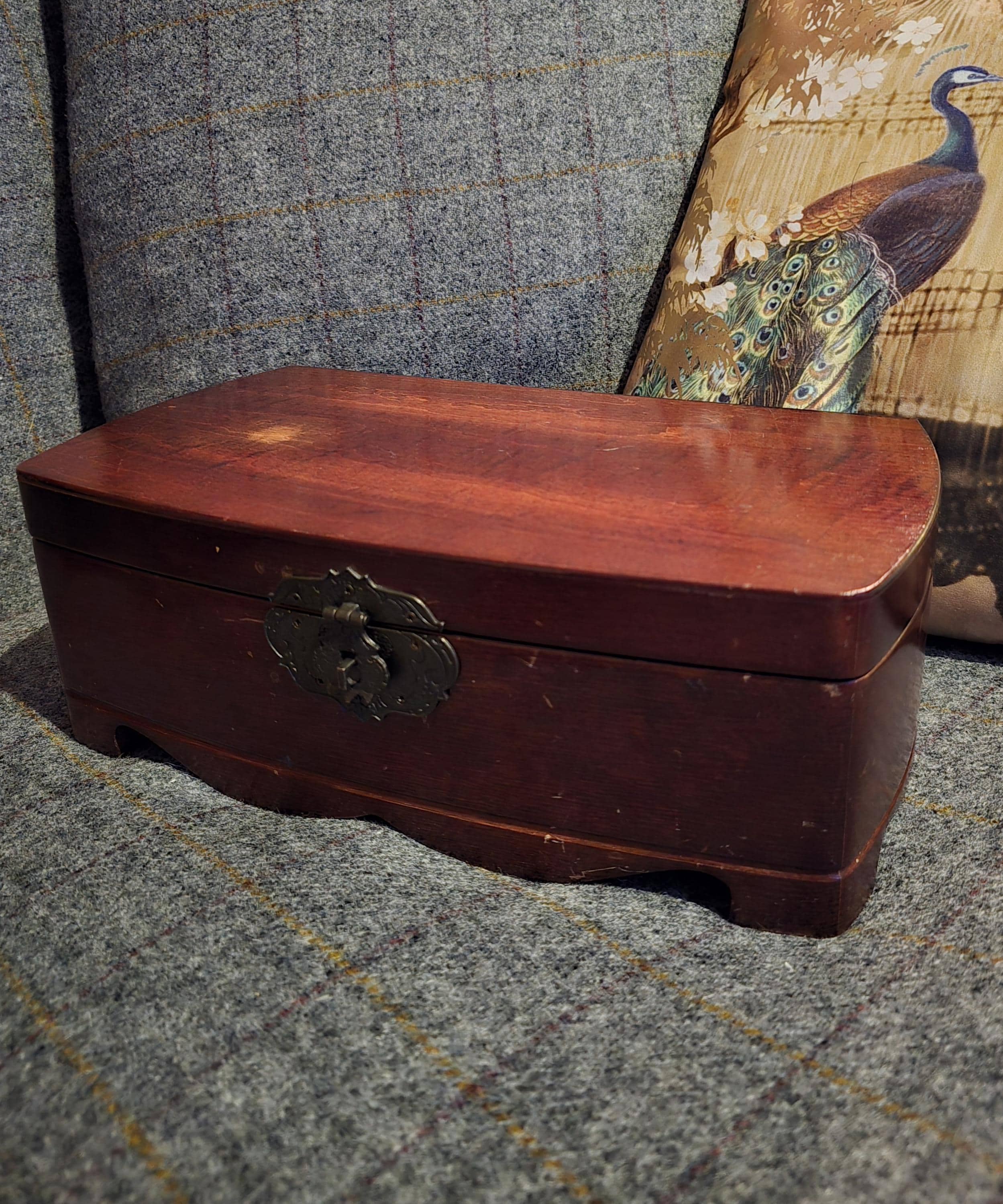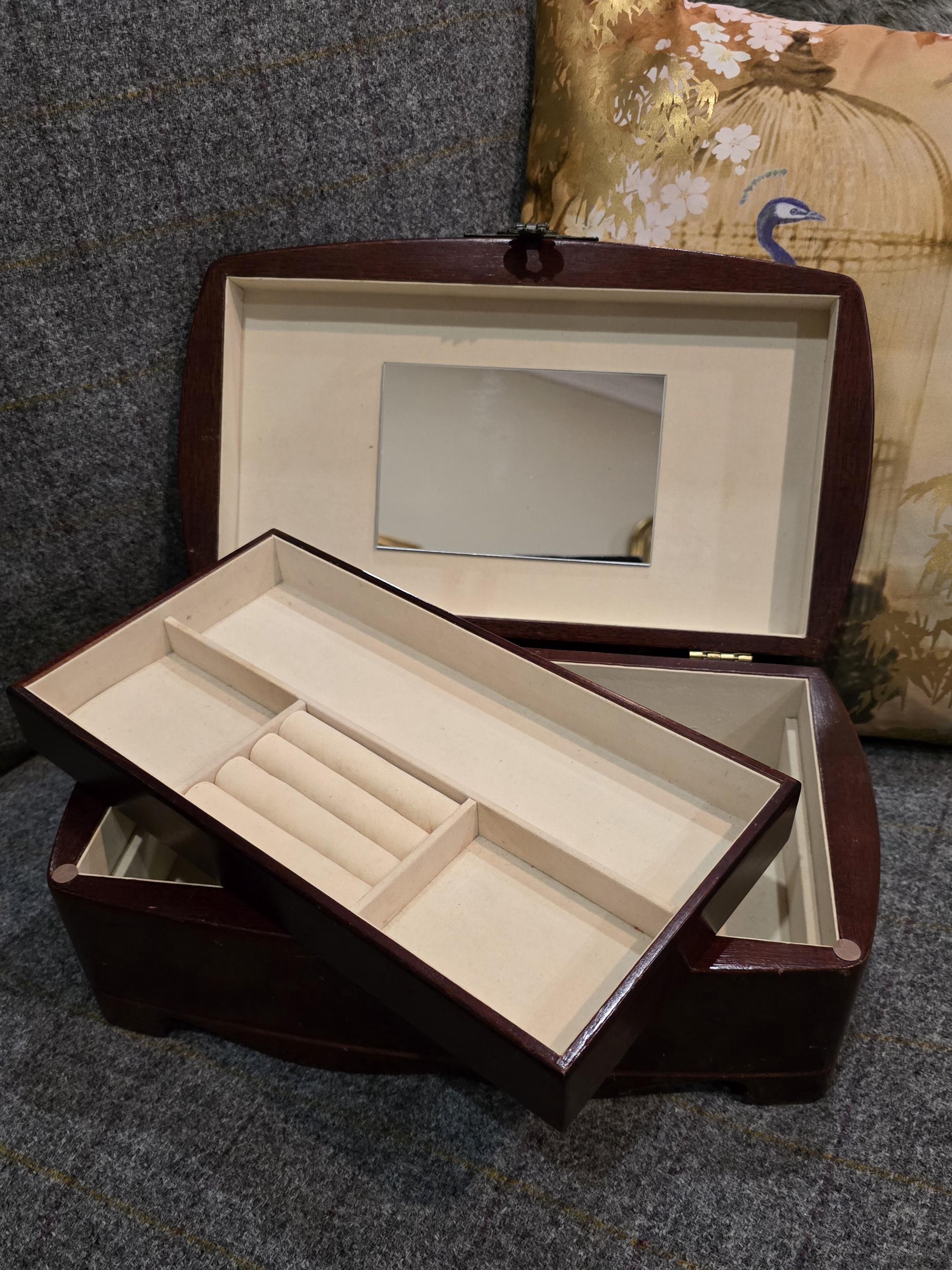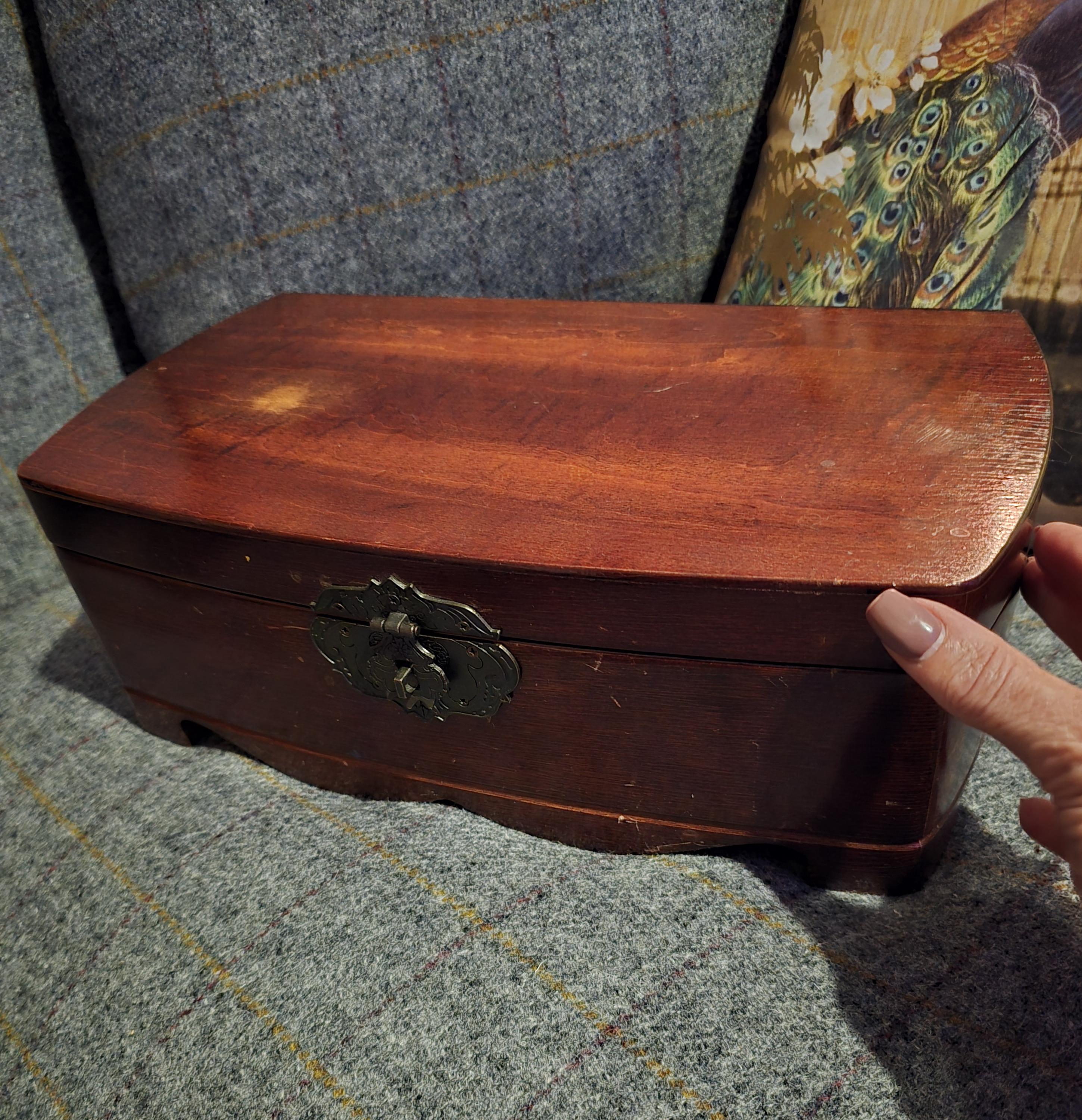 ​This is a true vintage piece, perfect for the collector who appreciates rustic charm or enjoys a good restoration project! This large wooden jewellery box has a beautiful, classic curved shape and offers substantial storage for your treasures.