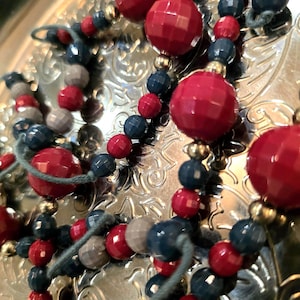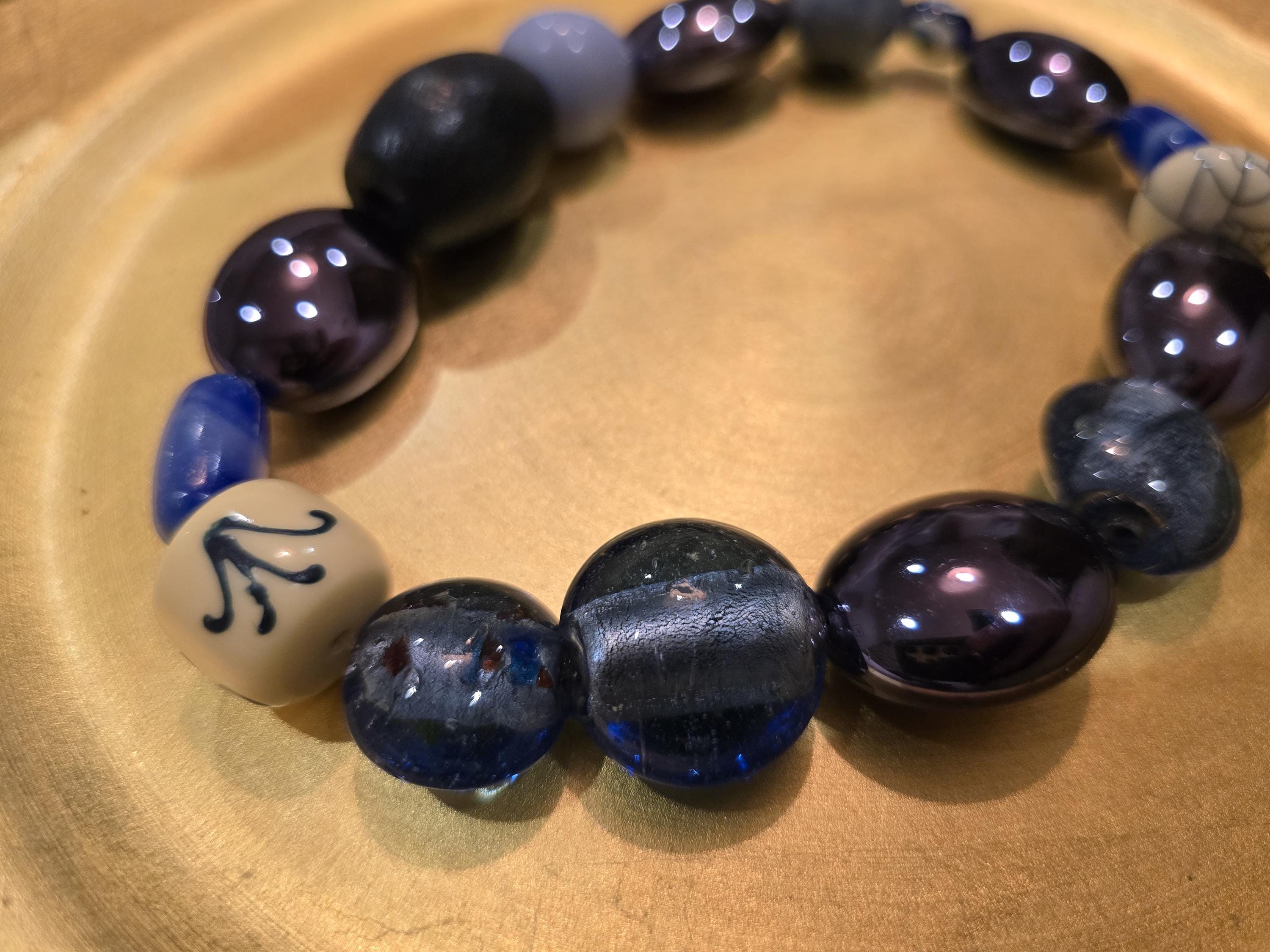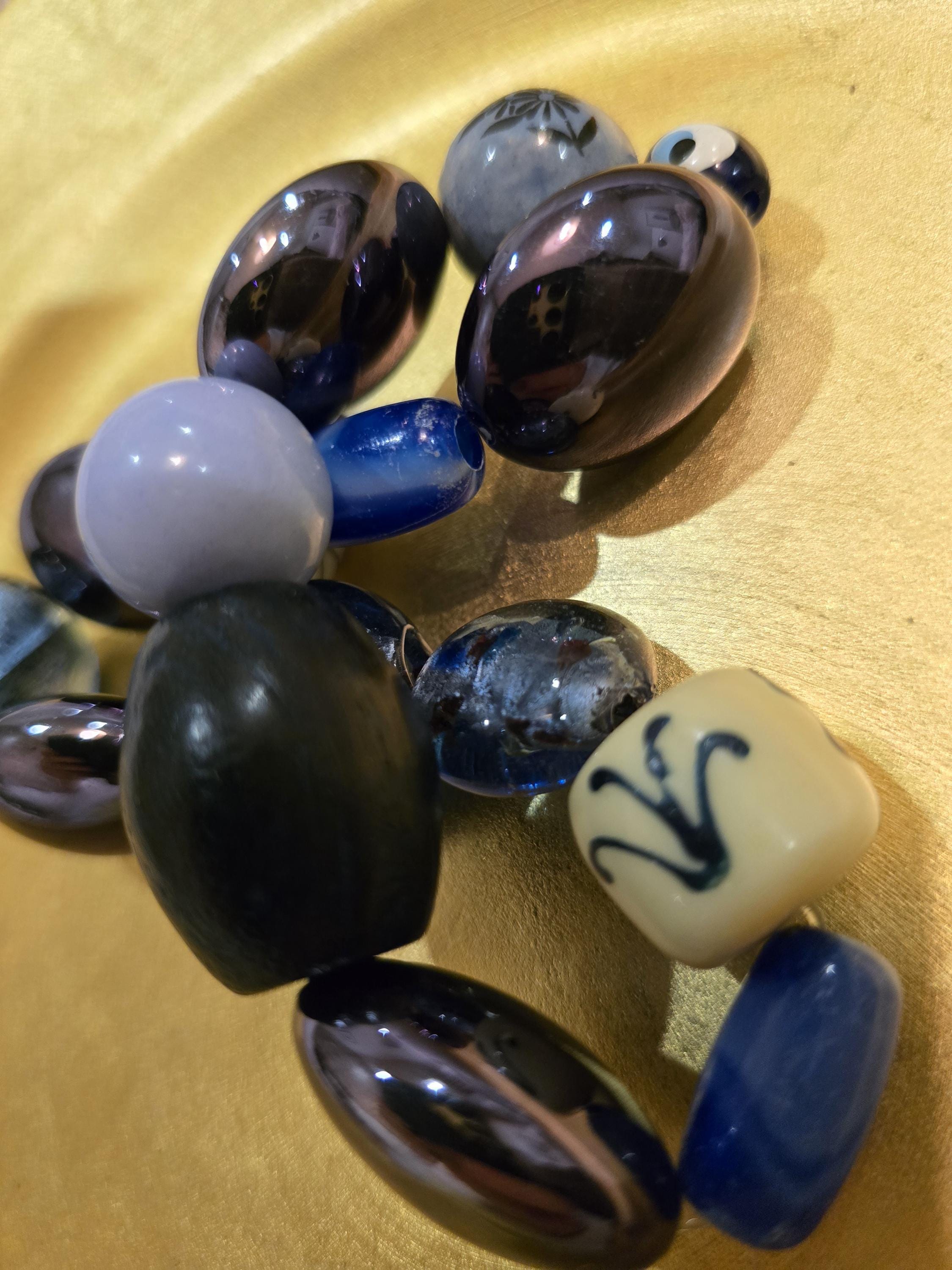 ​Eclectic Materials: Features a unique mix of metallic Navy Resin ovals, smooth Ceramic beads, and contrasting dark Wood pieces. 💙🌳