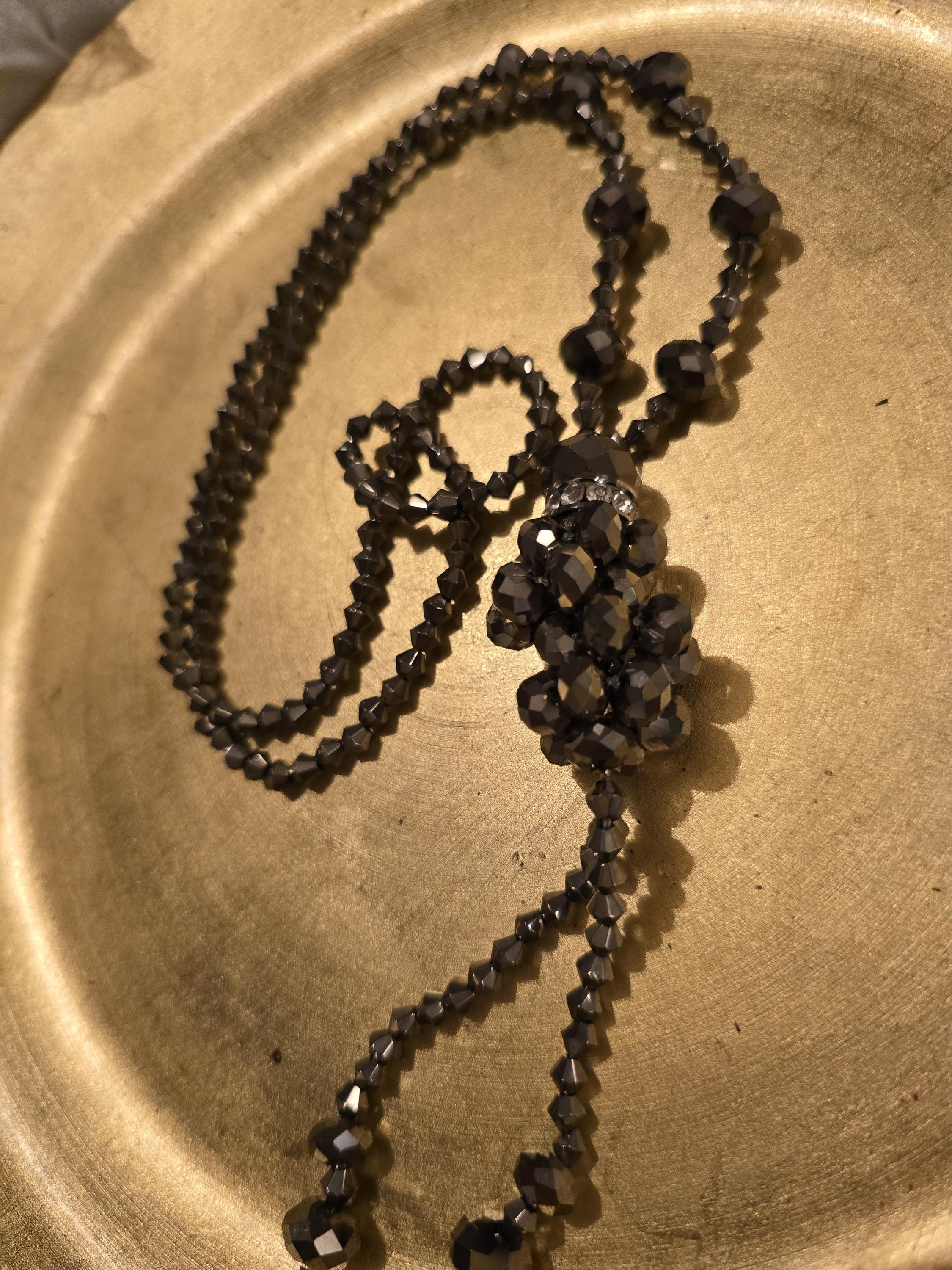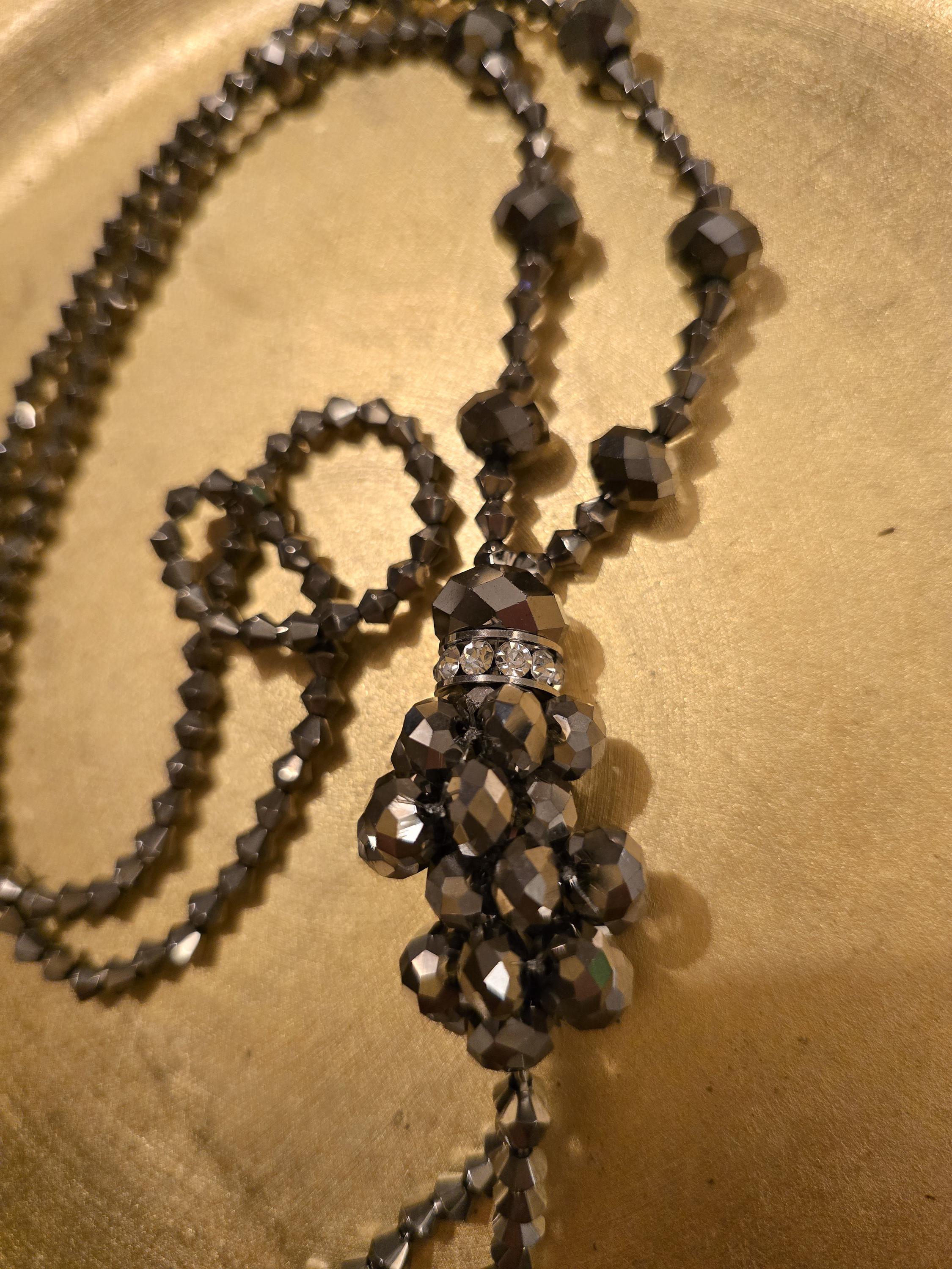 A shimmer of pewter and shadow — this 26-inch necklace weaves faceted beads in a deep metallic pewter tone into a symmetrical strand, anchored by a central cluster of larger beads and rhinestone accents. Two tassel strands drop from the cluster, each ending in a single bead like punctuation. It’s a piece that feels like midnight glamour — bold, balanced, and quietly dazzling.