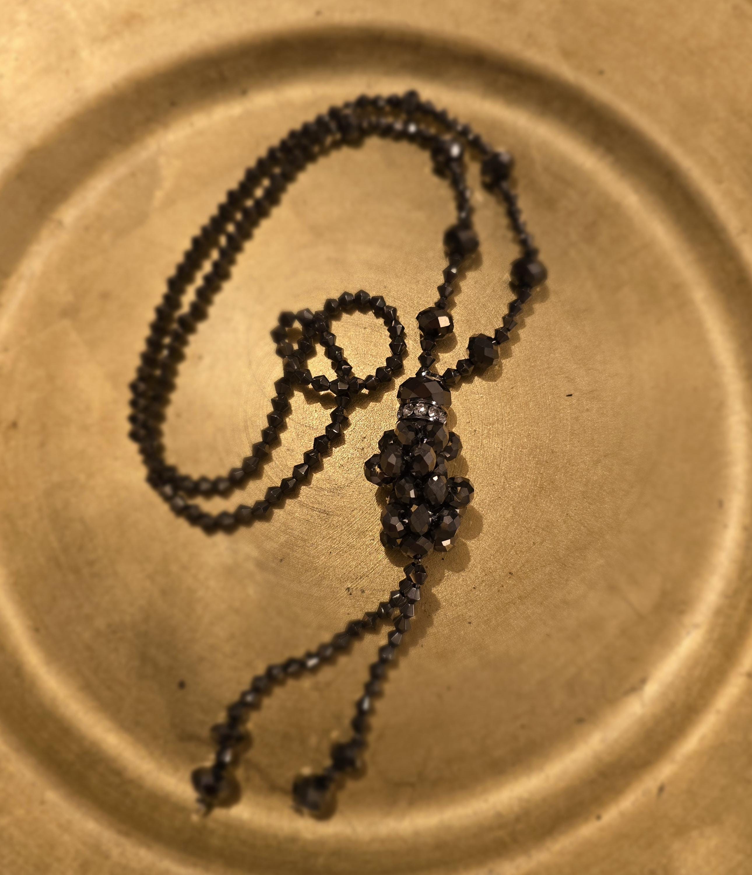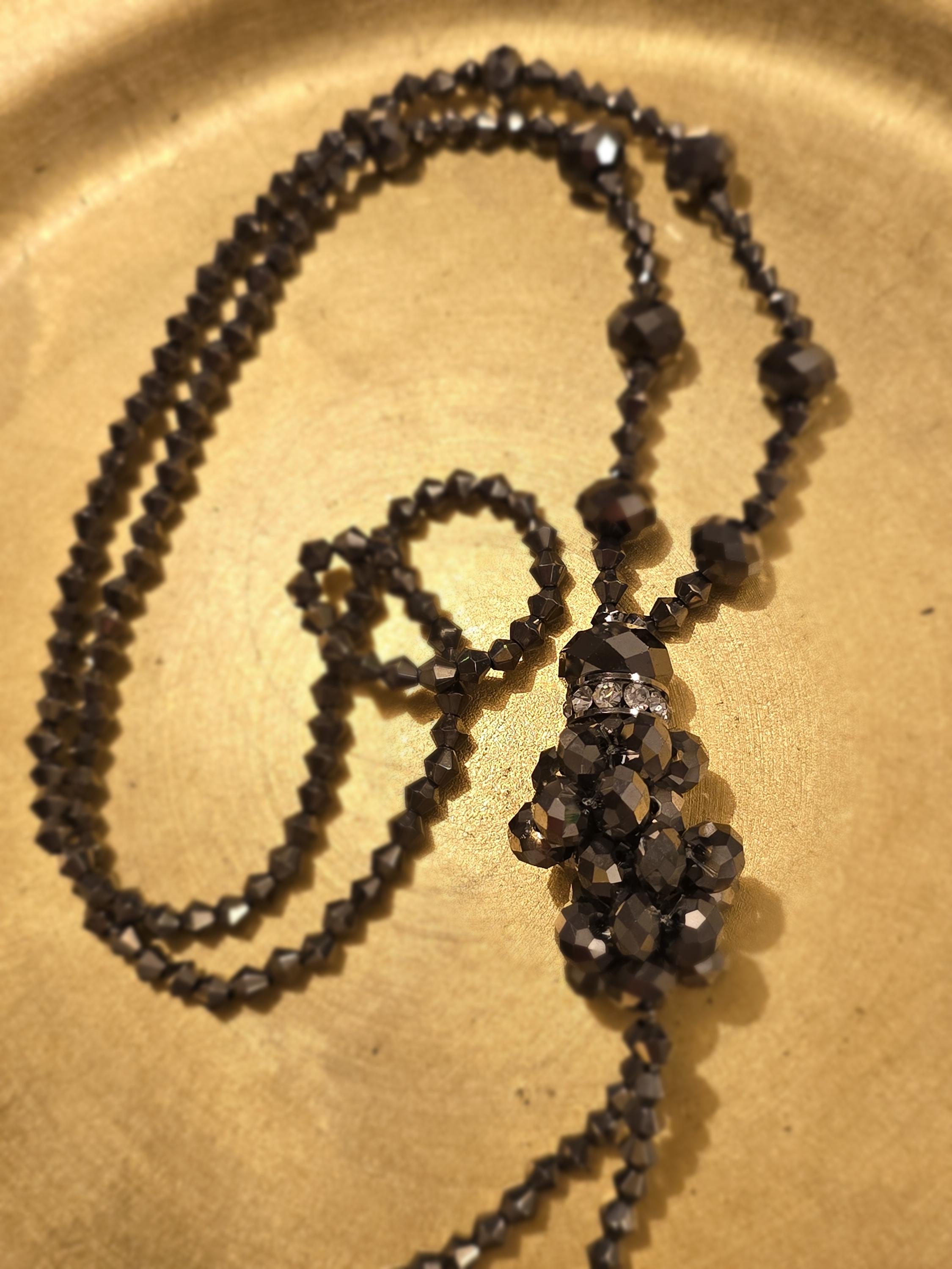 Pewter Bead & Rhinestone Cluster Y Necklace with Tassel Drop |Vintage Dressing | Deco Style Glamour