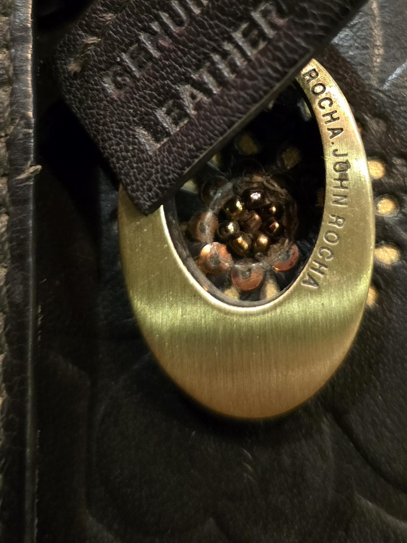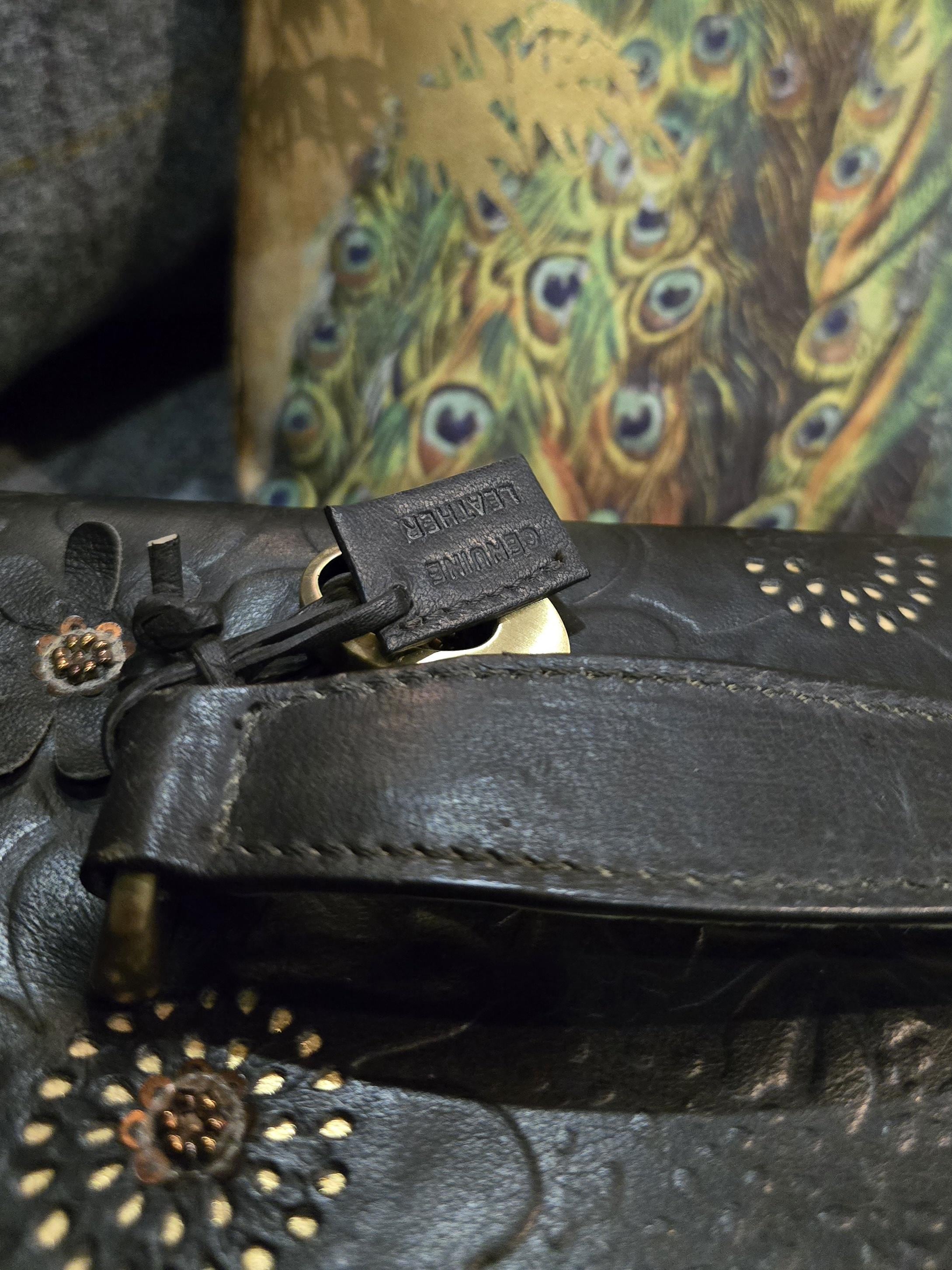 ​The exterior is crafted from a rich, dark brown genuine leather featuring a beautiful, all-over embossed floral pattern. The striking design is accented with small gold-toned studs in the center of the flowers, adding a touch of vintage glamour. 🌼