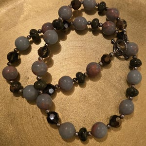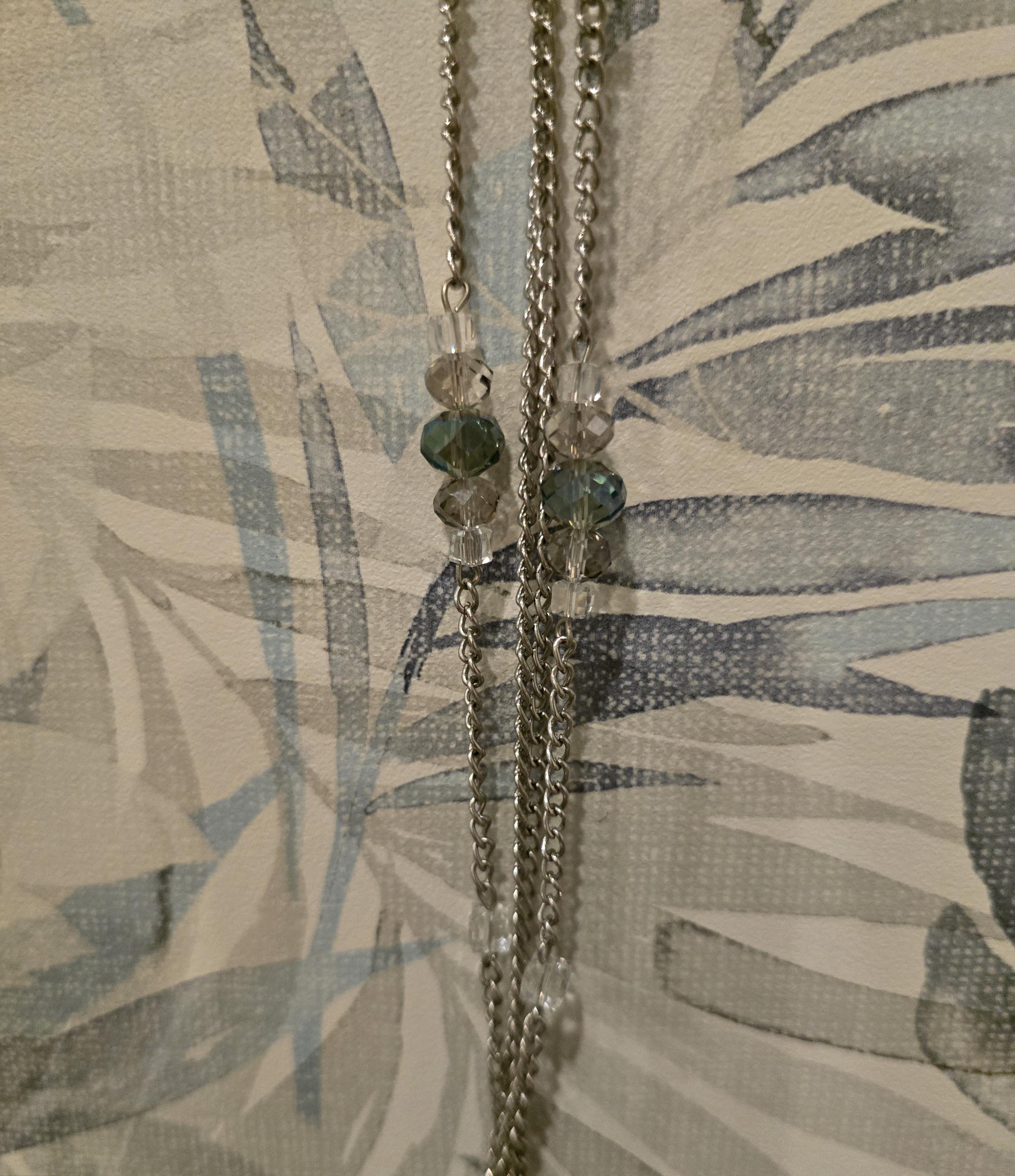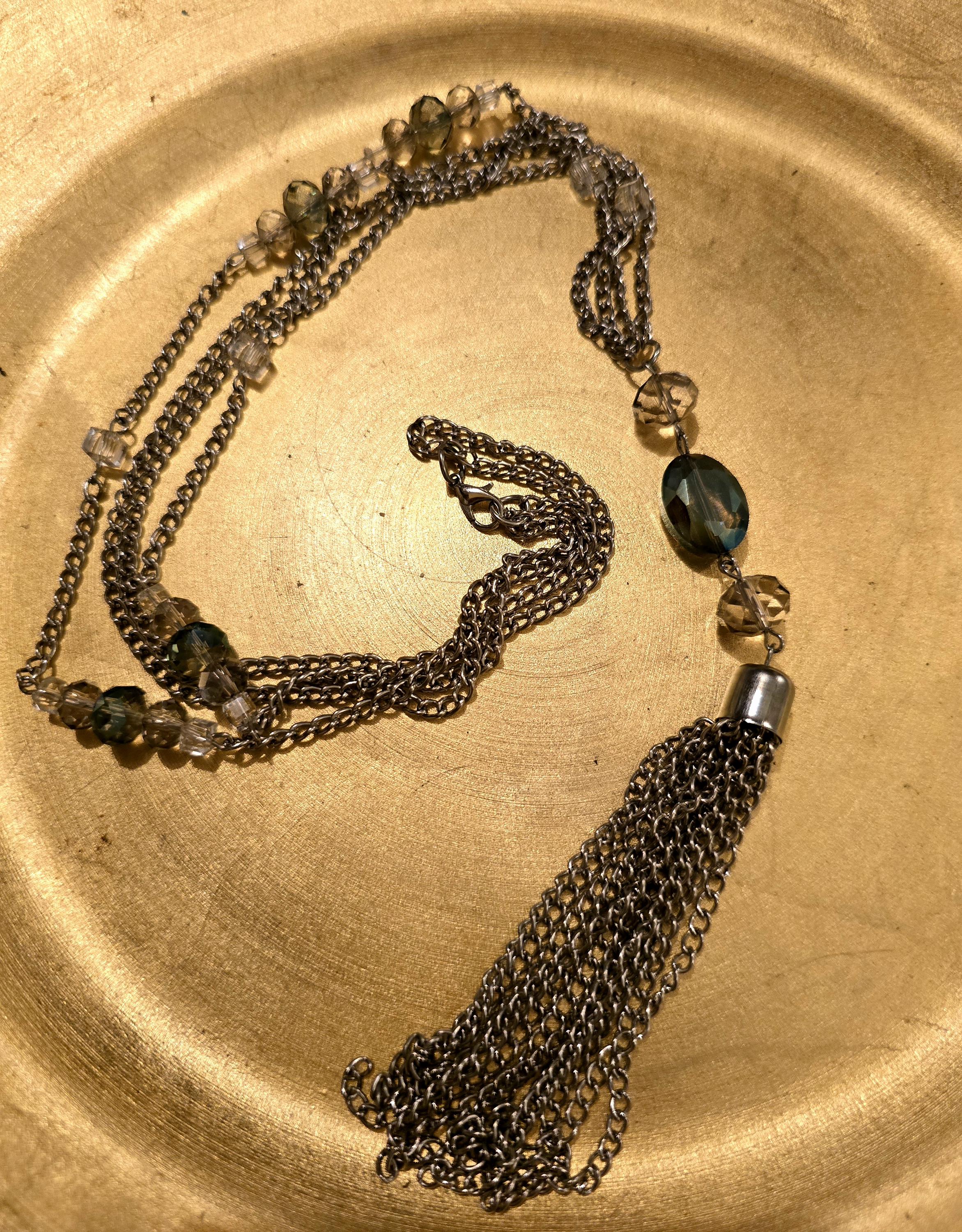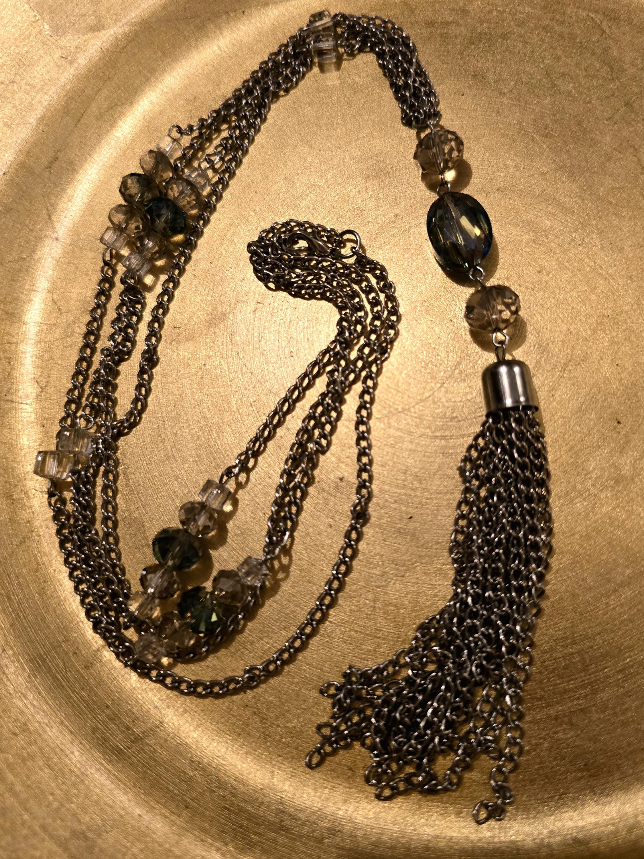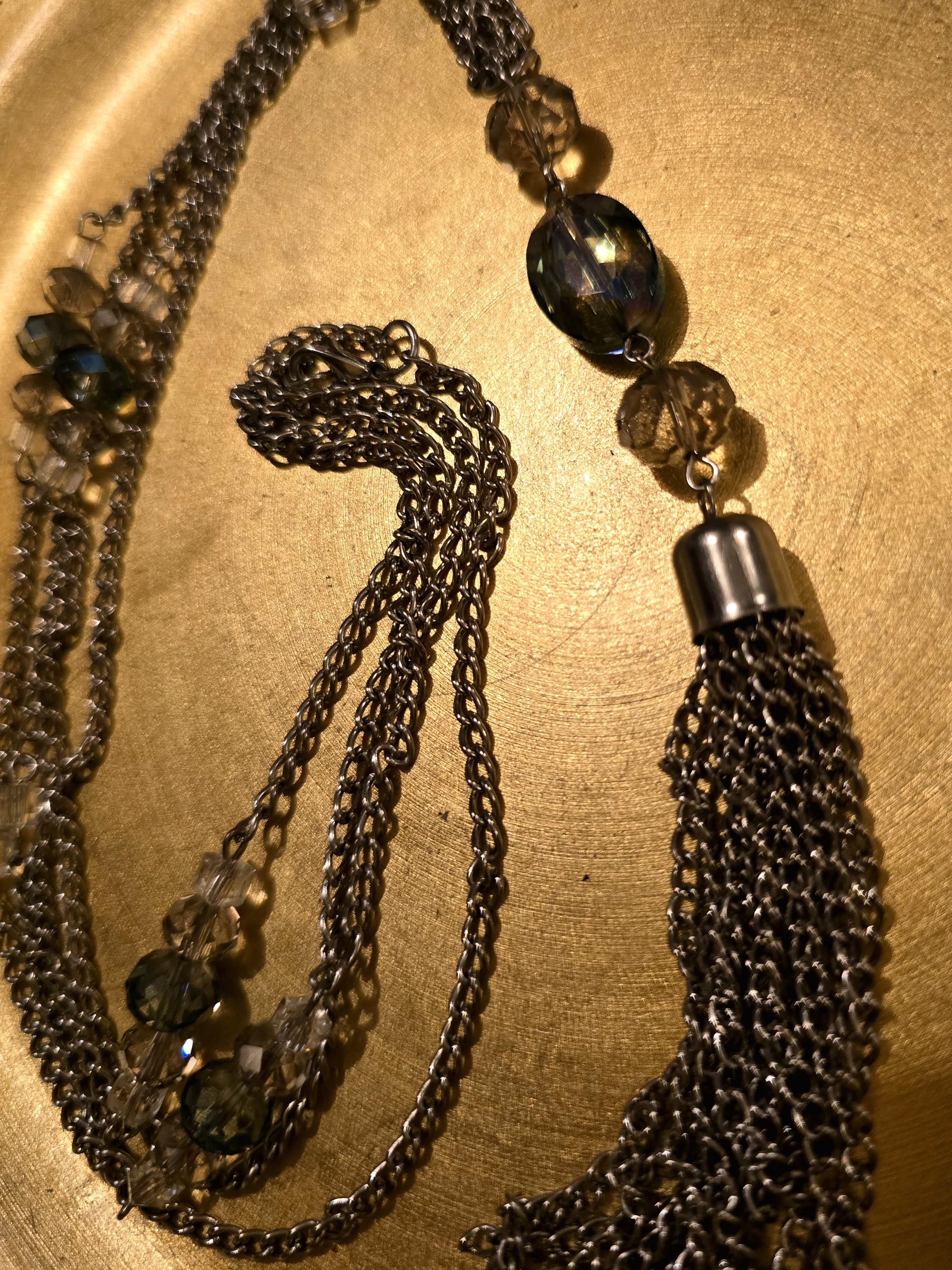 A shimmer of silver and sky — this necklace weaves substantial silver-toned chains with faceted blue and clear glass beads, ending in a tassel that moves like twilight. The central oval bead anchors the piece with mid‑century drama, flanked by translucent accents that catch the light beautifully. Its weight, materials, and construction place it firmly in the 1960s costume jewellery tradition — elegant, elemental, and made to last.