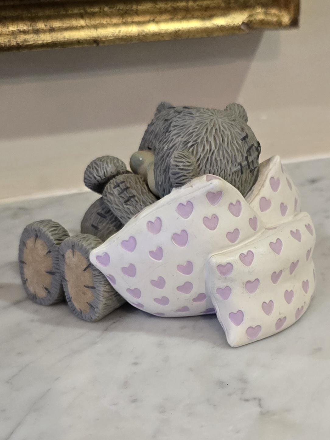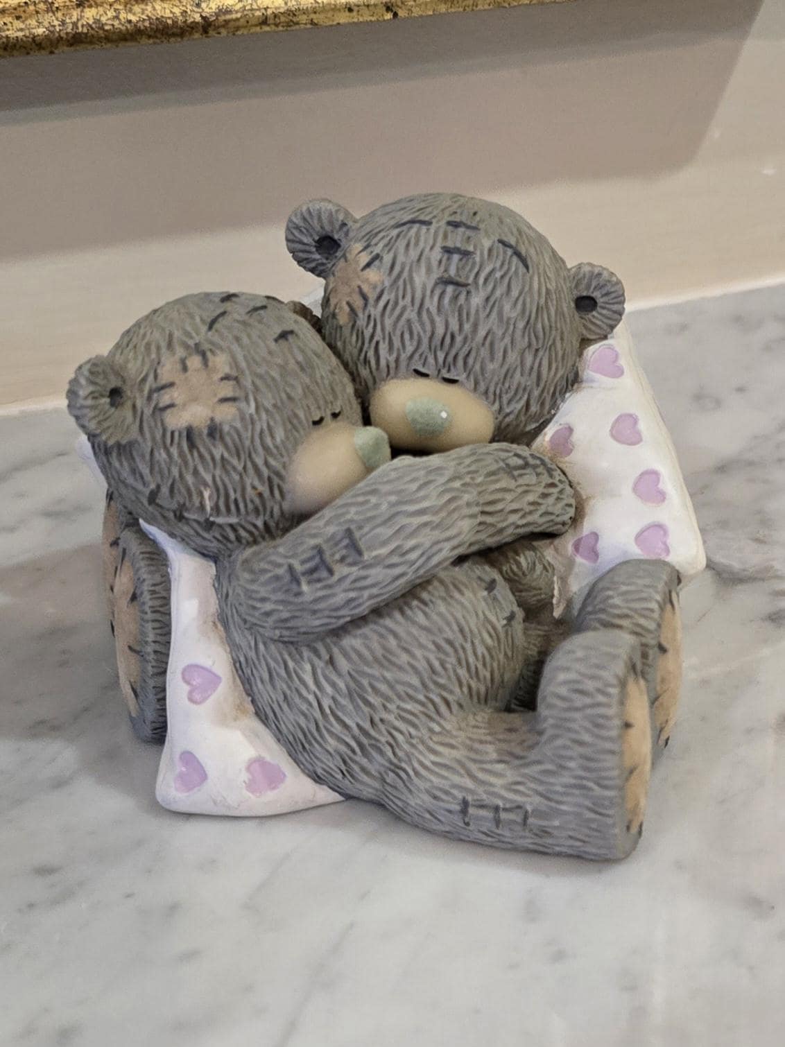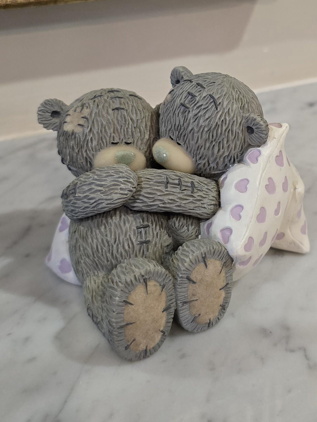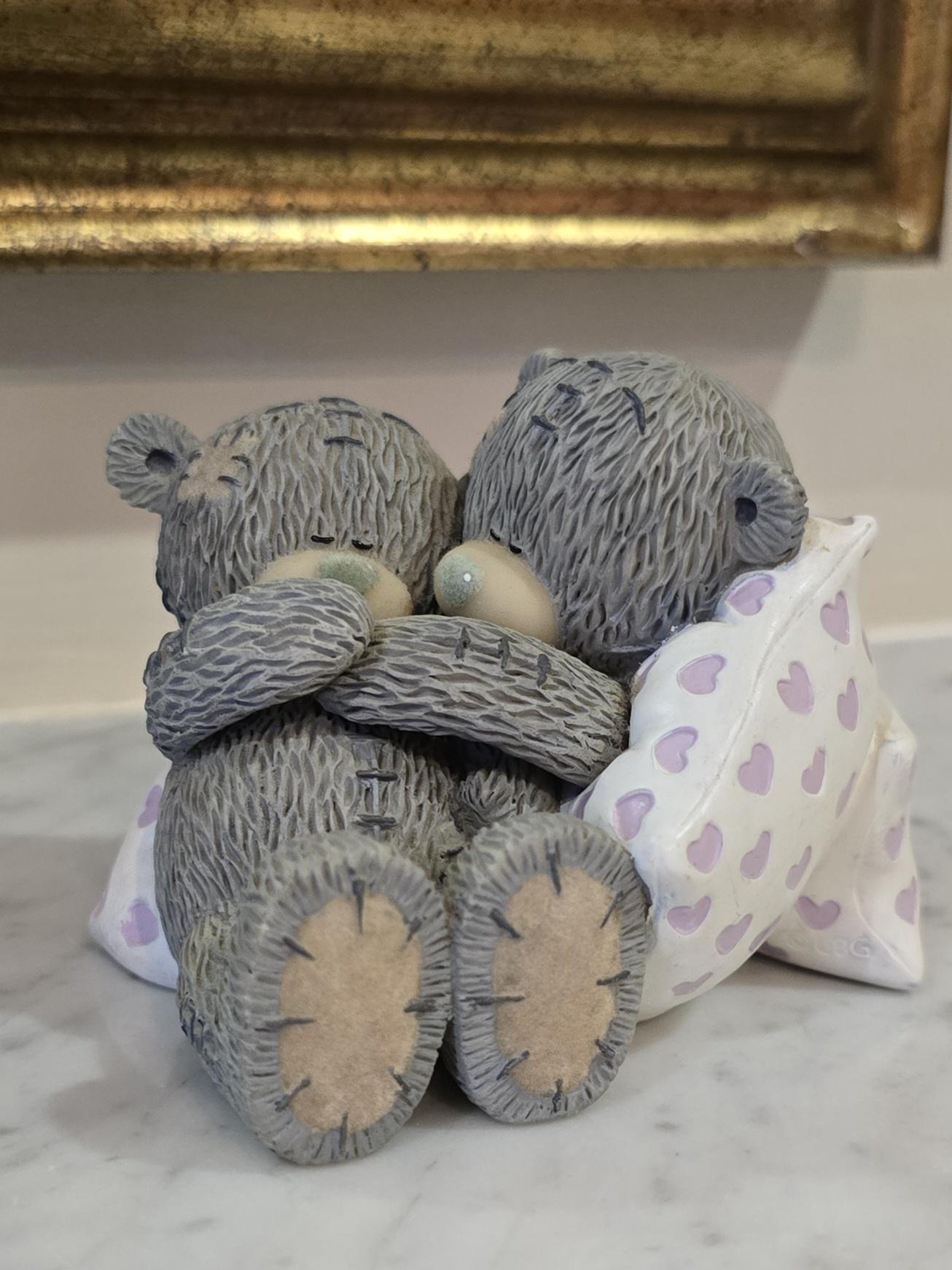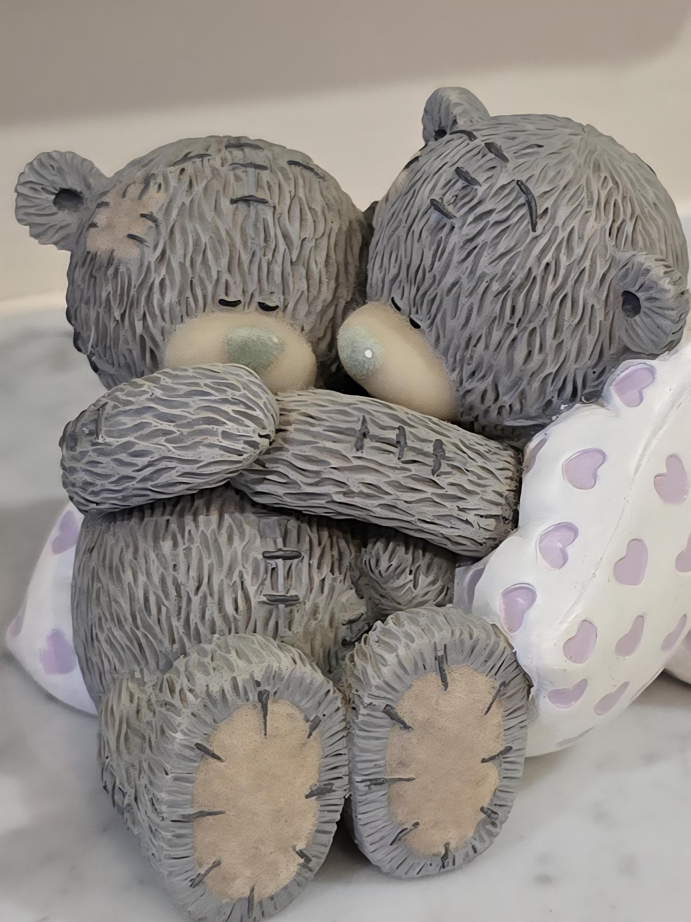 ​Capture a moment of heartwarming connection with this charming and rare Me to You Tatty Teddy figurine, titled "Sweet Dreams." This delightful collectible features two iconic grey Tatty Teddies (Me to You Bears) snuggling up, their arms intertwined, nestled among soft, heart-patterned pillows. It’s a perfect symbol of love, comfort, and togetherness.