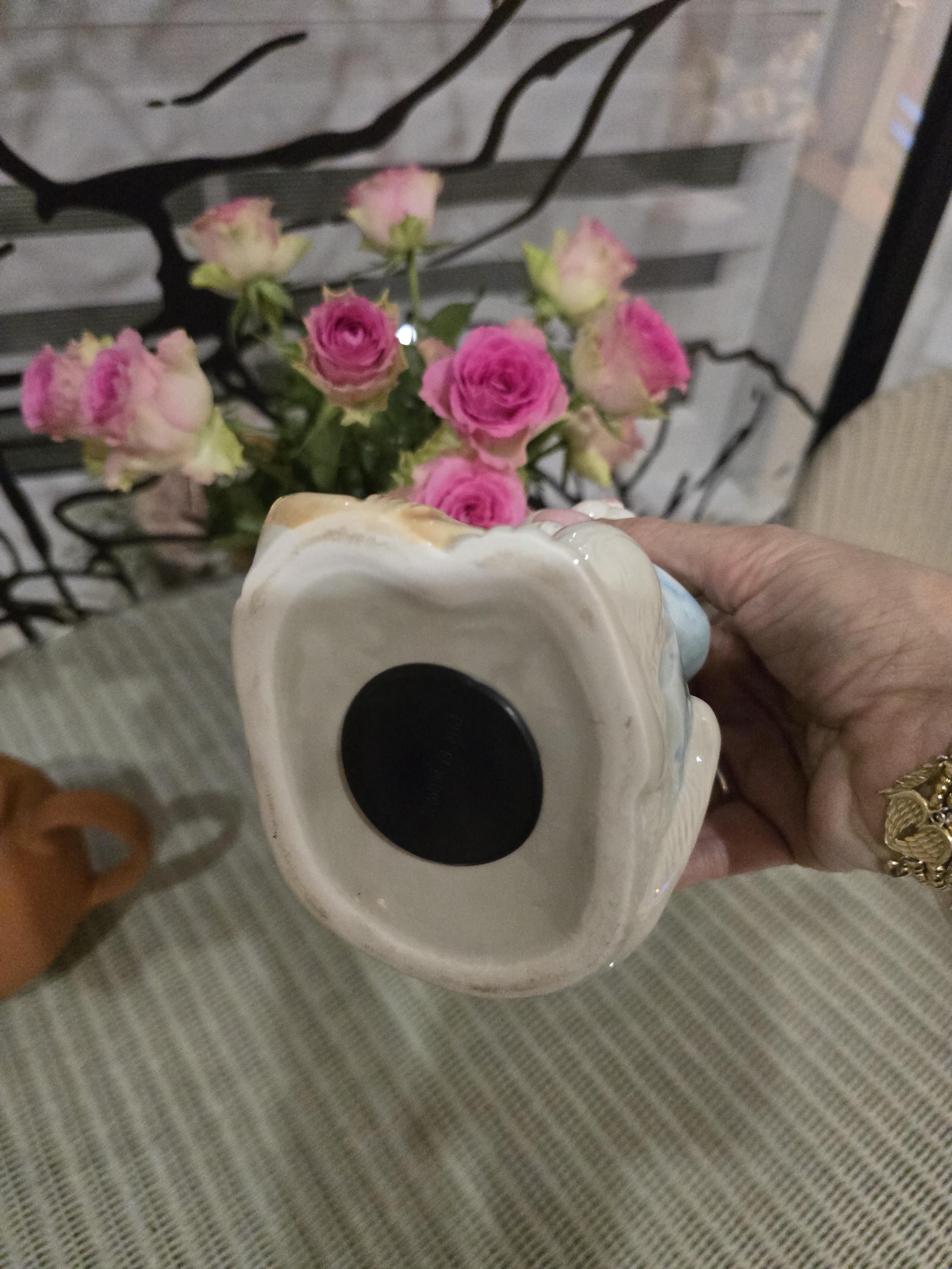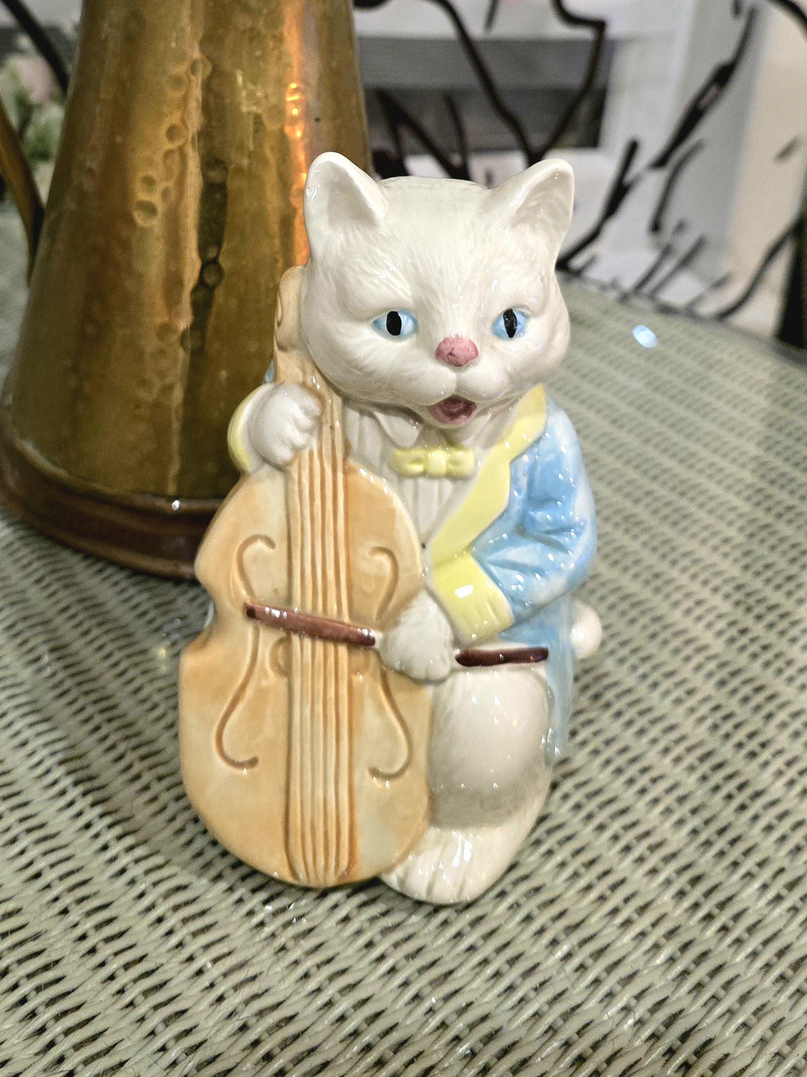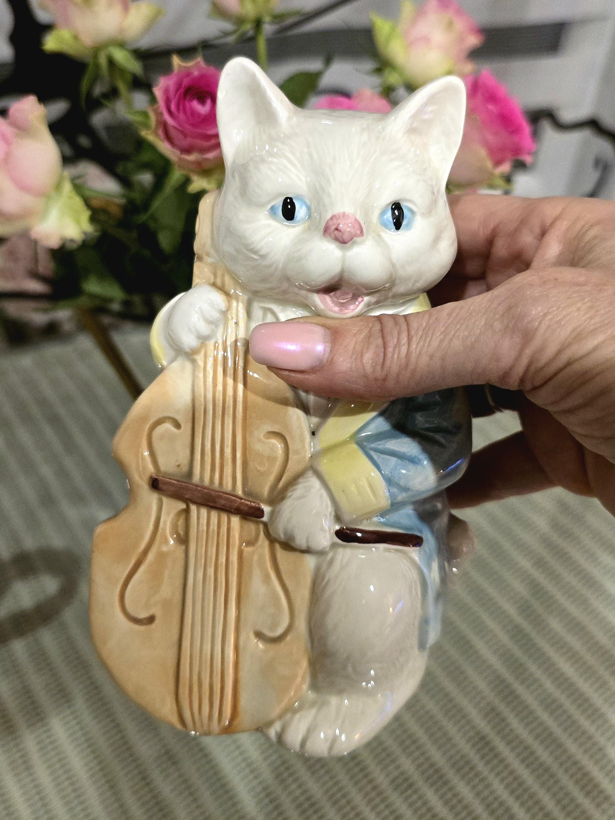 A charming ceramic cat money box dressed in soft blue with a sunny yellow collar, ready to guard your coins with gentle flair. This ENESCO-crafted feline brings a touch of kitsch and comfort to any shelf, nursery, or vintage vignette. With its coin slot nestled atop its head and stopper intact beneath, it’s both functional and delightfully decorative.