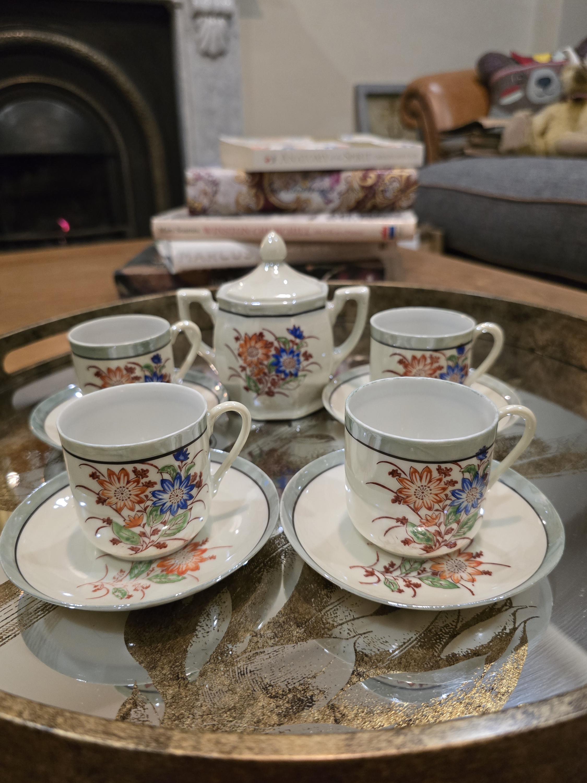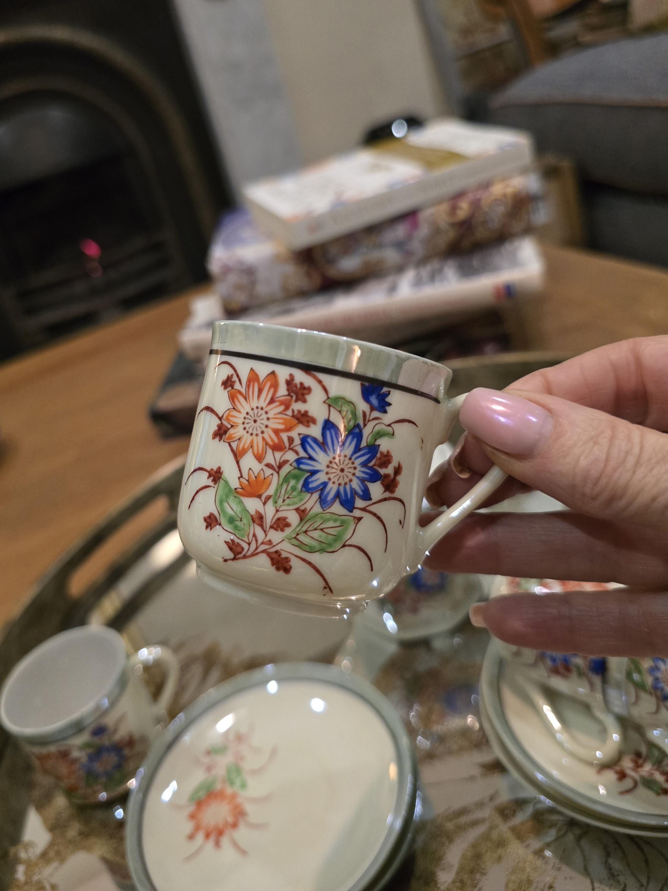 ​Own a piece of mid-century elegance with this rare, hand-painted "Klimax" lusterware espresso set. Or childs tea set. It's beautifully ornate ...