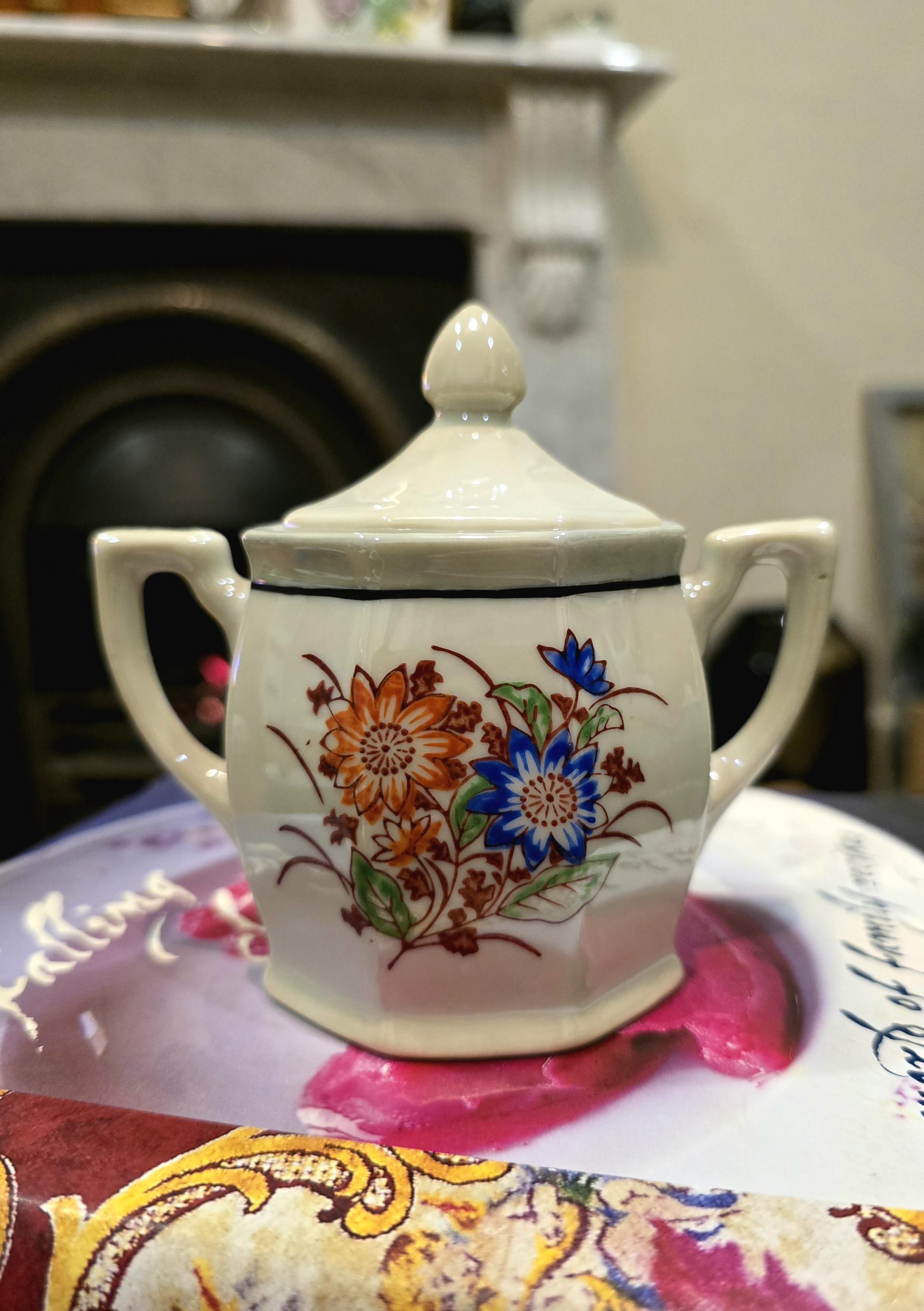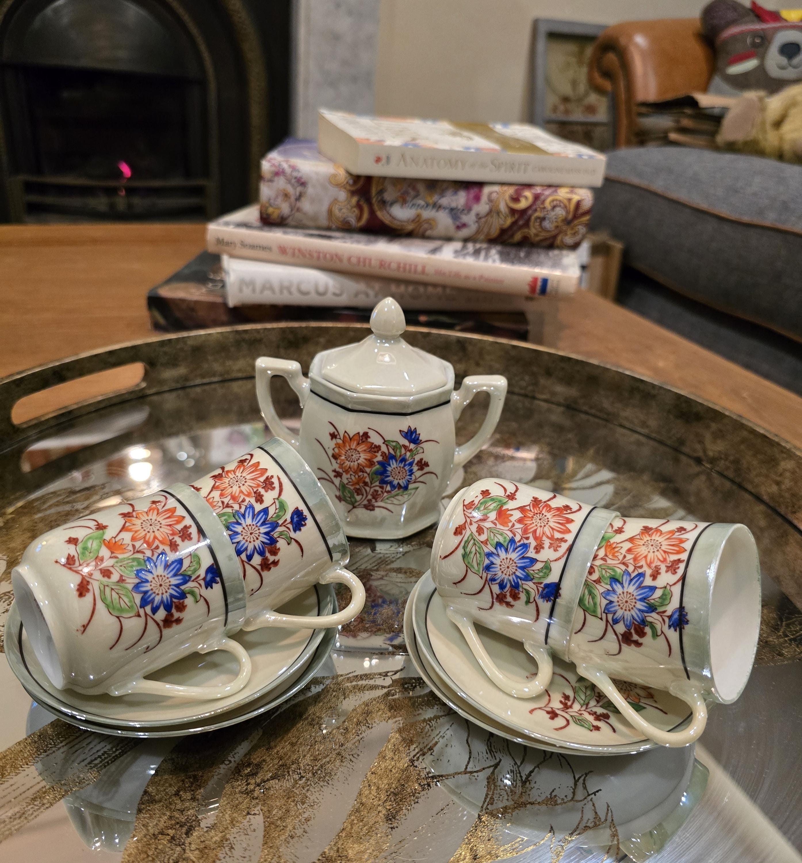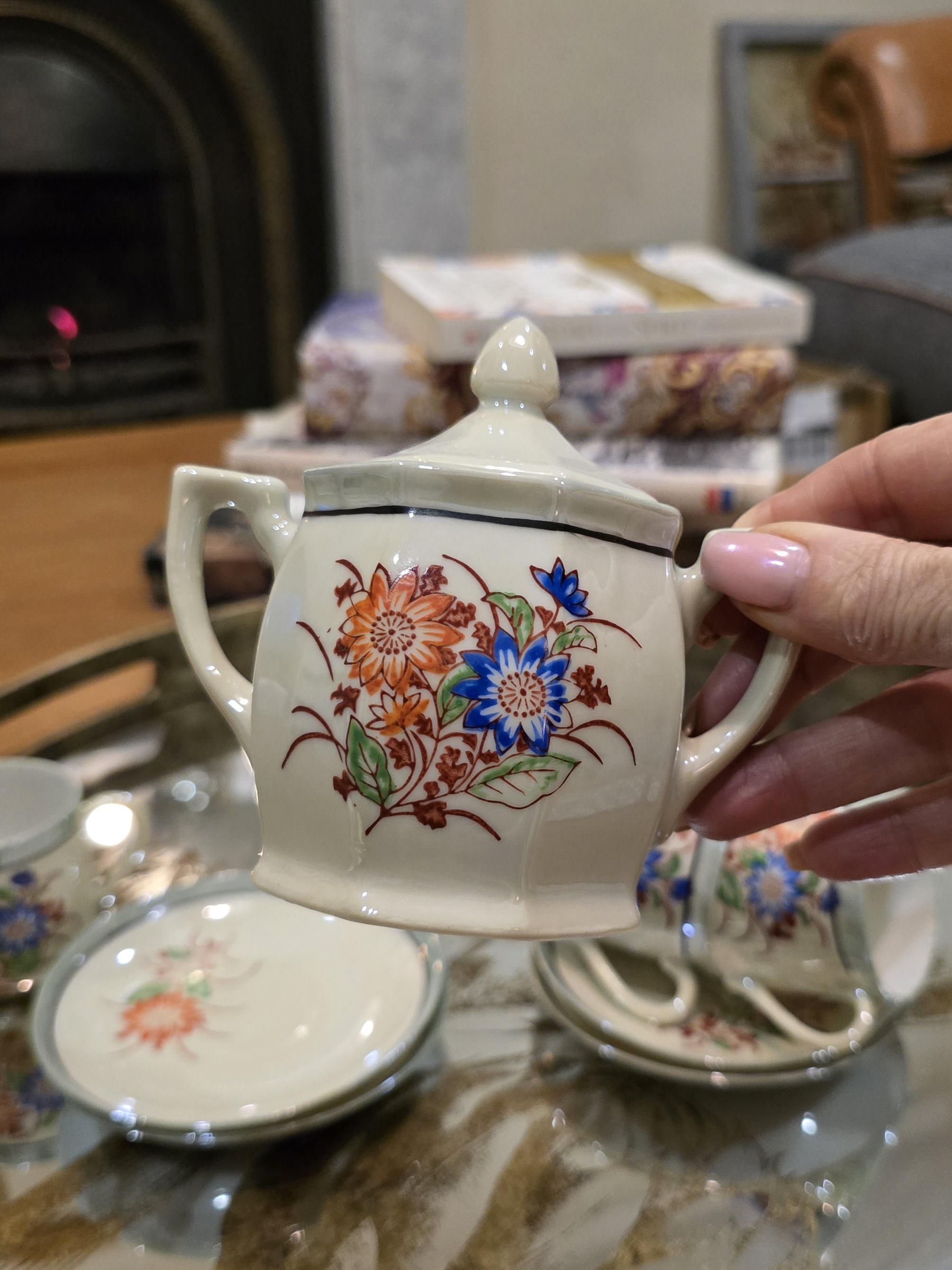 ​The octagonal sugar or candy bowl and petite demitasse cups showcase a beautiful combination of orange and blue chrysanthemums, accented by a pale green luster trim that shimmers in the light.