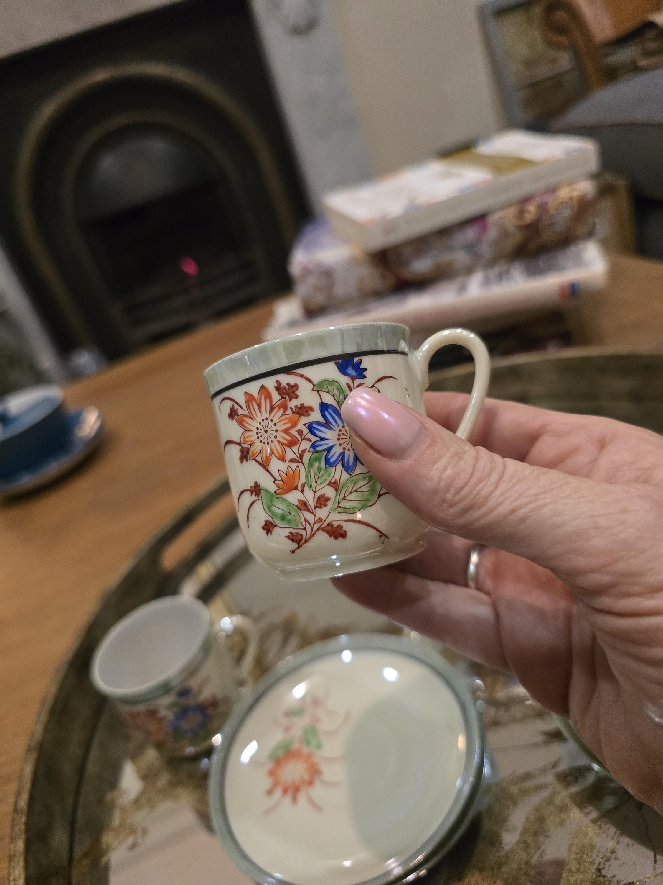 ​4 Demitasse Cups: Featuring hand-painted florals and luster-finished handles.