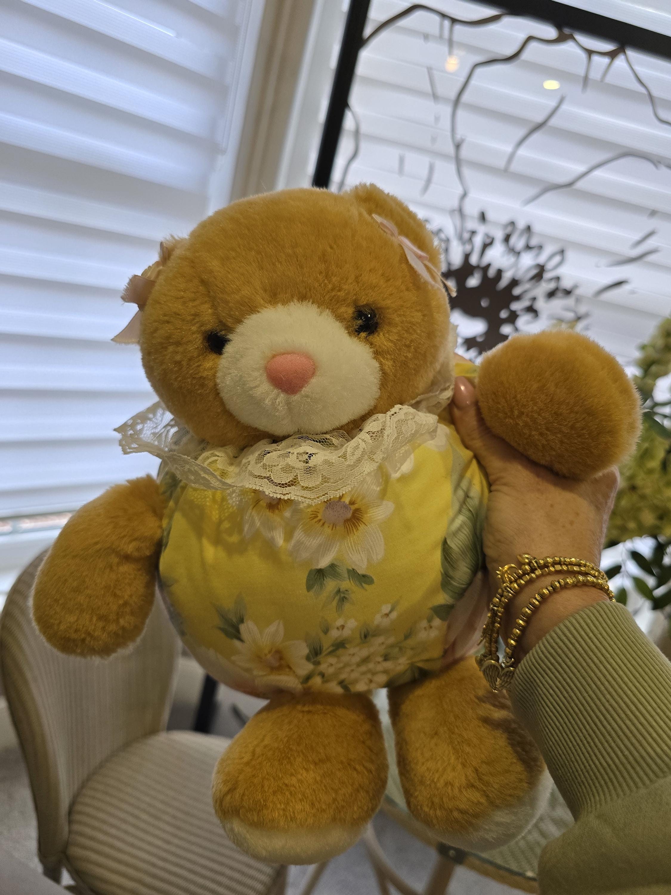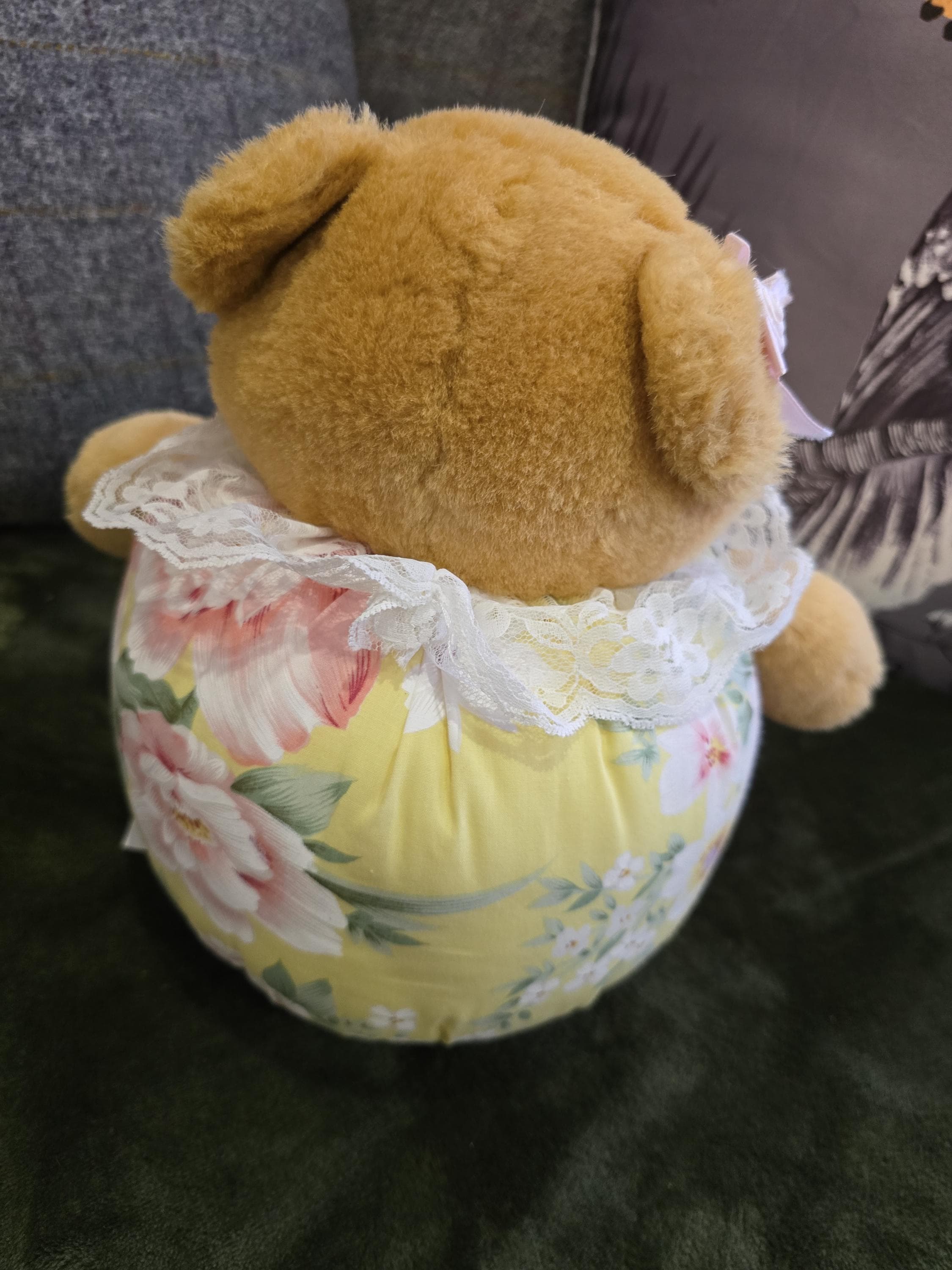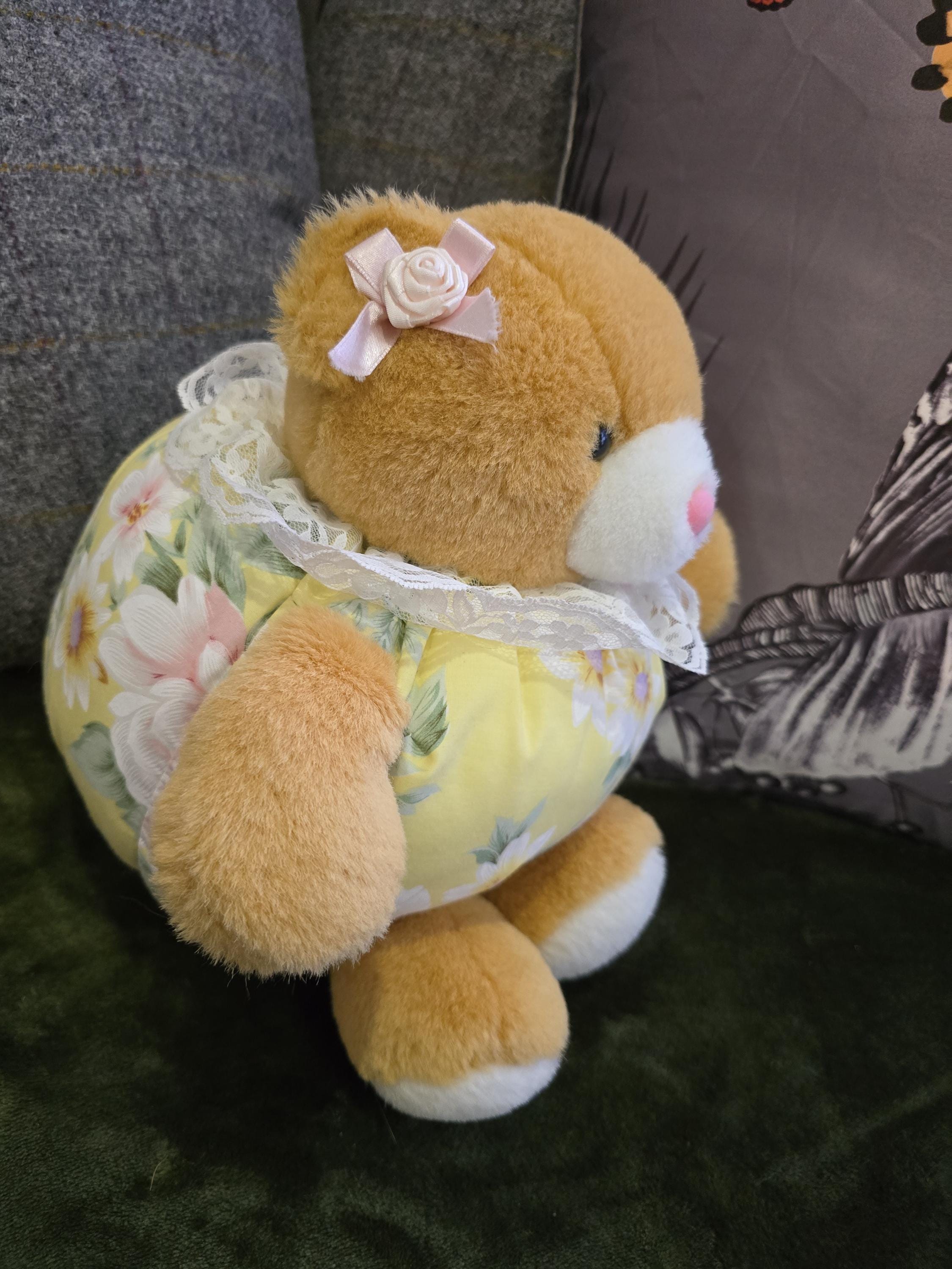 Meet Bumble a Vintage 90s Teddy Bear - Floral - Shabby Chic Decor - Retro Bear with Yellow Flower Dress