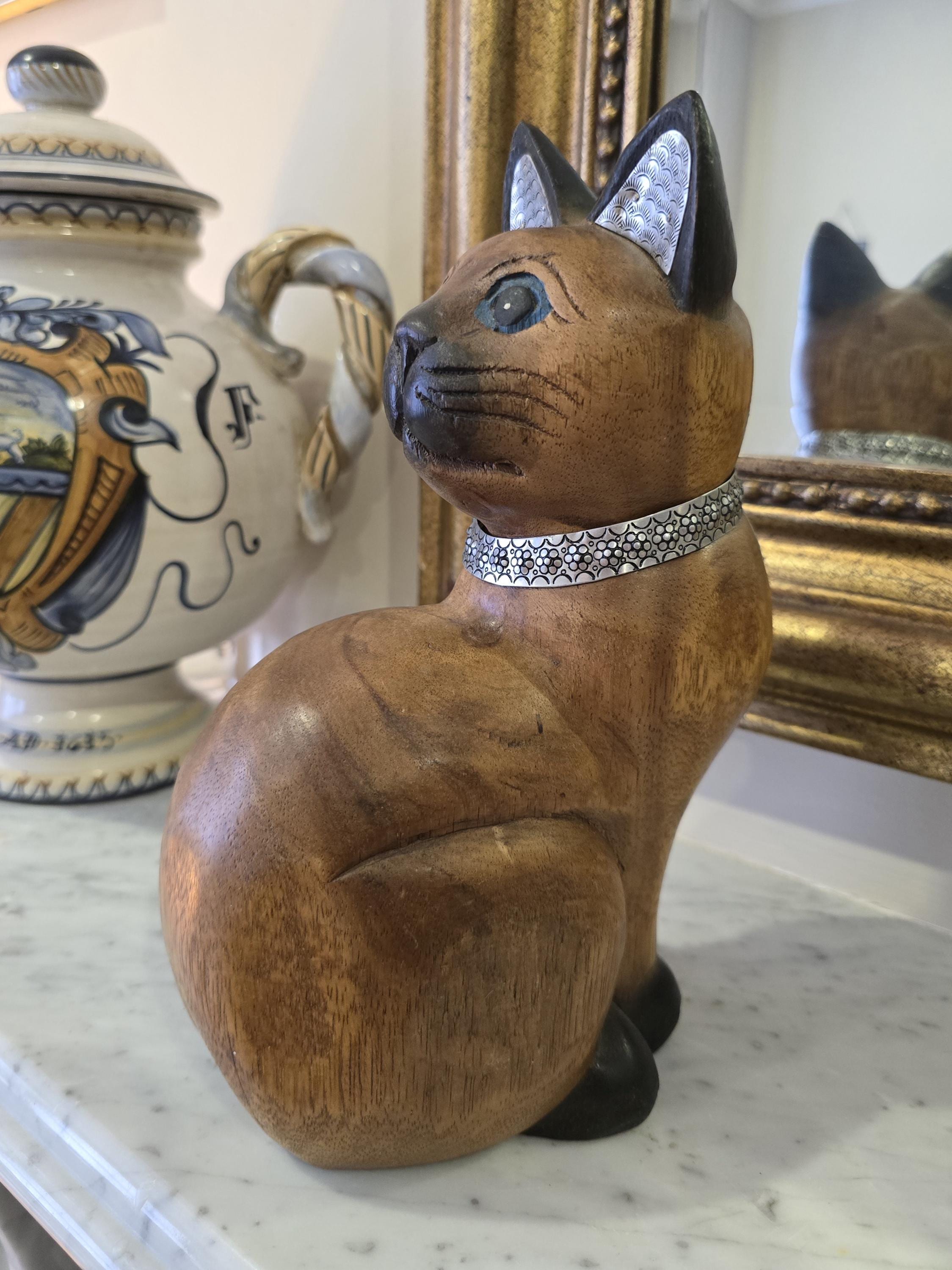 Bring a touch of artisan elegance to your home with this stunning hand-carved Siamese cat sculpture.
