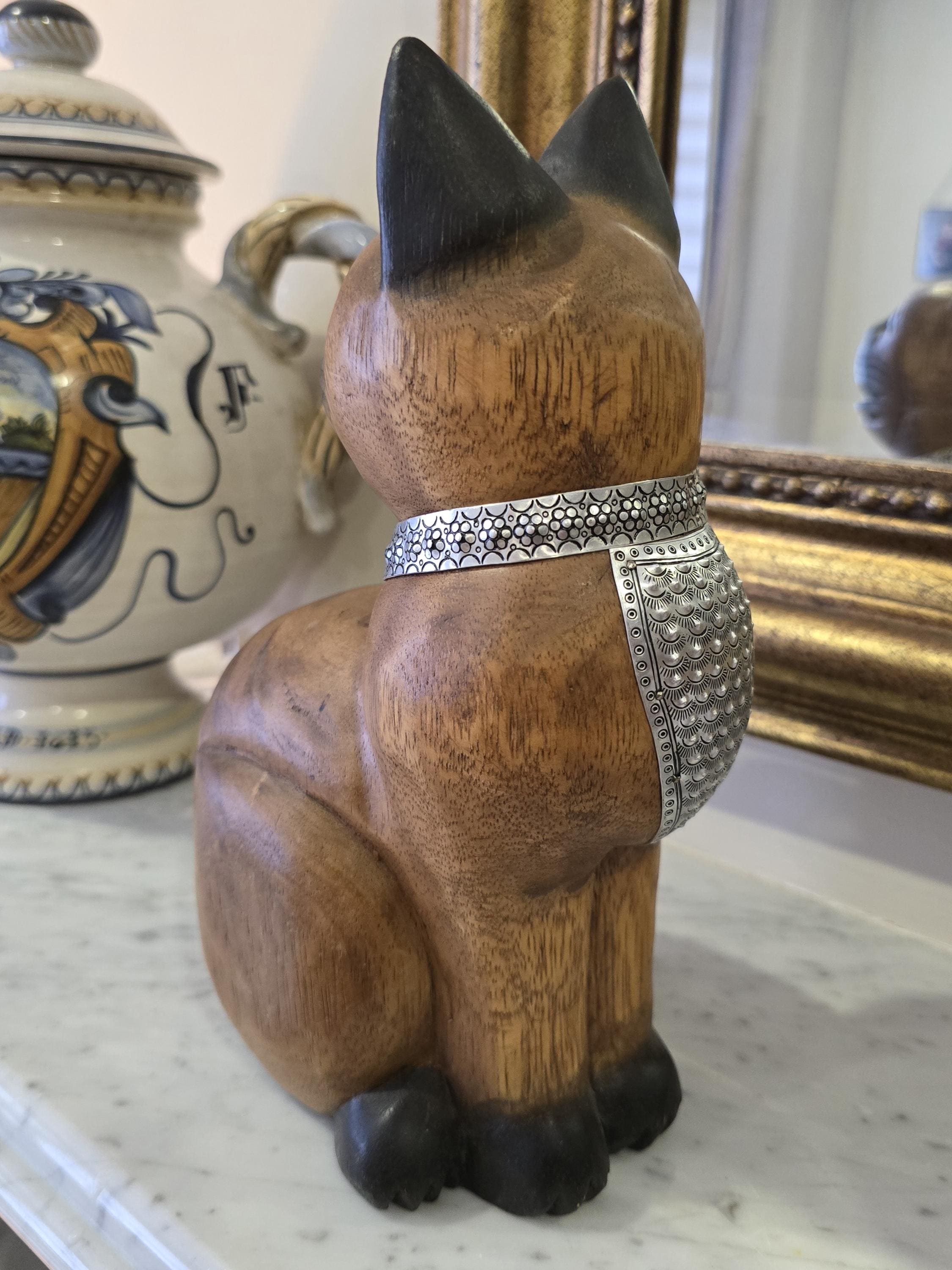 ​Available from Femme Within, this 10-inch tall figurine is a beautiful blend of natural textures and intricate metalwork. Carved from a single block of rich, grained wood, this cat features the classic pointed markings of a Siamese, beautifully accented with dark-stained ears, face, and paws.