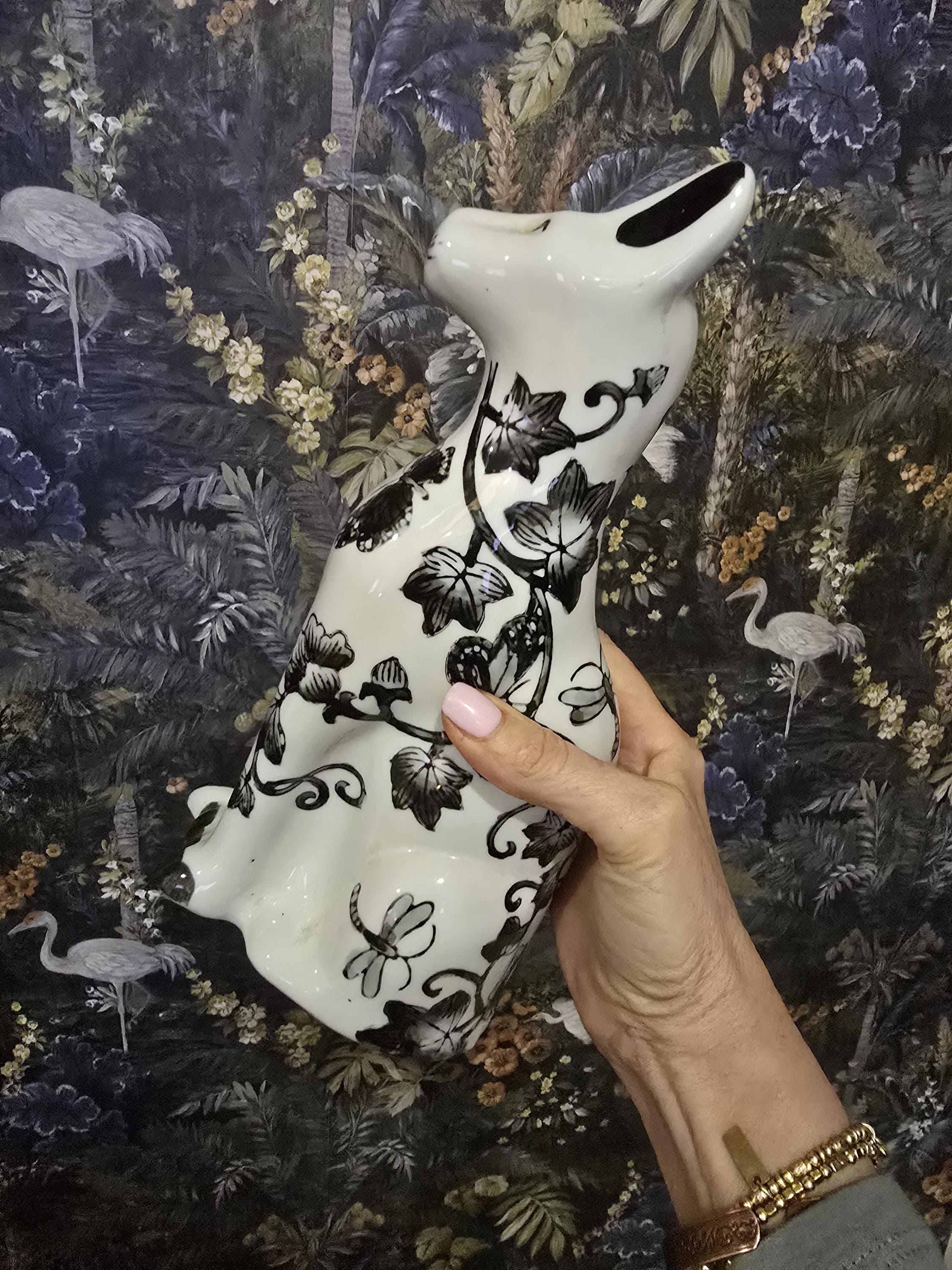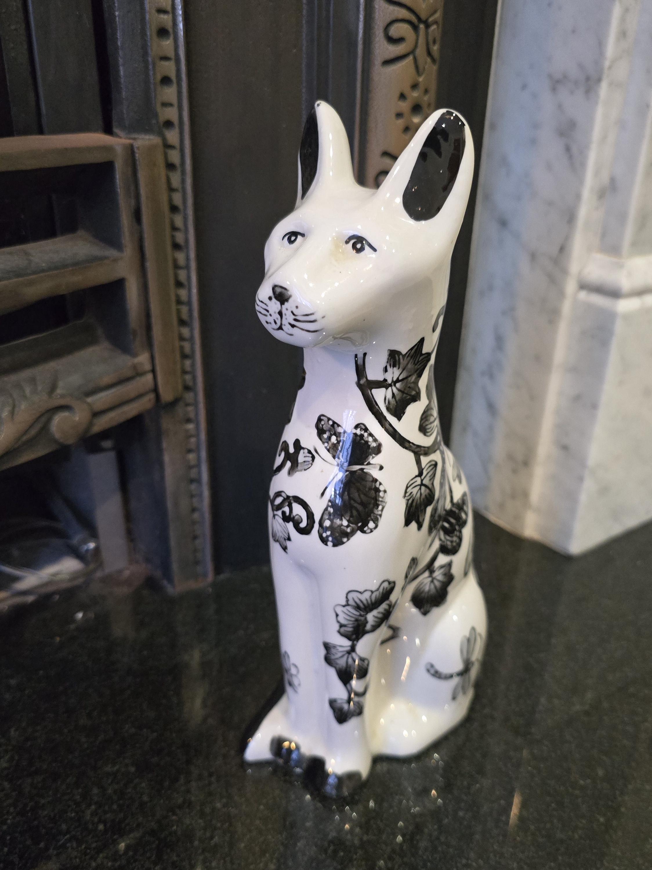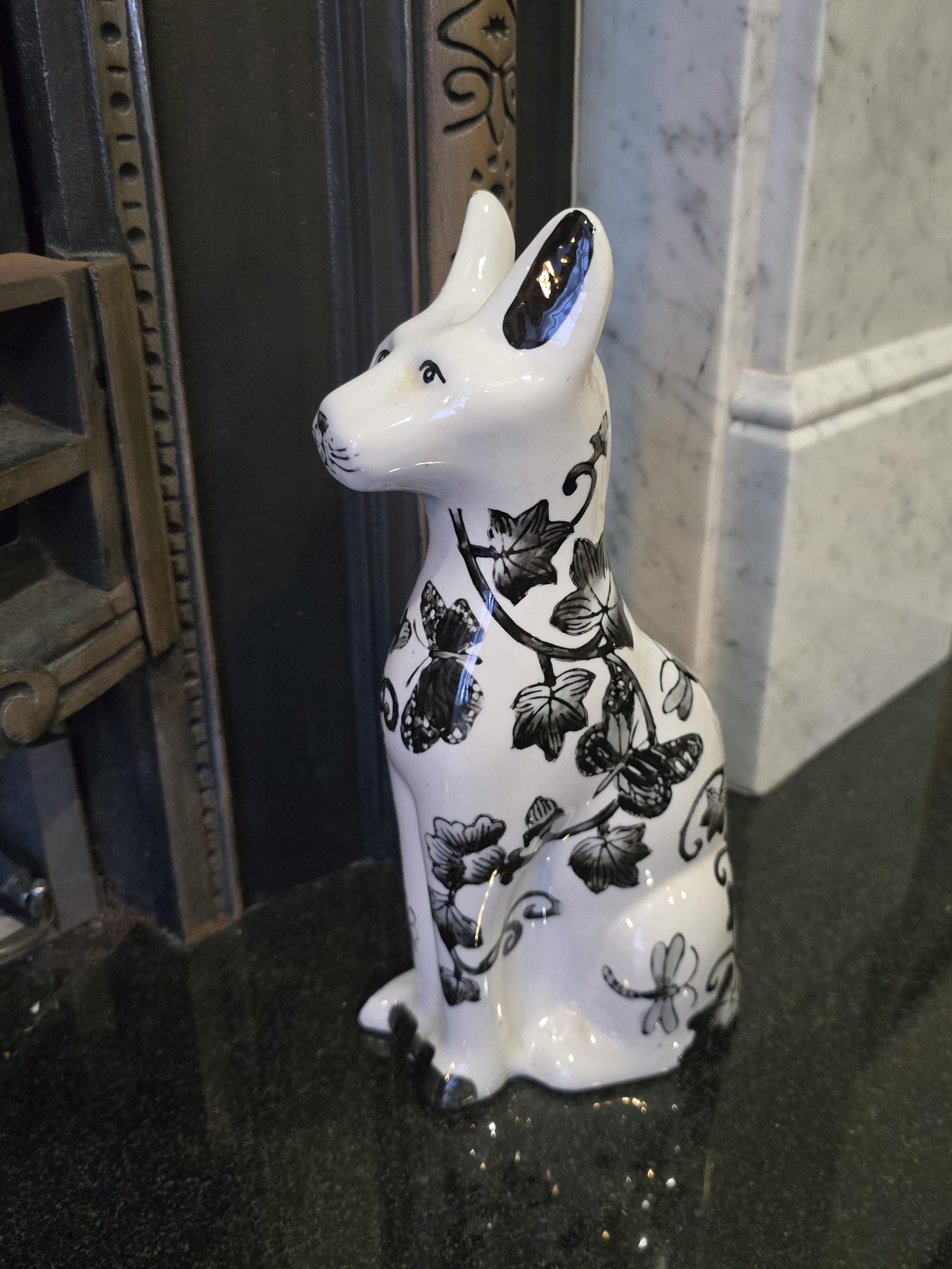 Vintage curated by Femme Within 11" Ceramic Cat Figurine – Elegant White and Black Floral Toile Decor – Dragonfly & Vine Pattern – Chinoiserie Style Cat Statue