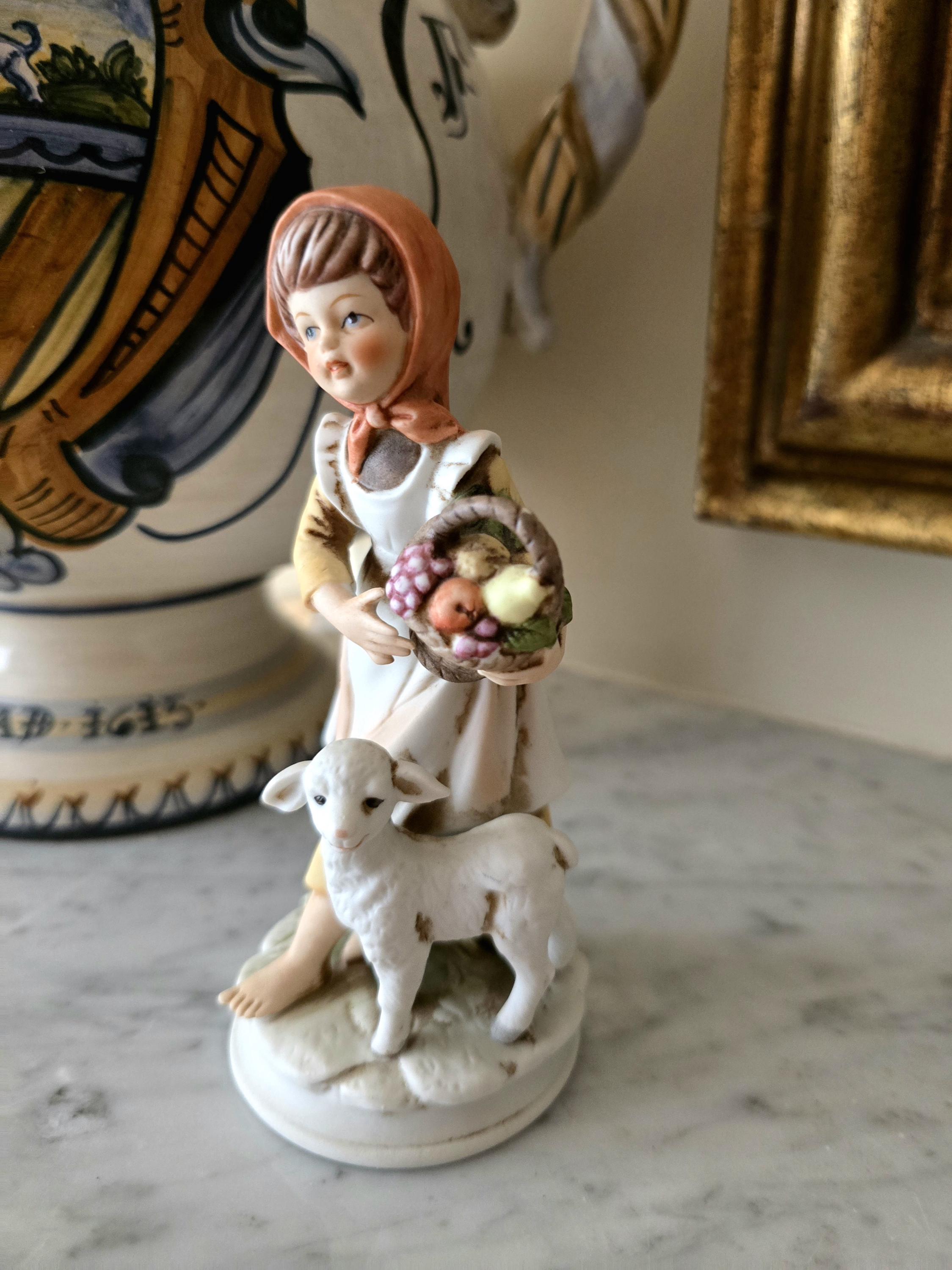 ​This 4.5-inch porcelain piece features a young girl in pastoral dress, carrying a bounteous basket of fruit and accompanied by a loyal little lamb.