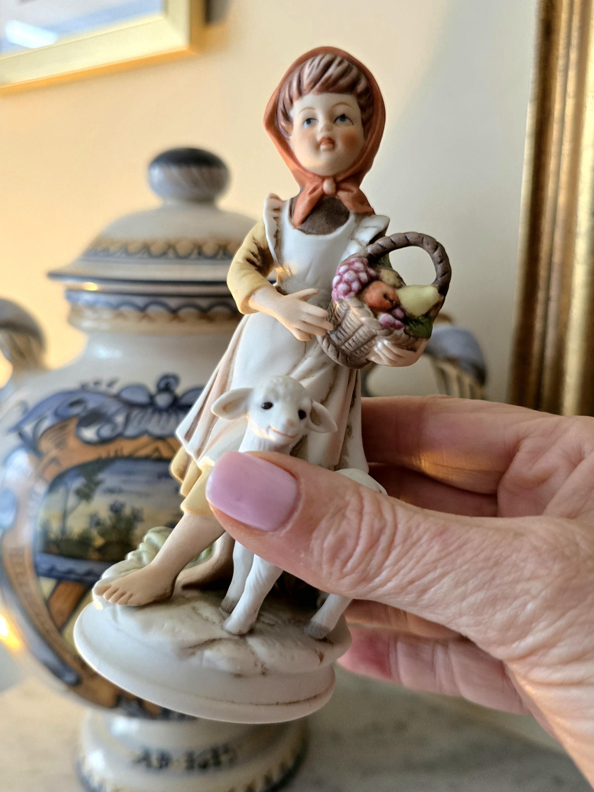Vintage Shepherdess Figurine, 4.5" Matte Porcelain Girl with Lamb & Fruit Basket, Retro Pastoral