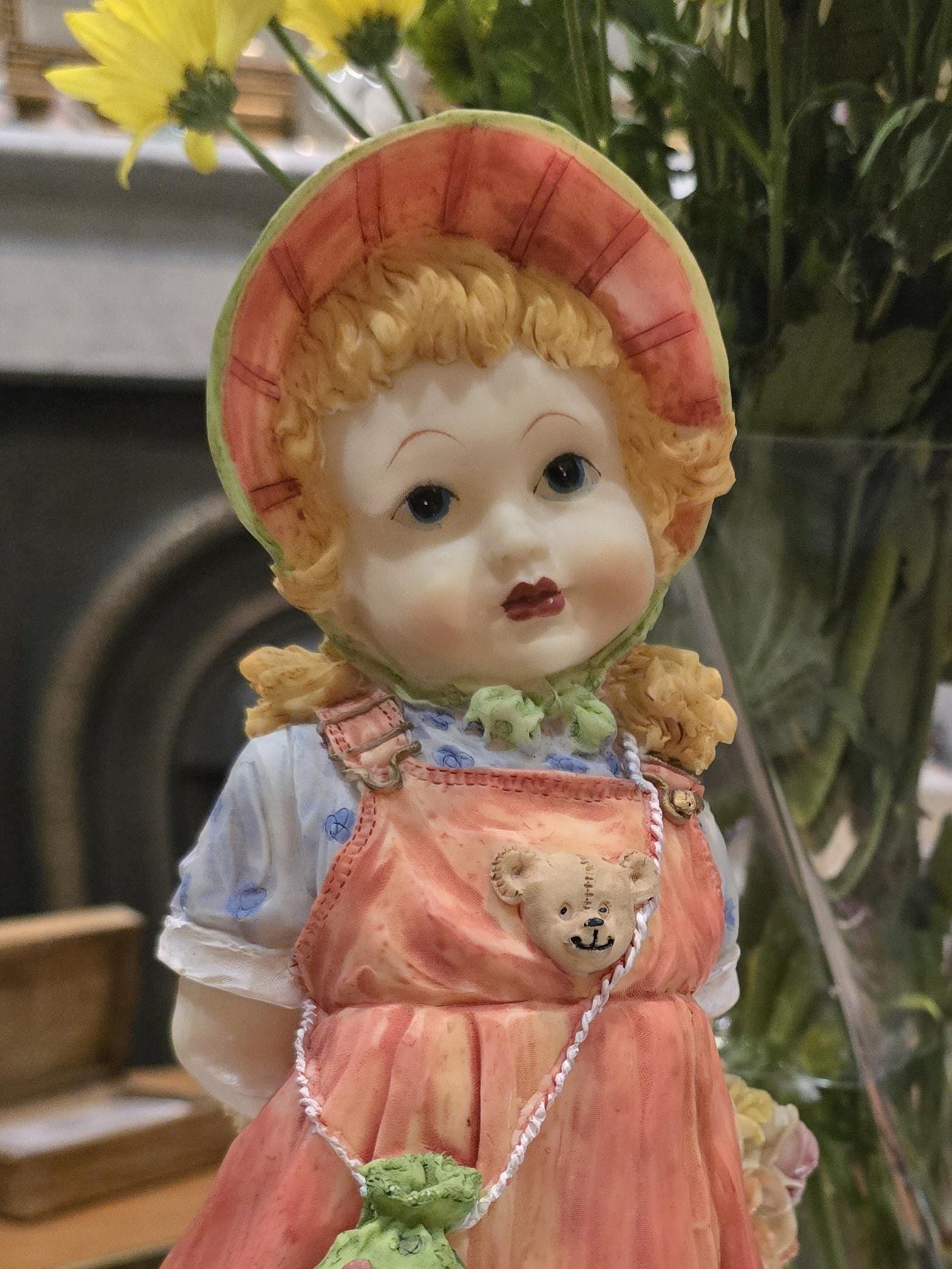 ​Intricate Details: Features a textured sun bonnet, floral dress trim, and a hidden teddy bear at the base.