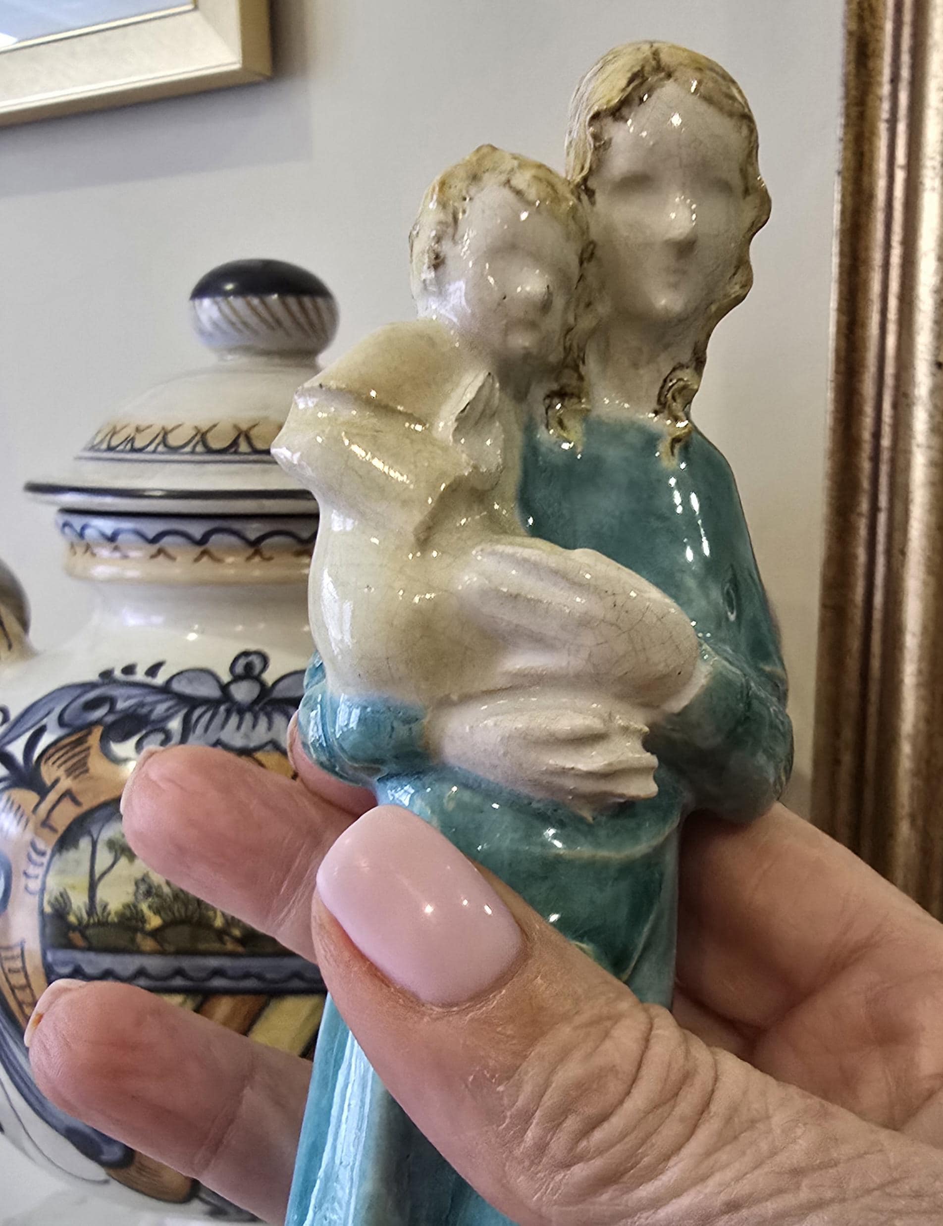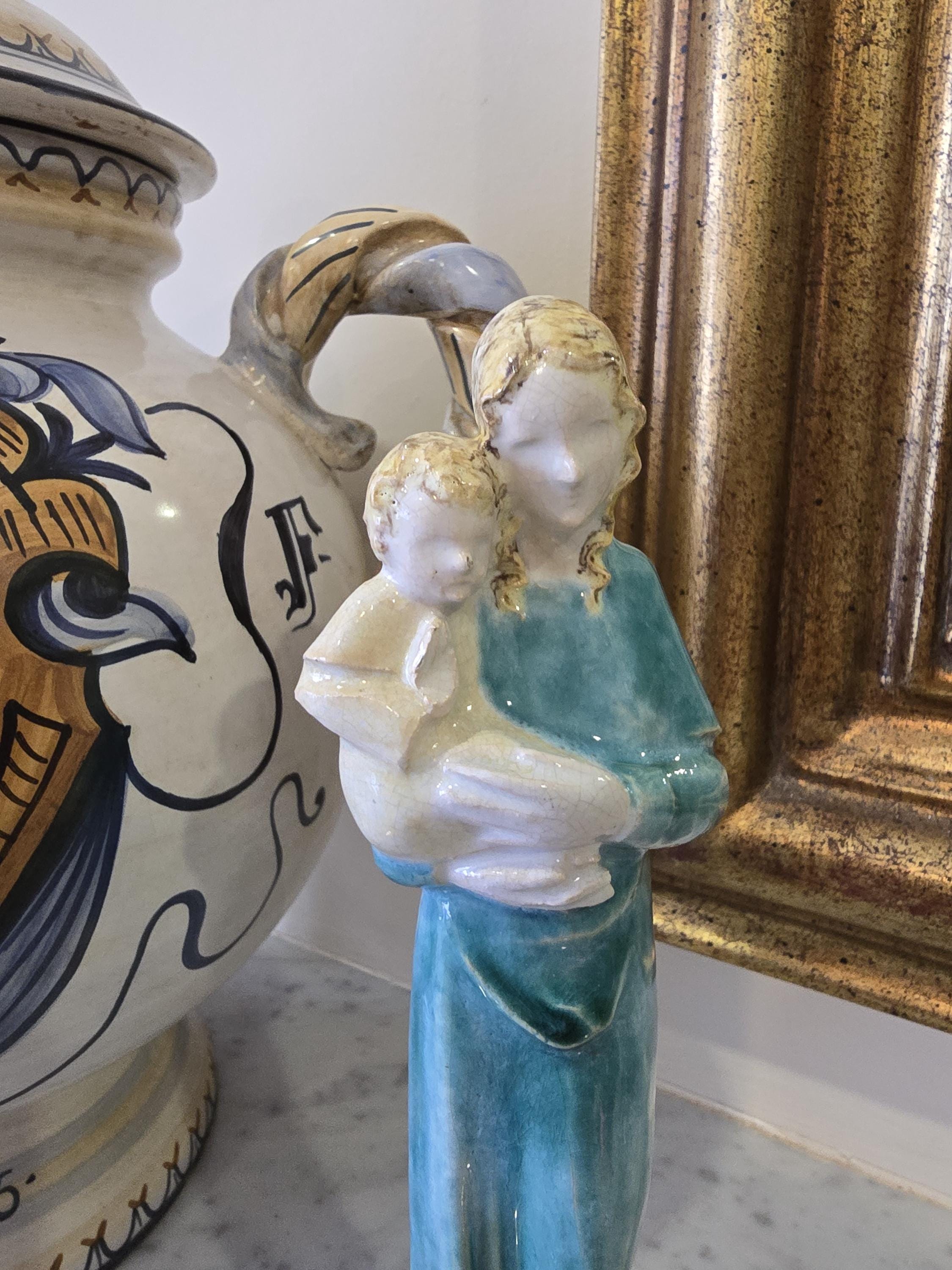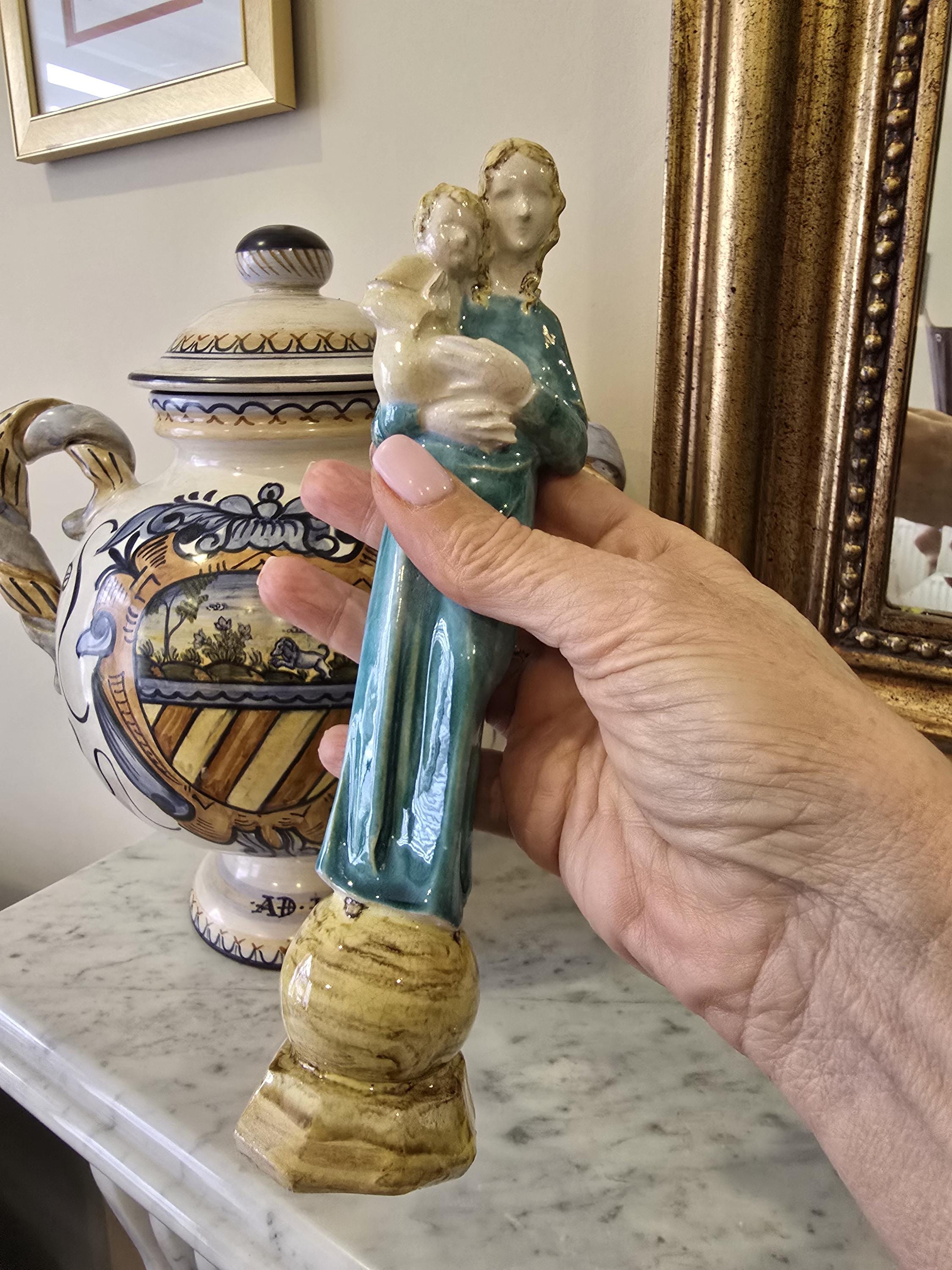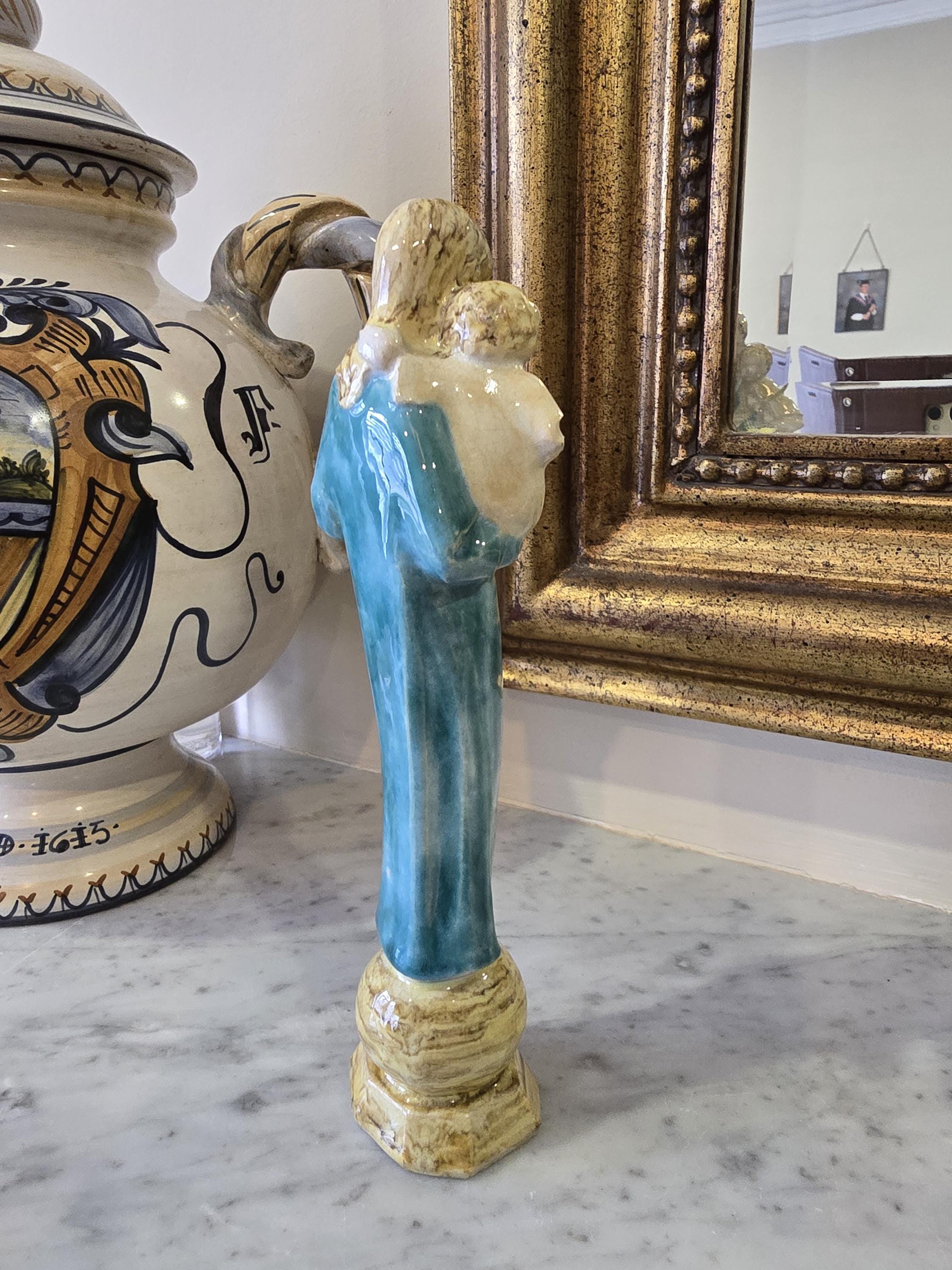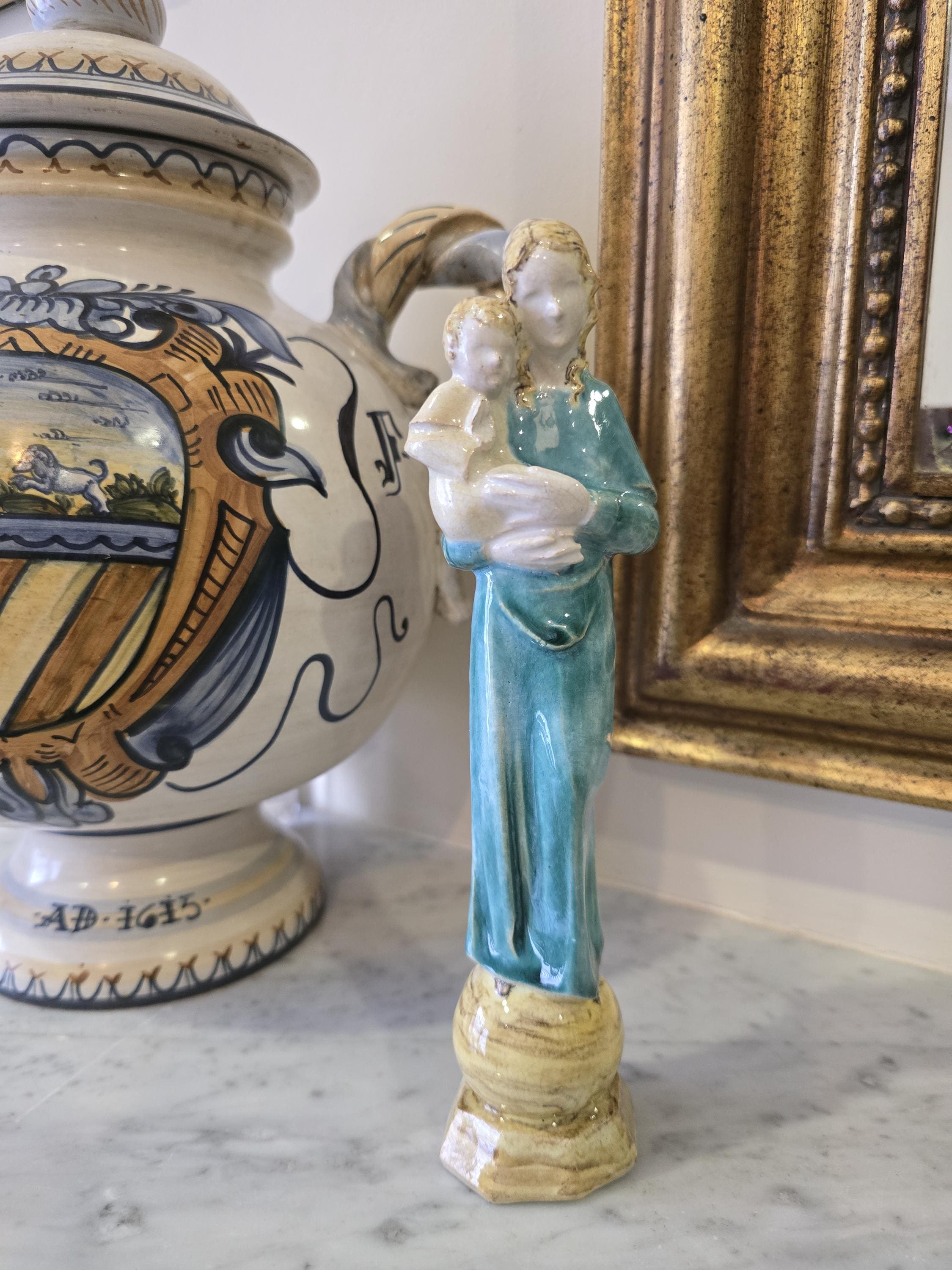 Vintage Madonna and Child Figurine – Mid-Century Teal Glazed Ceramic Sculpture