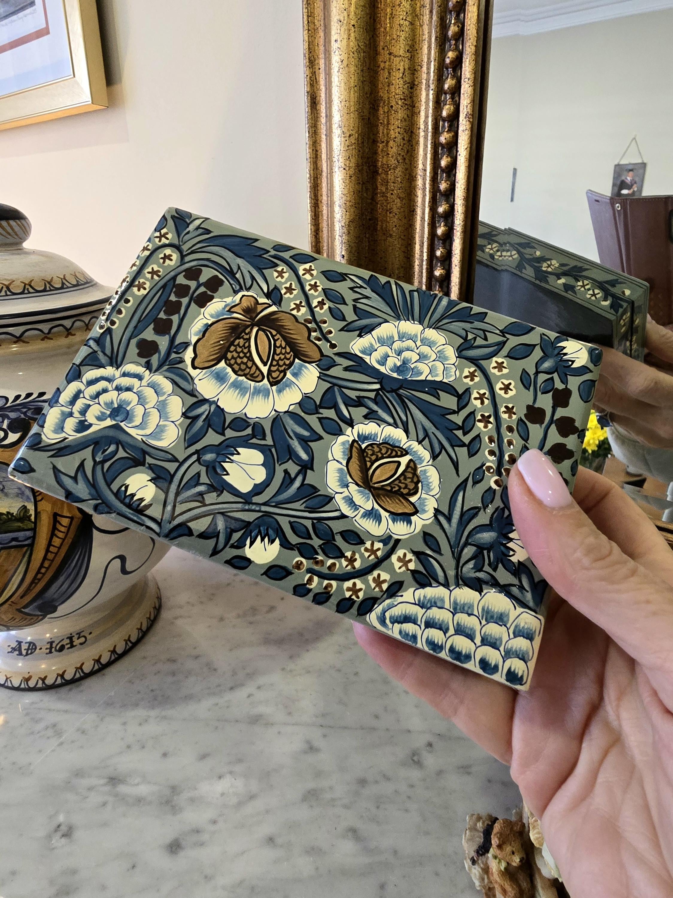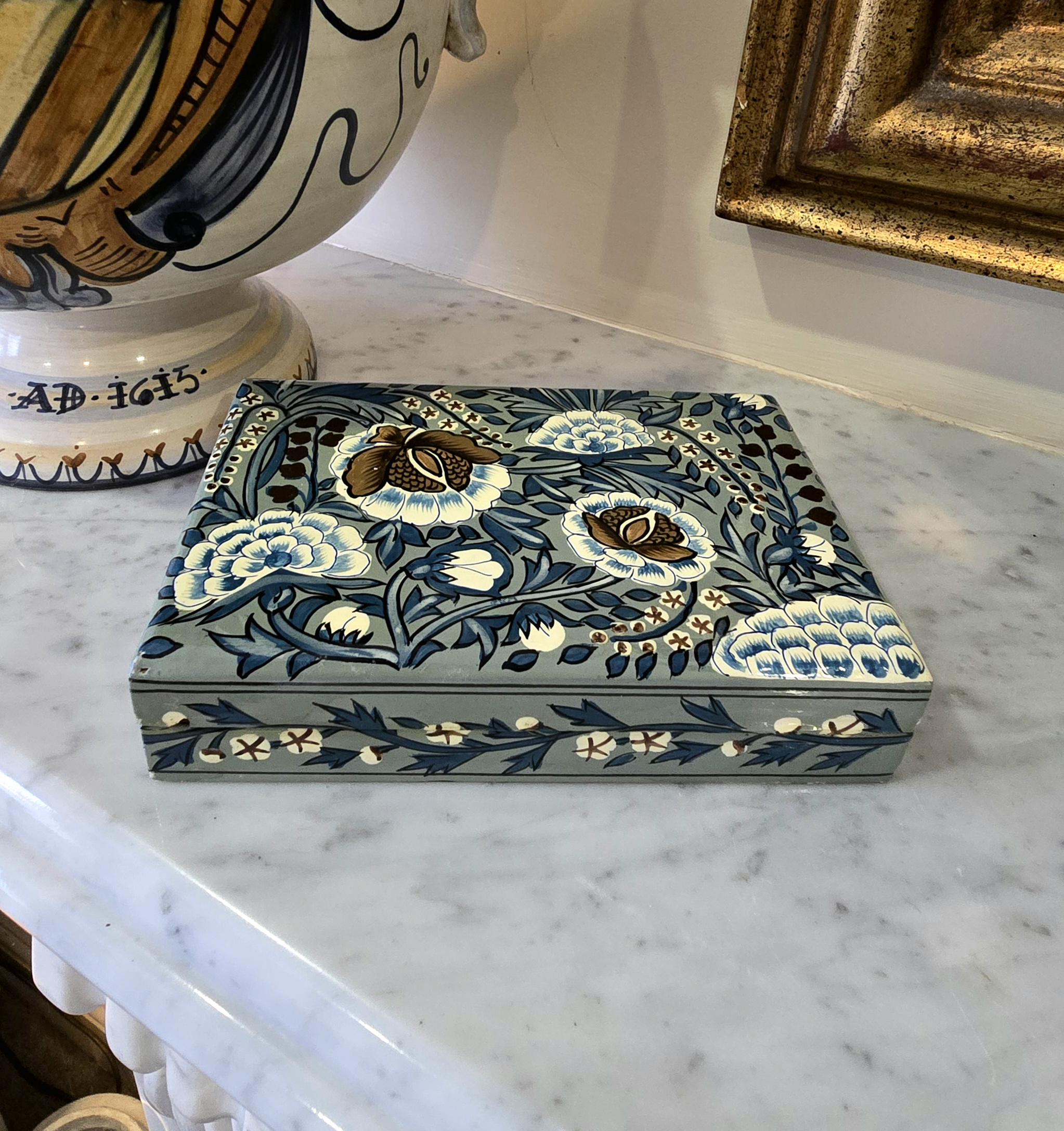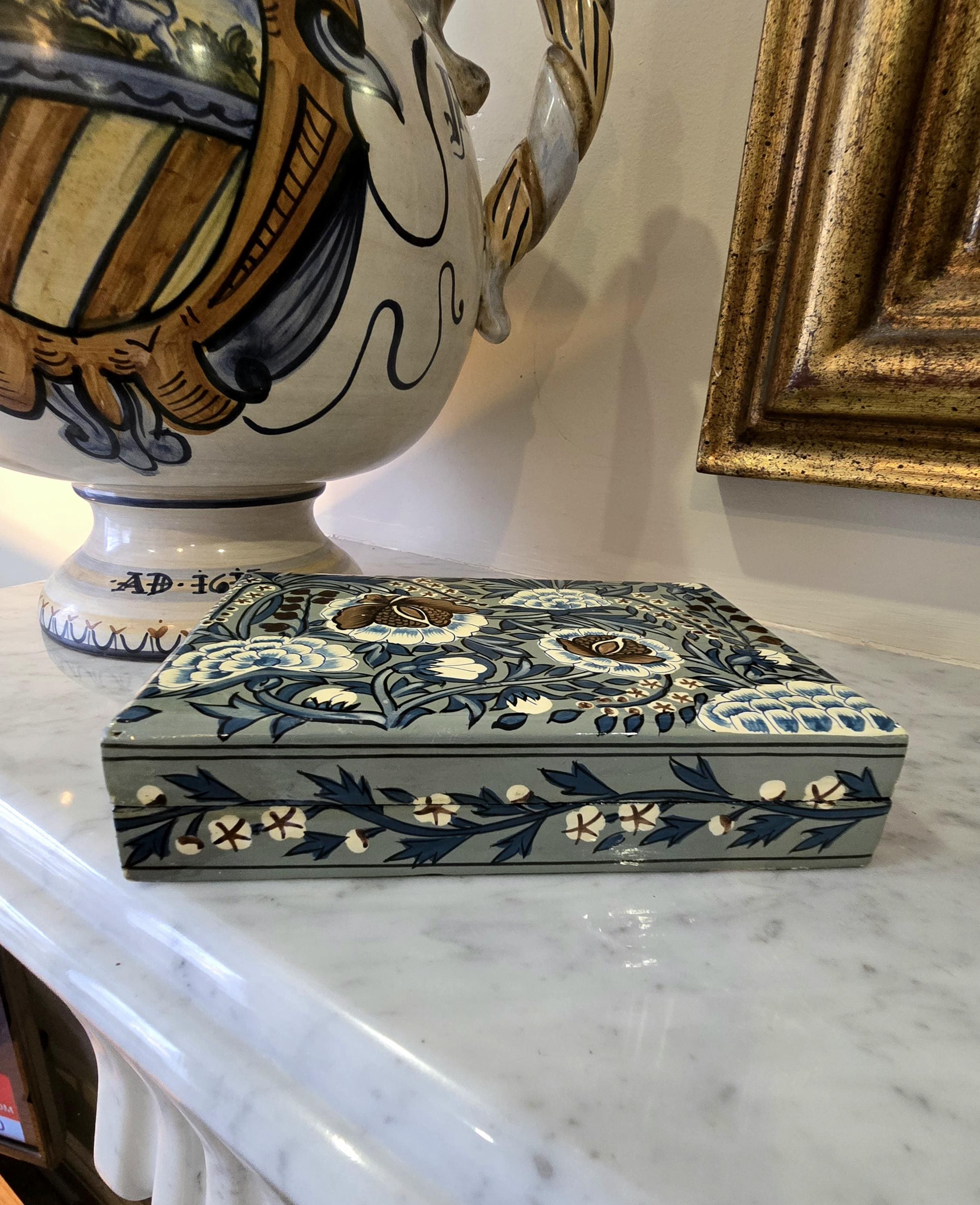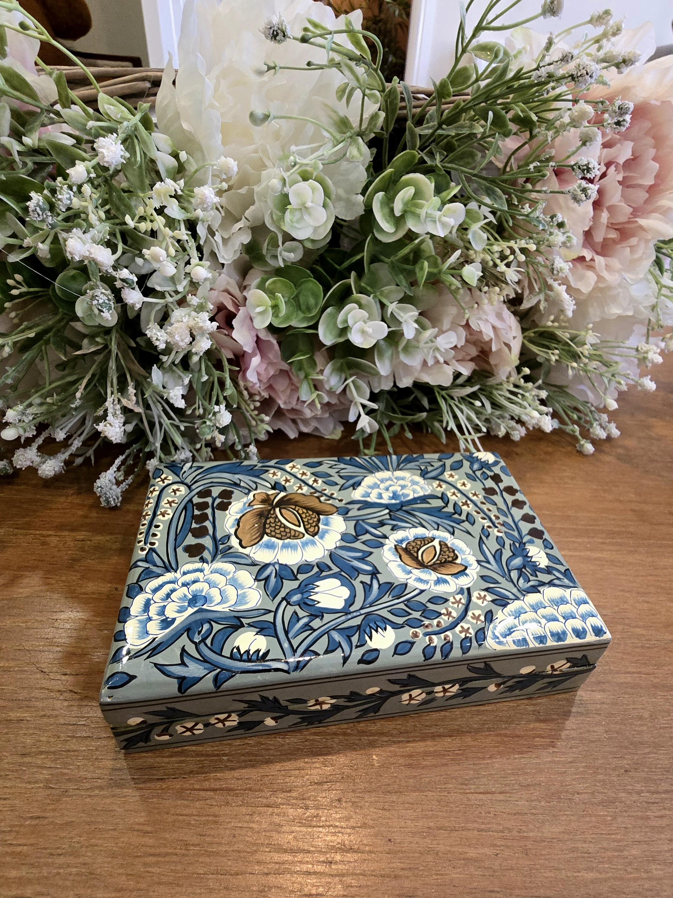 ​Measuring approximately 6 x 4 inches, this rectangular box features a sophisticated color palette of sage green, deep blue, and earthy browns. The lid is adorned with large, stylized floral blooms surrounded by swirling foliage and delicate gold-tone star-like accents. The sides are equally detailed with a repeating vine and blossom border.