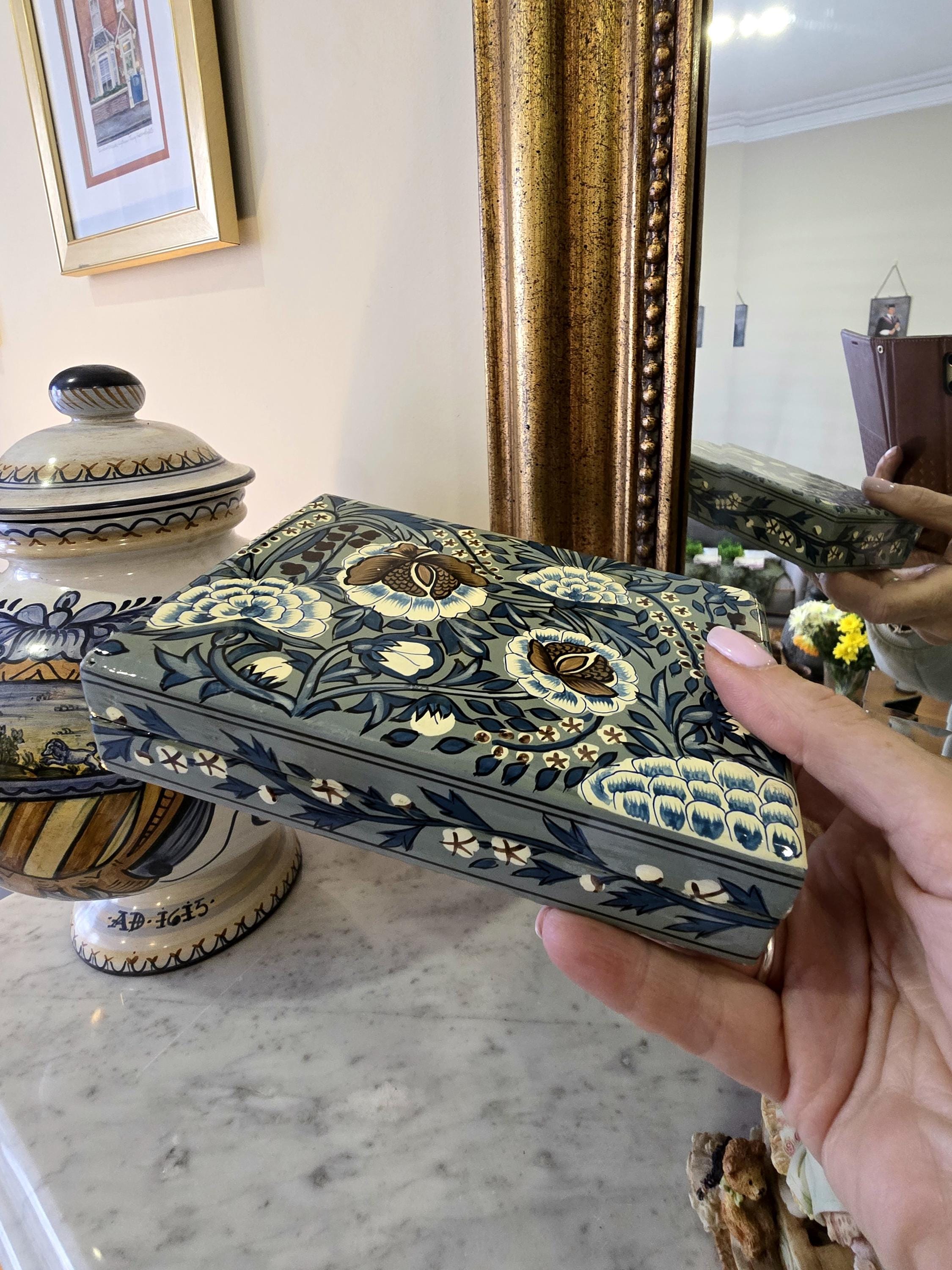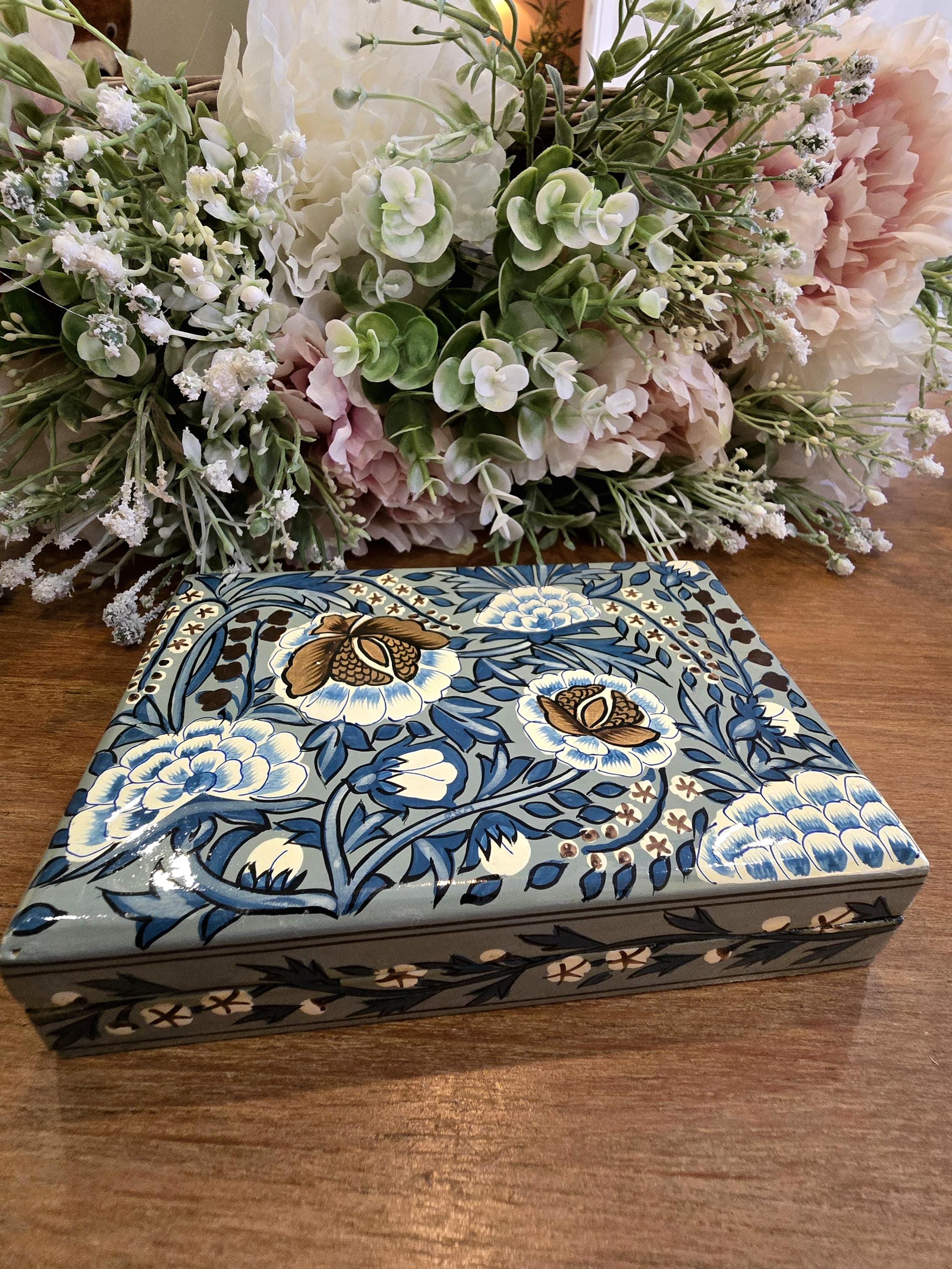 Add a touch of artisanal elegance to your dressing table with this stunning hand-painted paper mache trinket box.