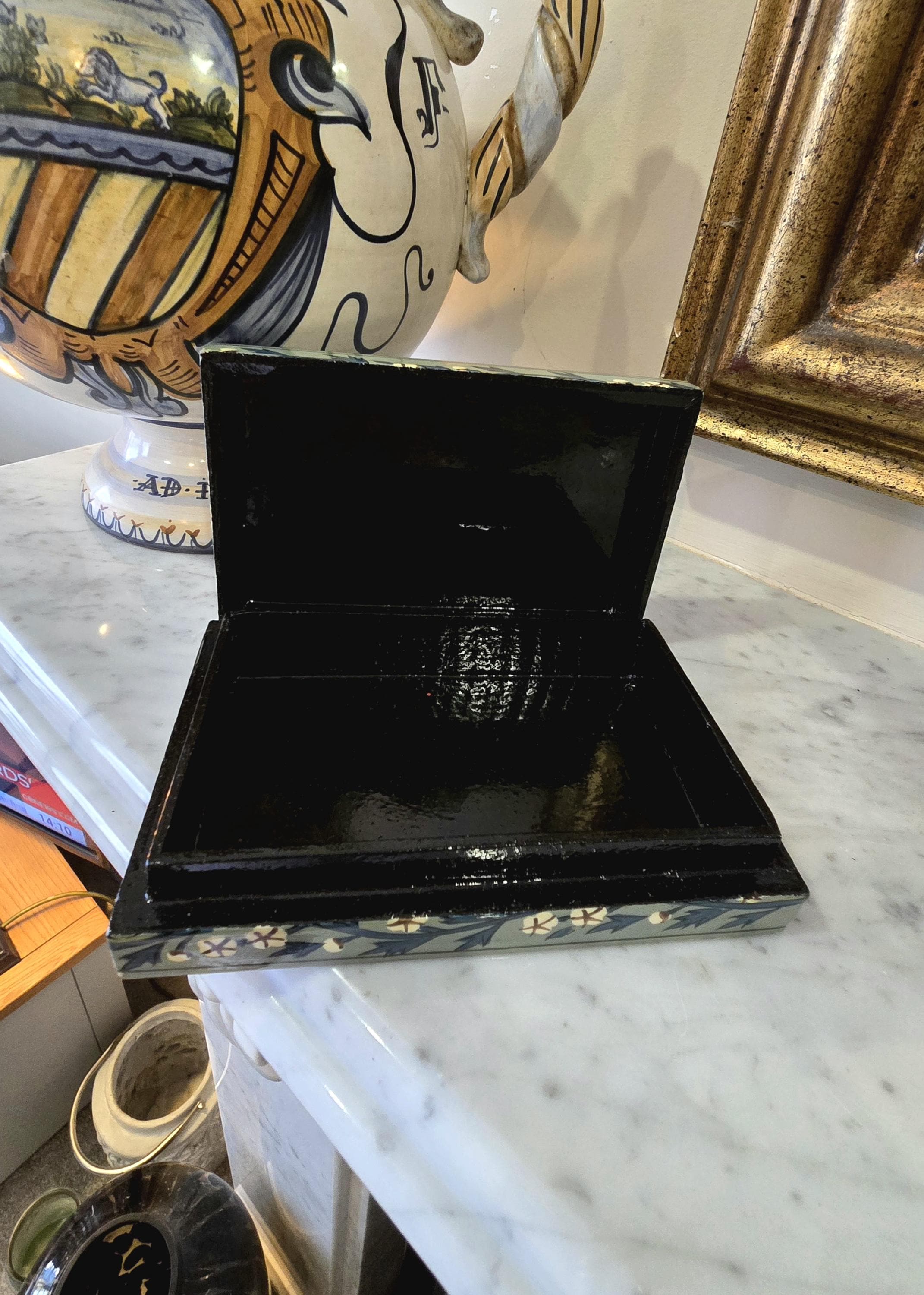 ​The interior and base are finished in a smooth, high-gloss black lacquer, providing a beautiful contrast to the detailed exterior. This is a perfect piece for storing jewellery, stationery, or small mementos.