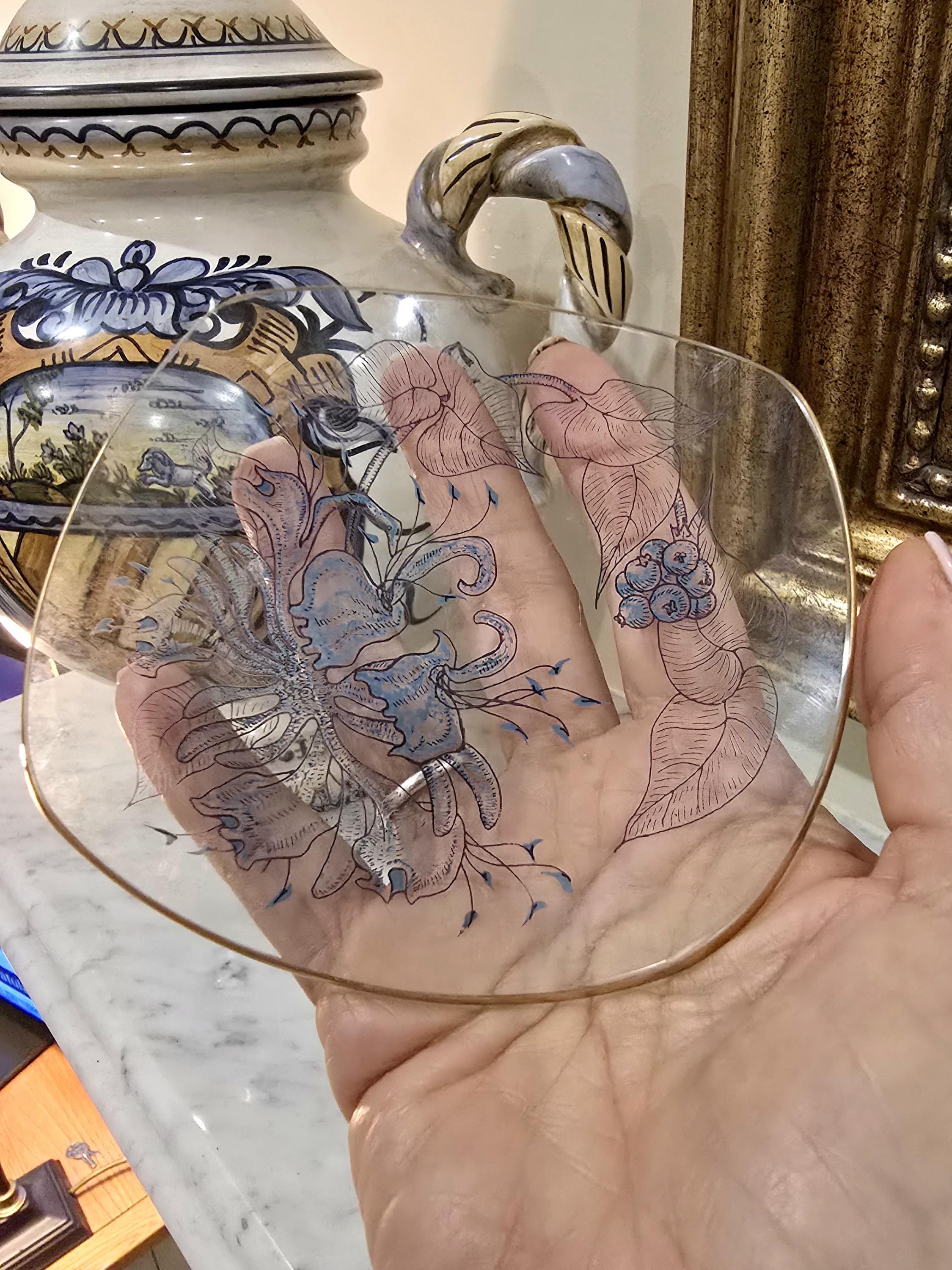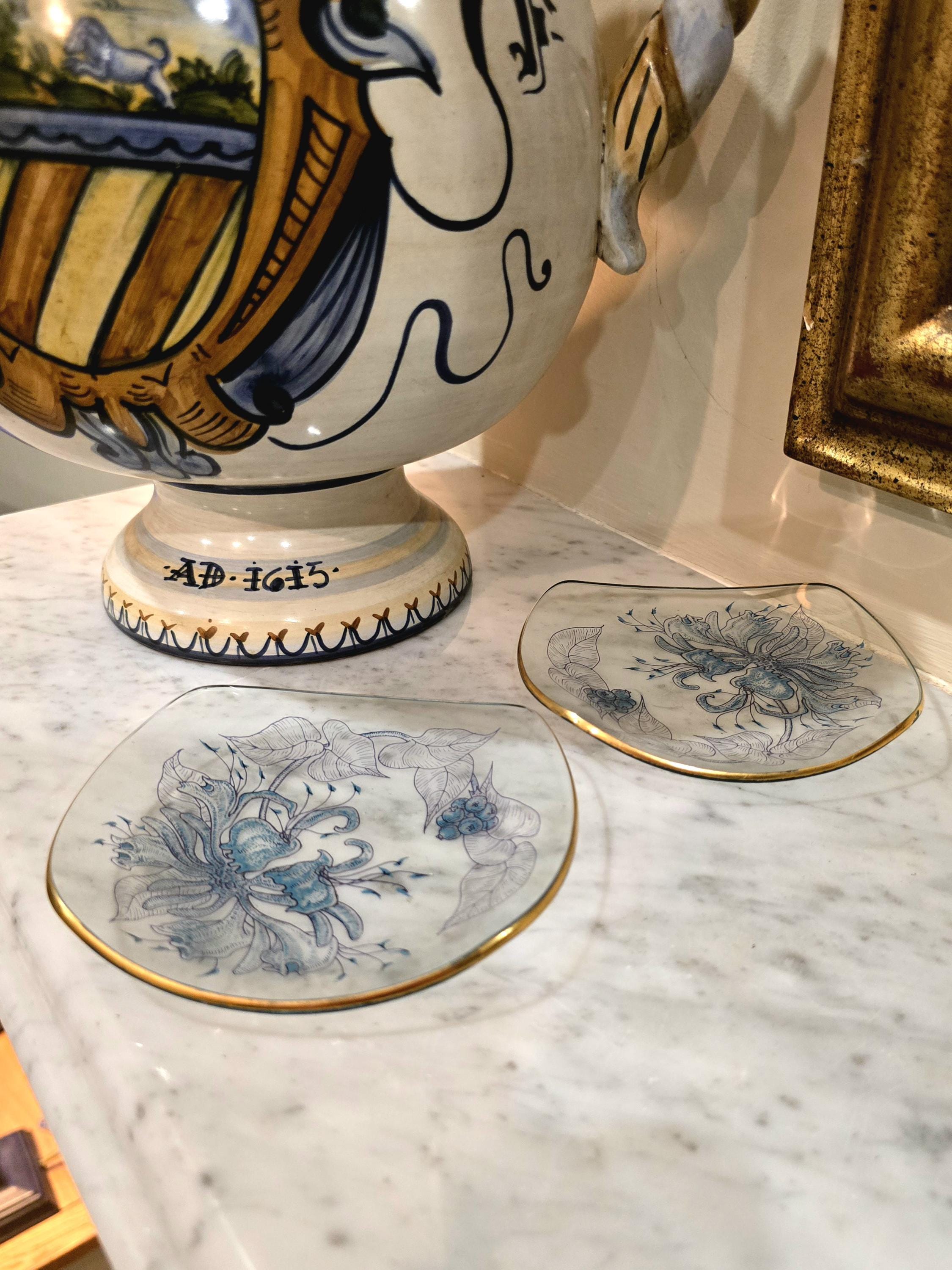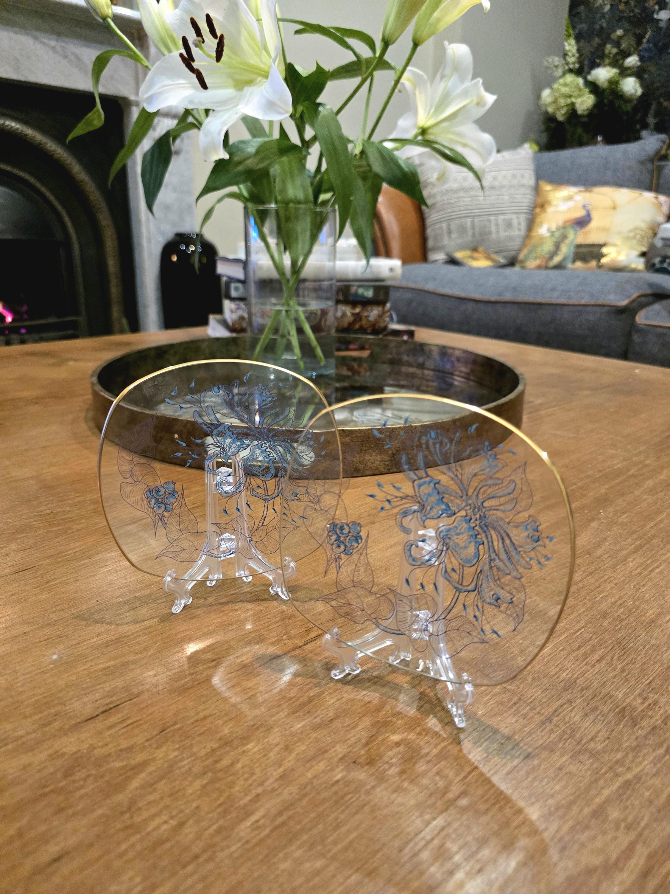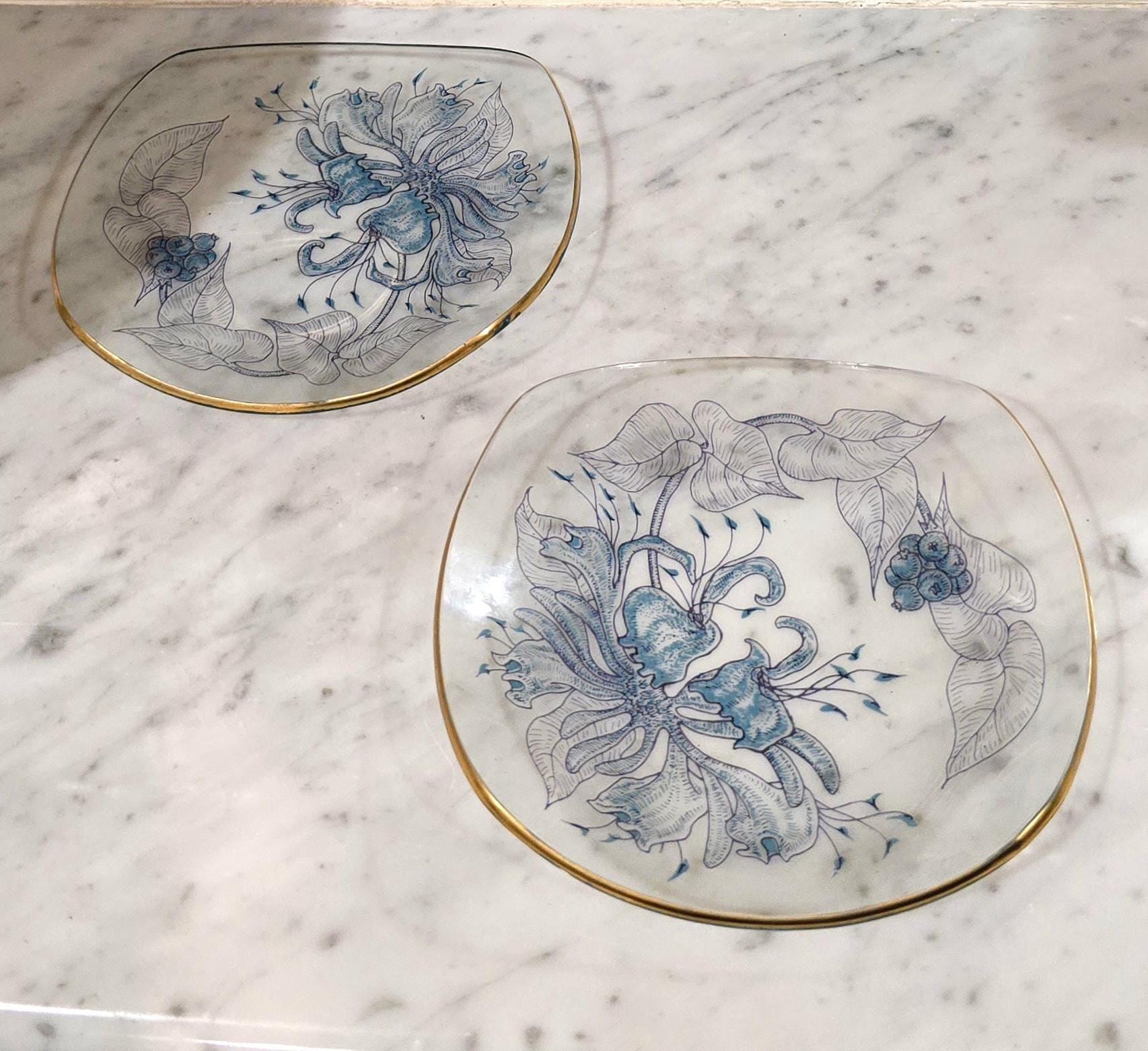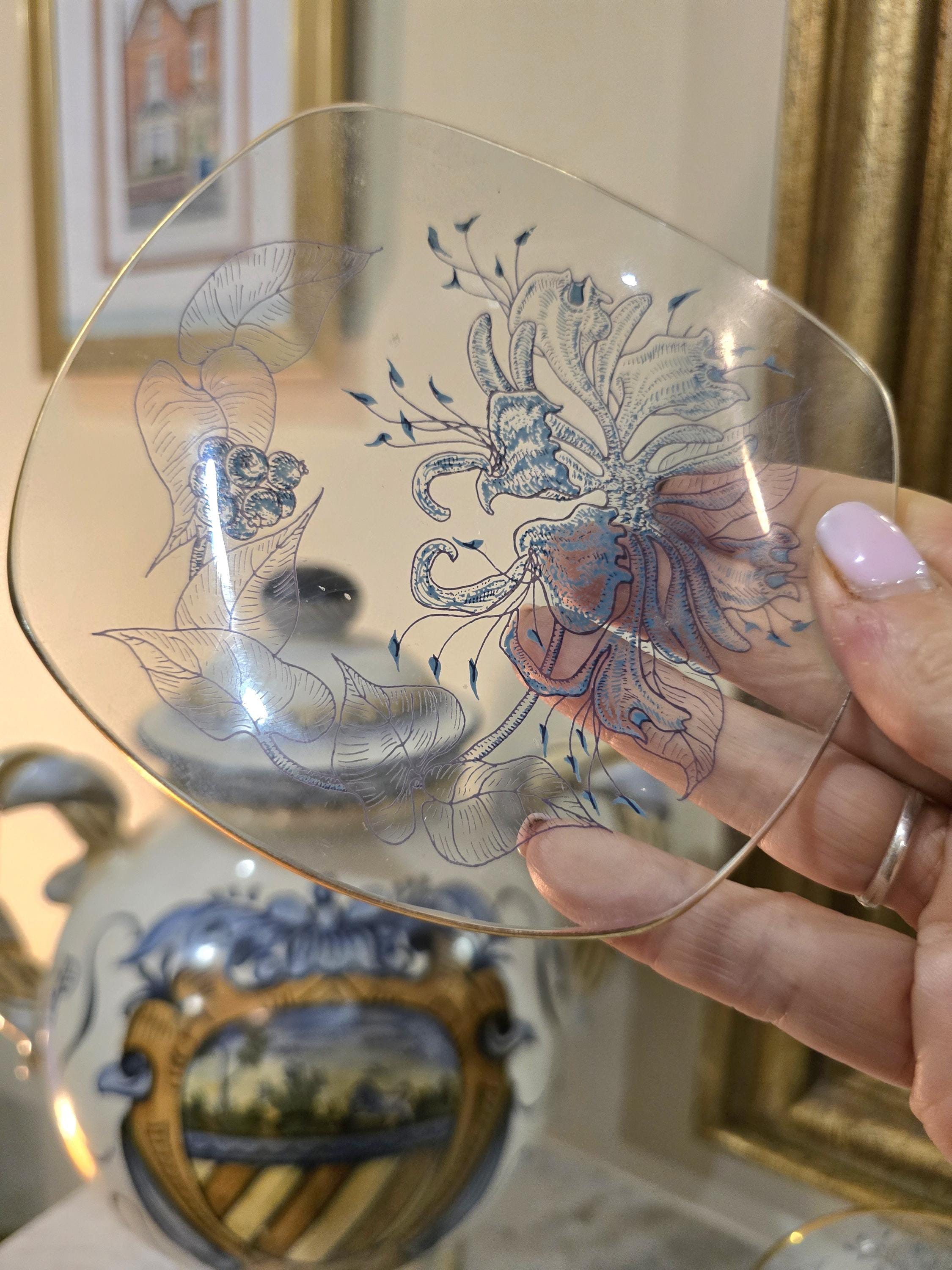 Fine Glass Trinket Dish / Two Small Serving Plates – 5" – Blue Botanical Art Deco Design