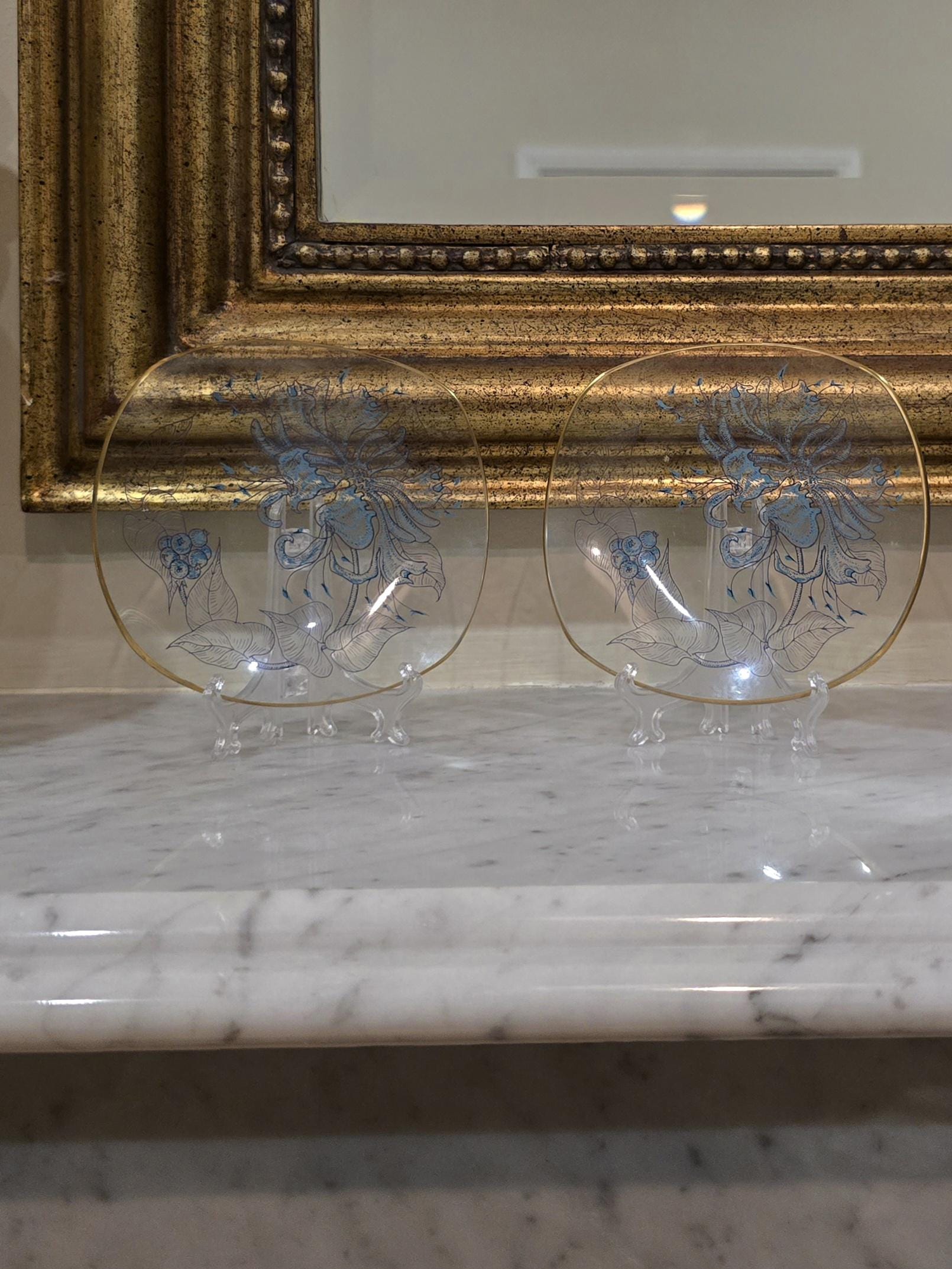A pair of exquisite fine‑glass trinket plates, each delicately adorned with soft blue botanical detailing and finished with a whisper of gold around the edge. At 5" wide, they’re the perfect size for life’s small rituals — a resting place for jewellery, a morning ring dish, a bedside companion, or a graceful touch on a dressing table.