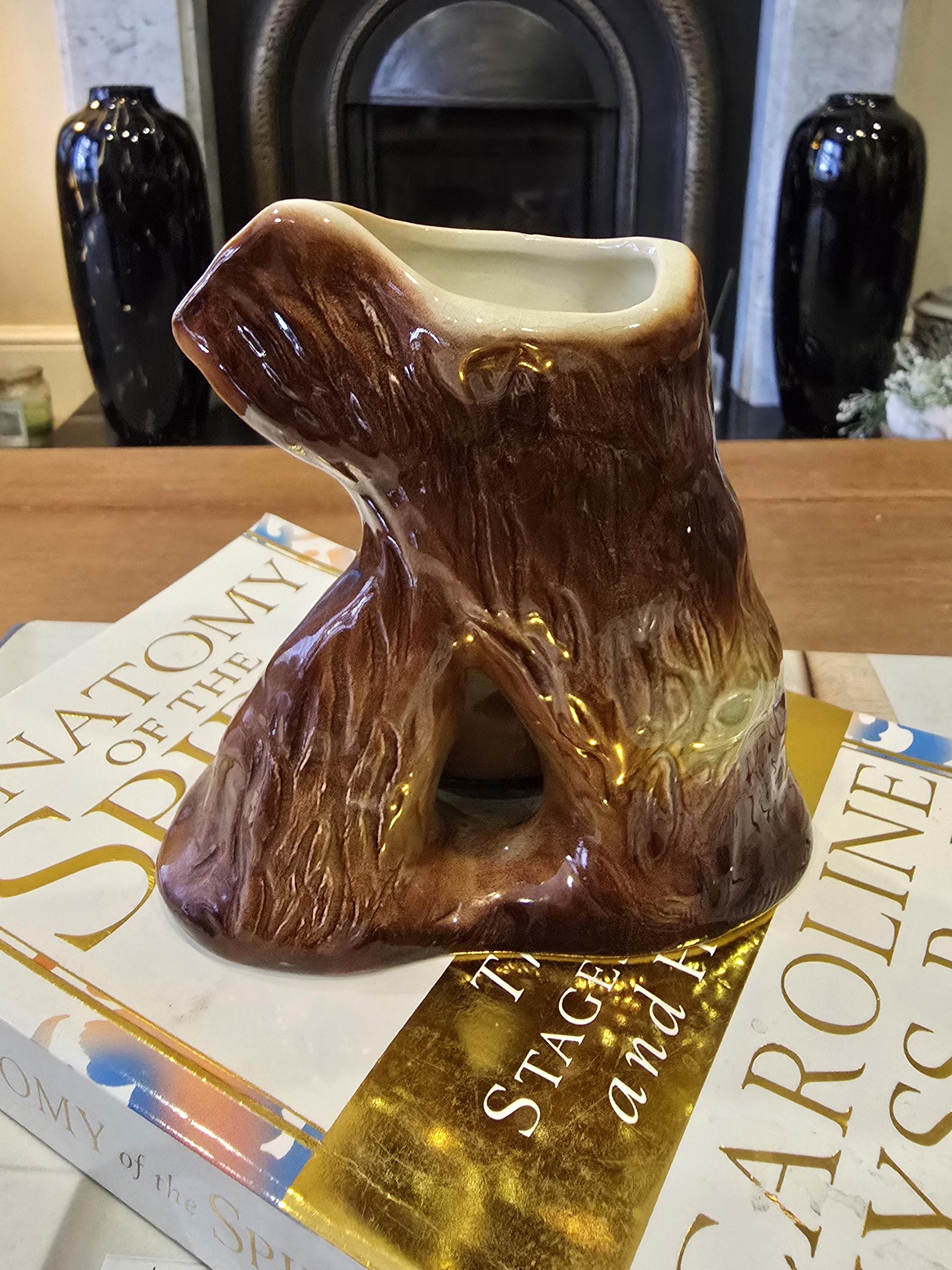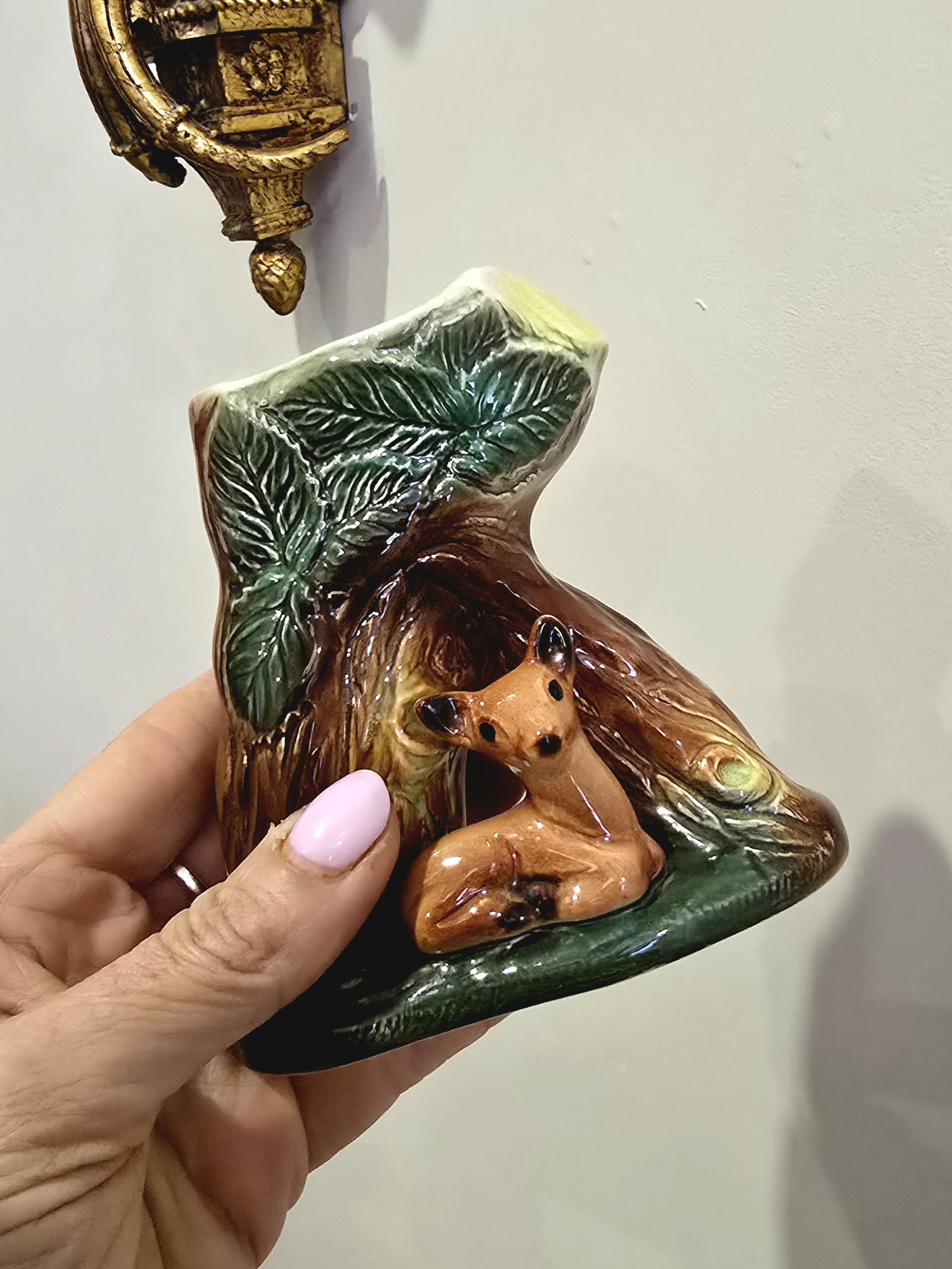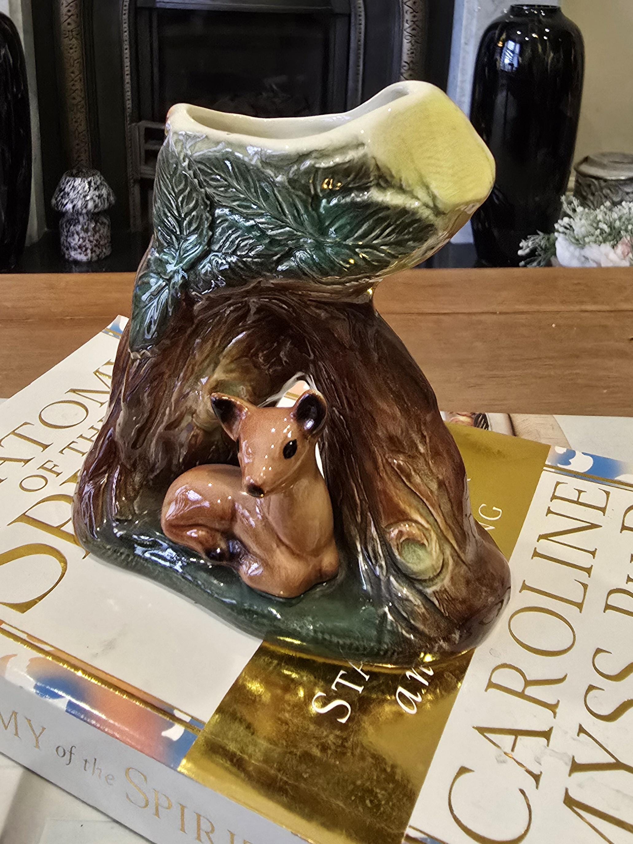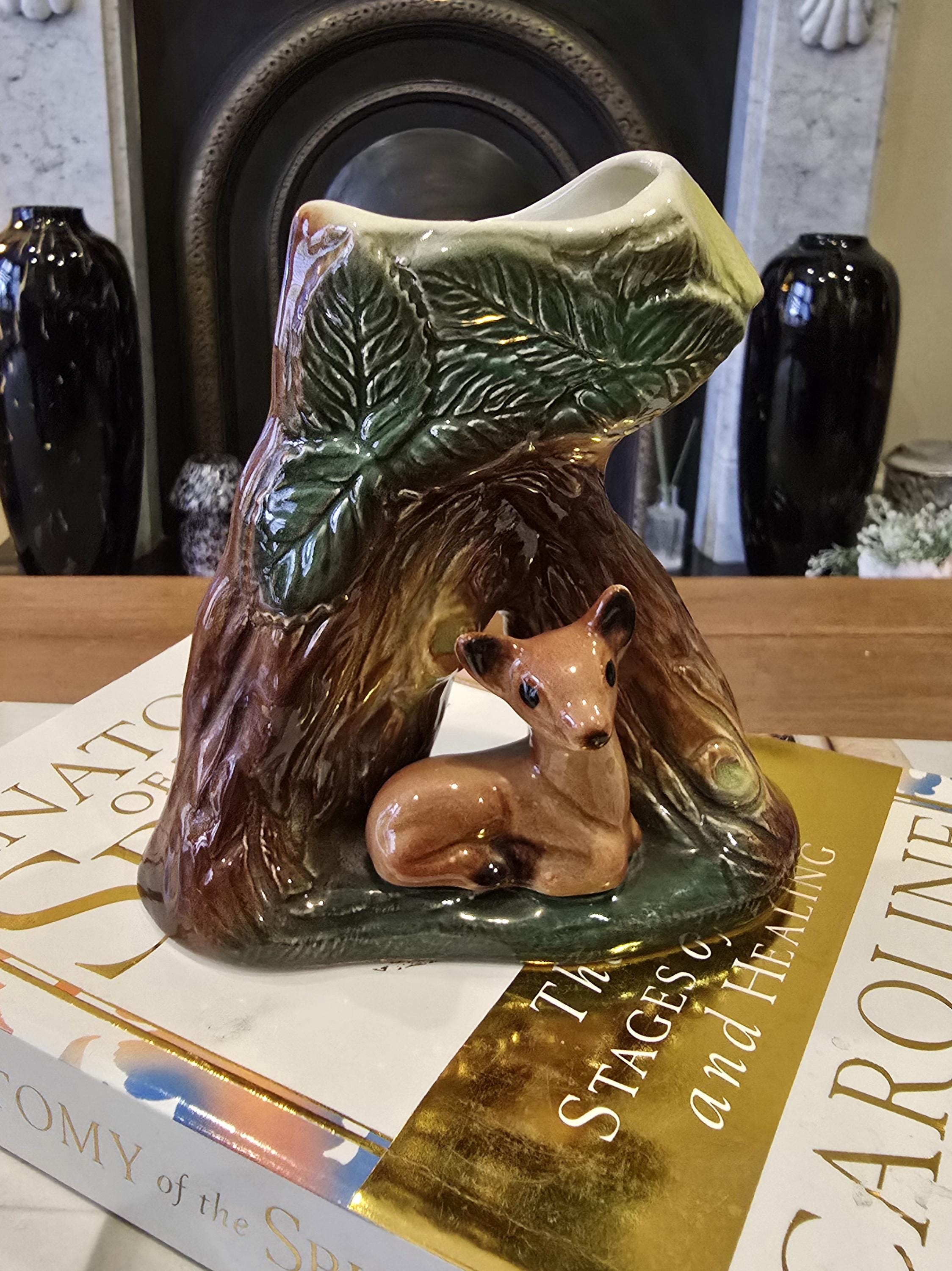 Bring a touch of the English forest into your home with this darling vintage Eastgate Pottery woodland vase. This classic piece features a sweet, wide-eyed fawn resting inside a hollowed tree stump, decorated with textured bark and relief-molded green leaves.