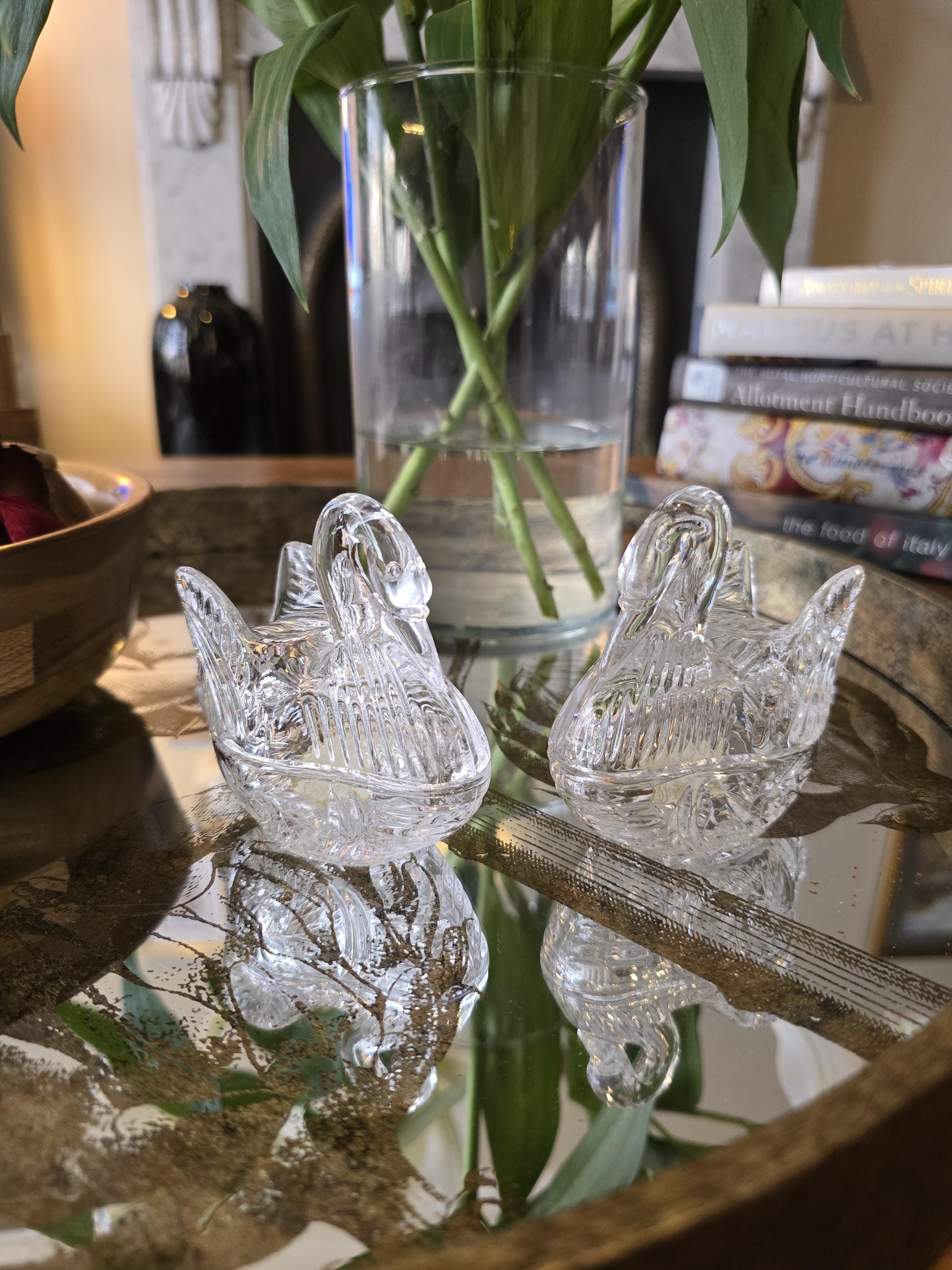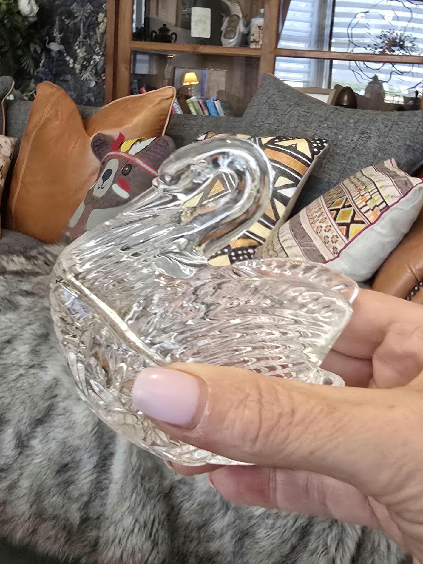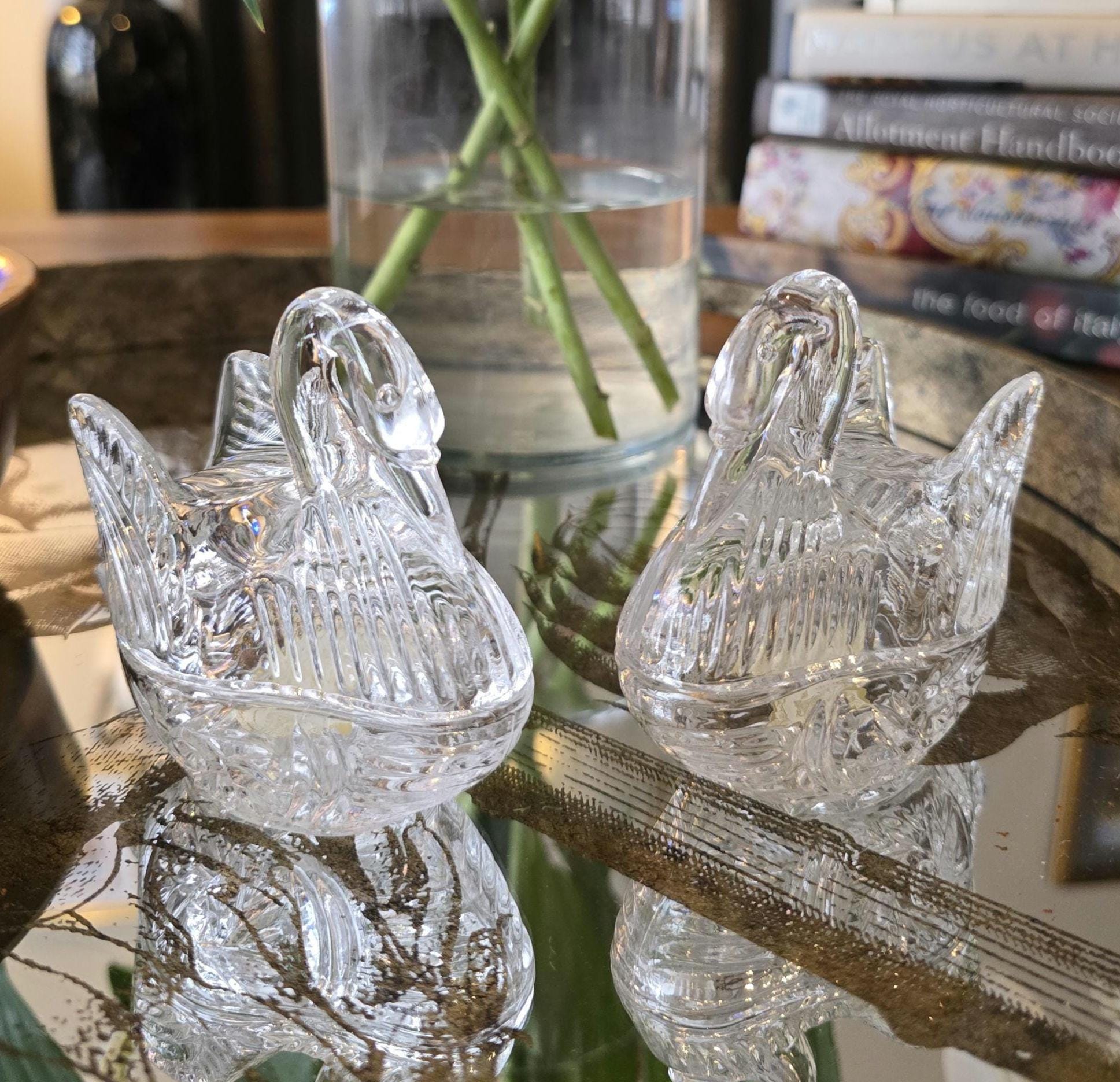 ​Each swan features a two-piece design: a faceted, "feathered" lid and a base with a traditional starburst cut. They are the perfect size for safely holding rings, earrings, or small keepsakes.