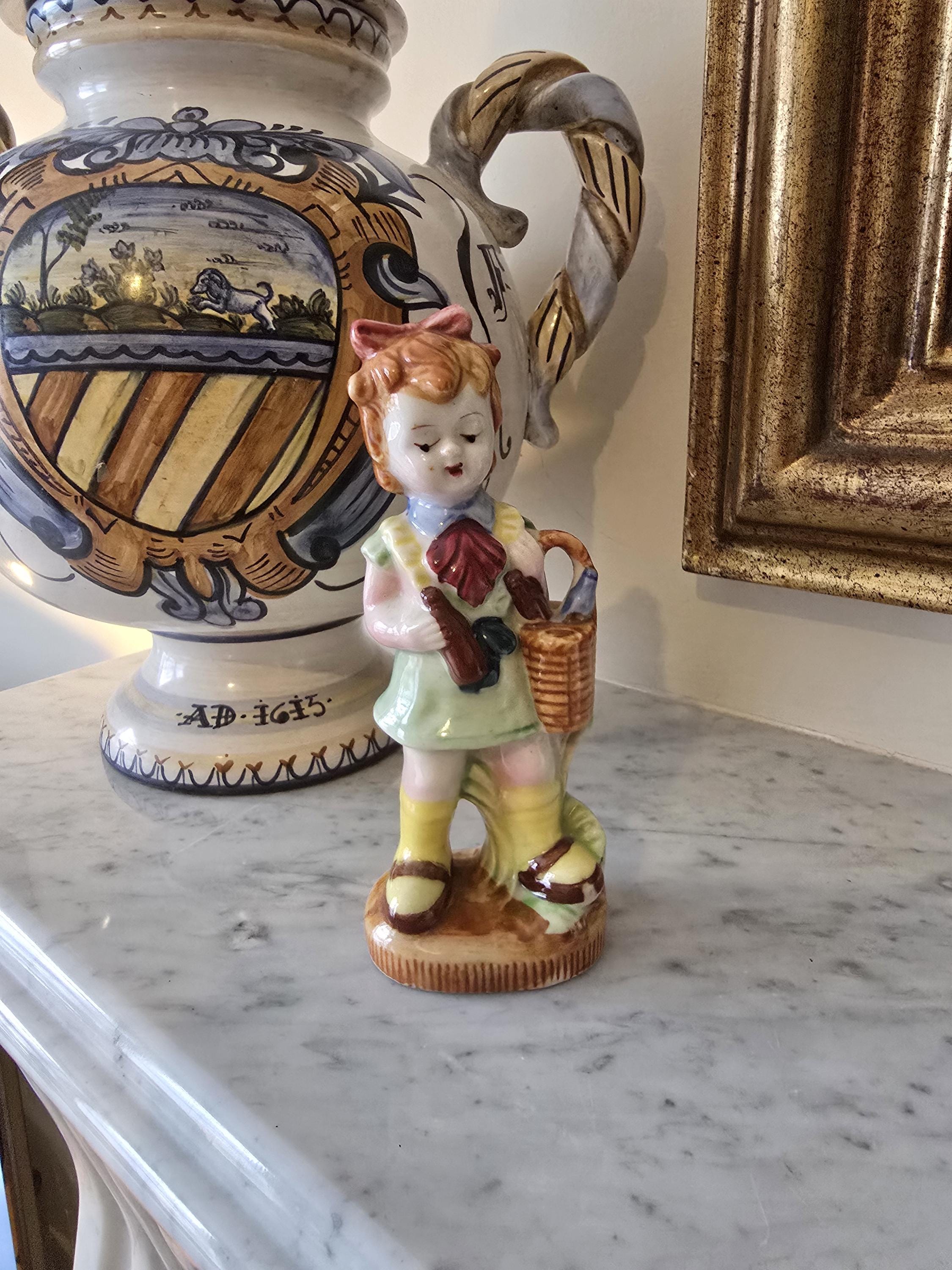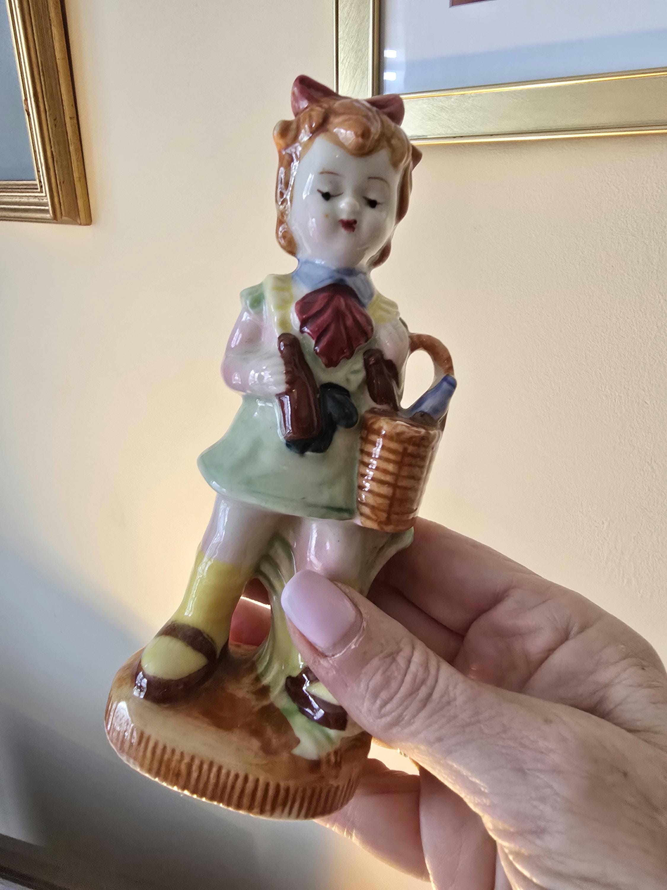 ​This delightful vintage porcelain figurine stands 6 inches tall and depicts a young girl ready for a country outing. She is dressed in a pale green pinafore with a bold red necktie, carrying a woven-style basket and a small canteen.