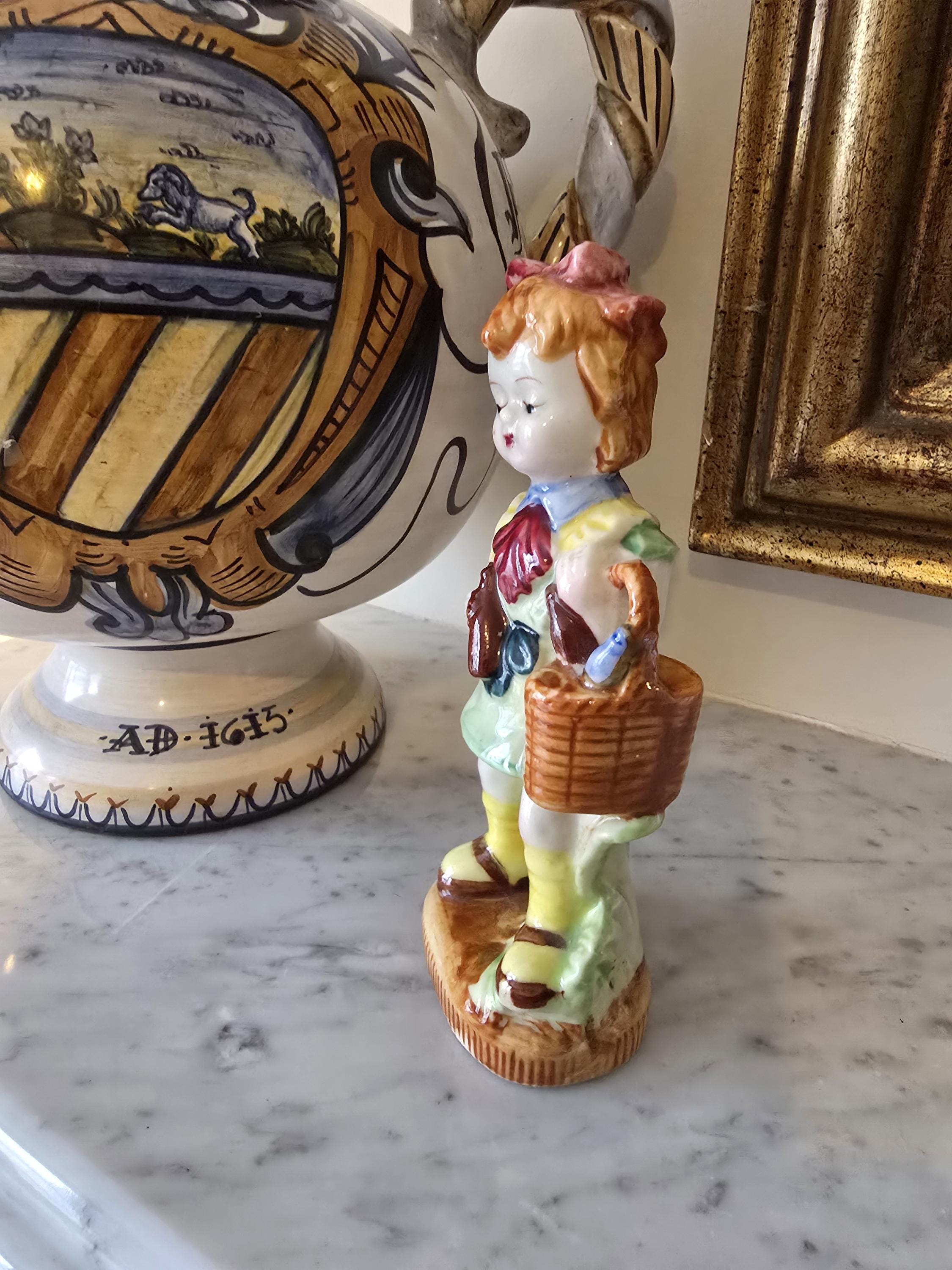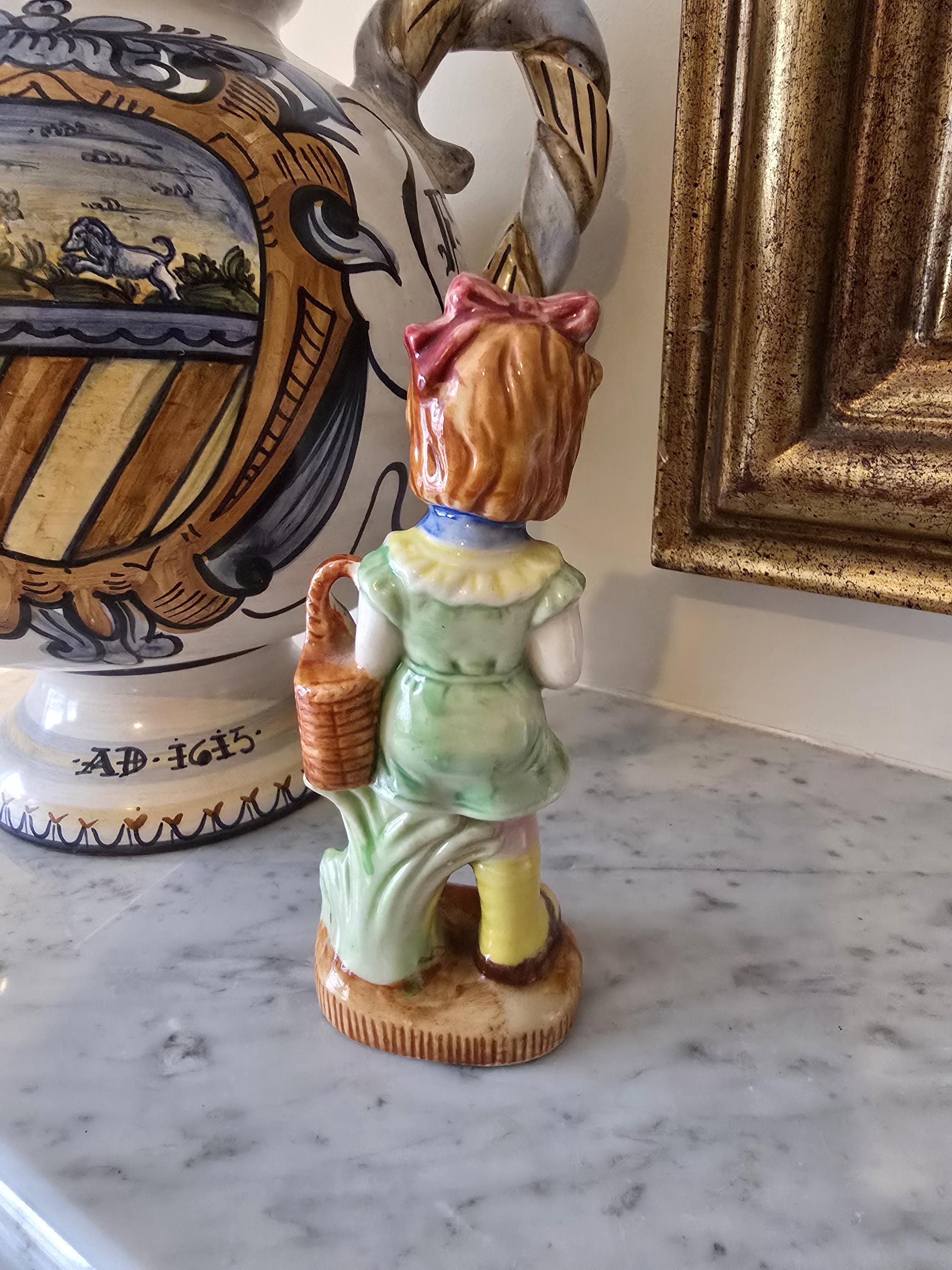 ​The piece features charming hand-painted details, from her rosy cheeks and delicate facial features to her bright yellow socks. The glossy glaze gives it a beautiful shine that catches the light perfectly.