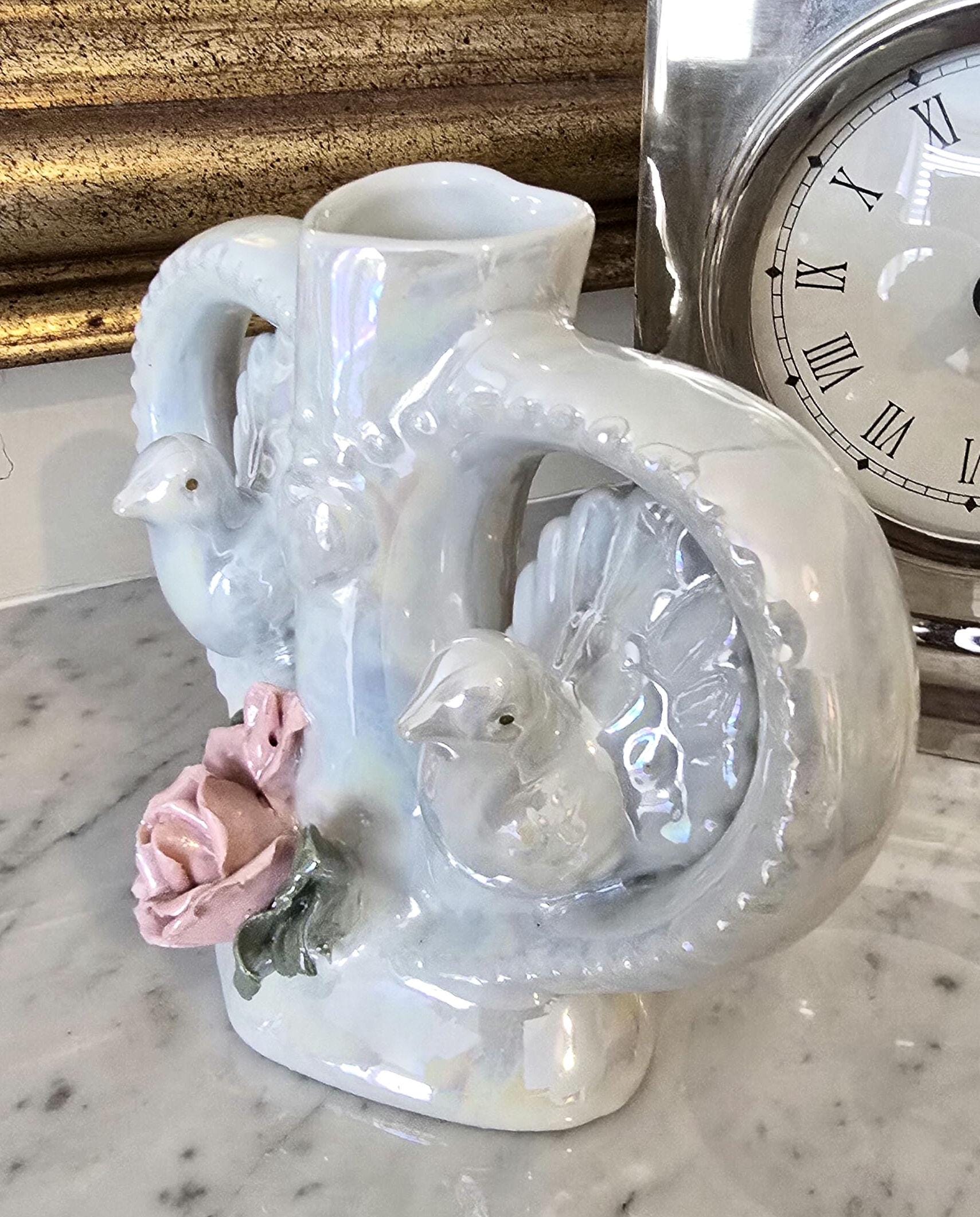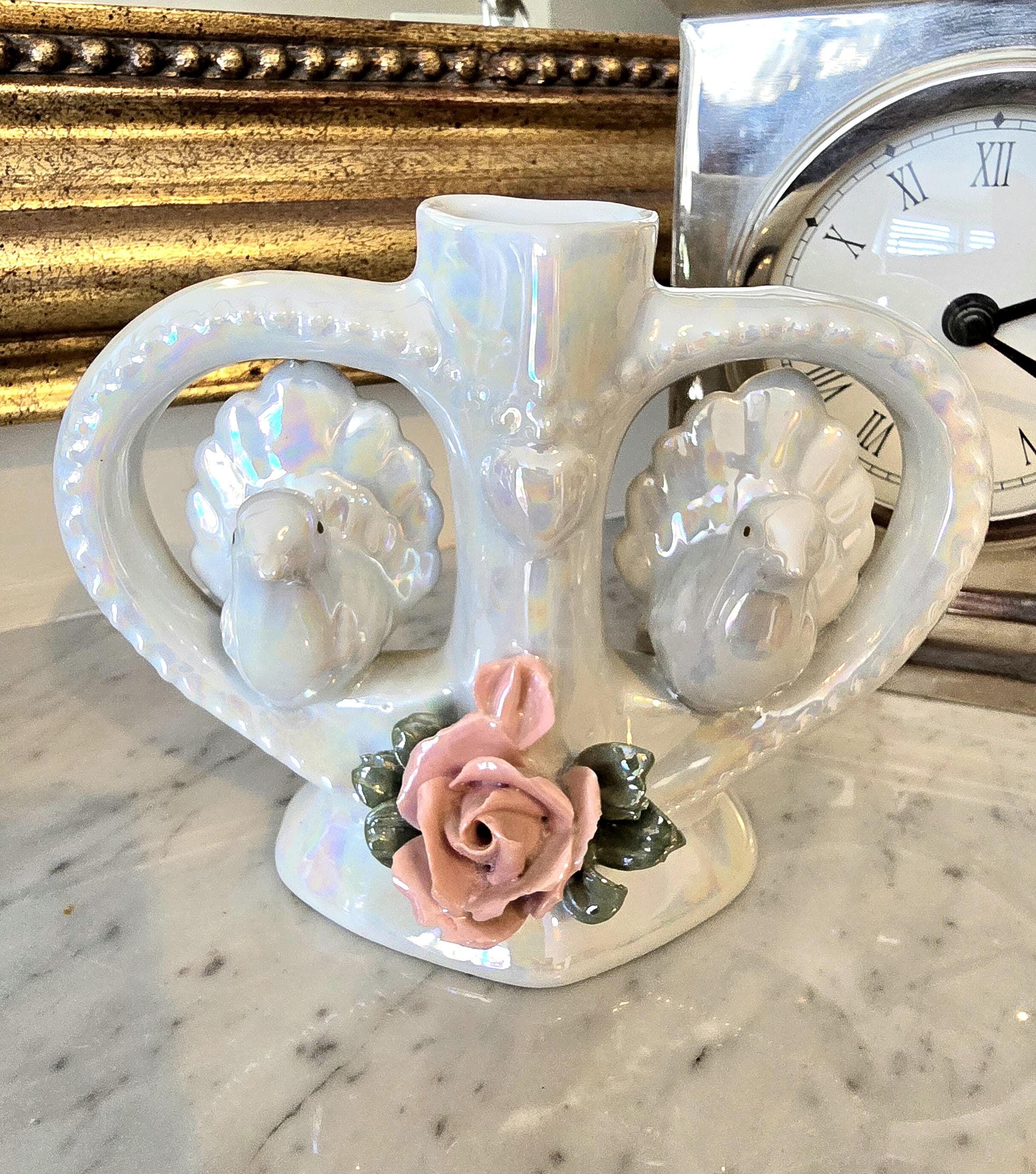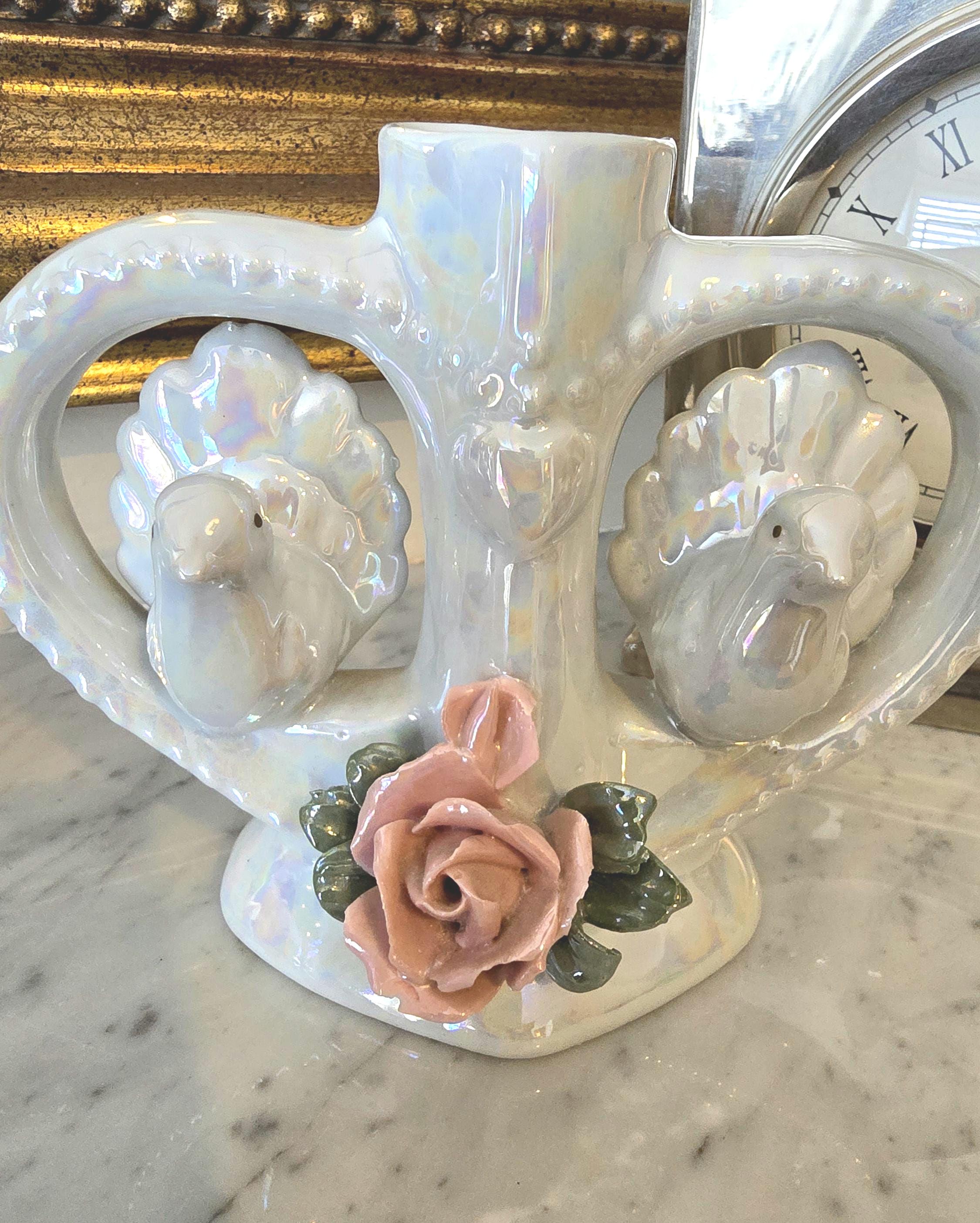Vintage Heart Bud Vase | Iridescent Lustreware Doves & Rose