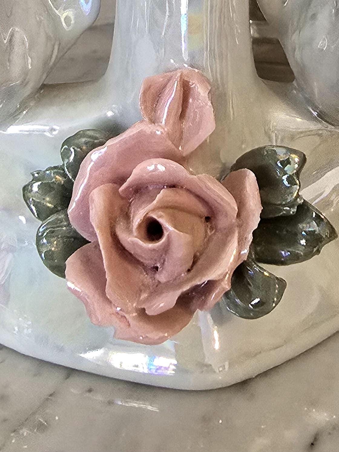 Add a touch of iridescent charm to your vanity or bookshelf with this enchanting vintage porcelain bud vase.