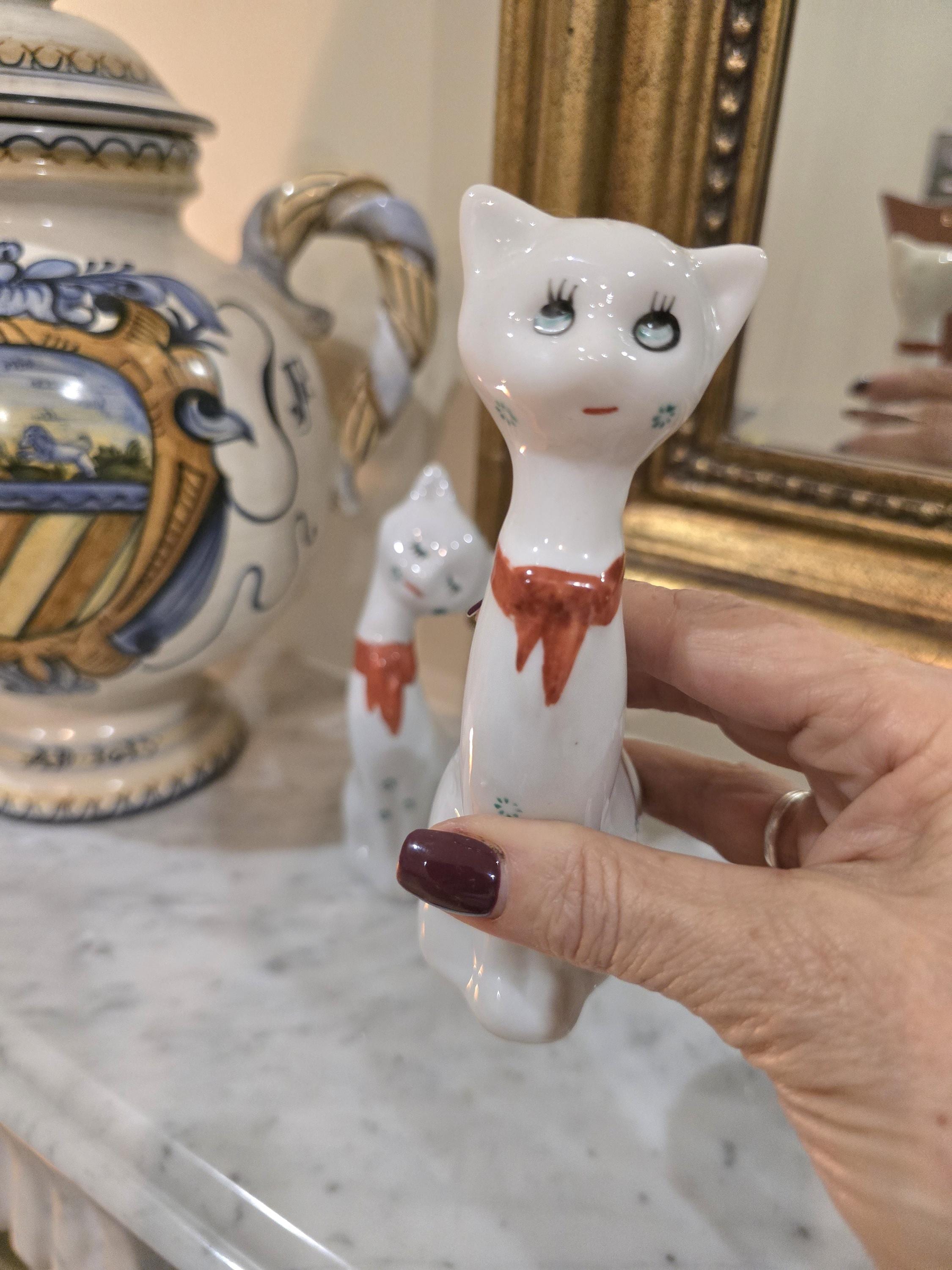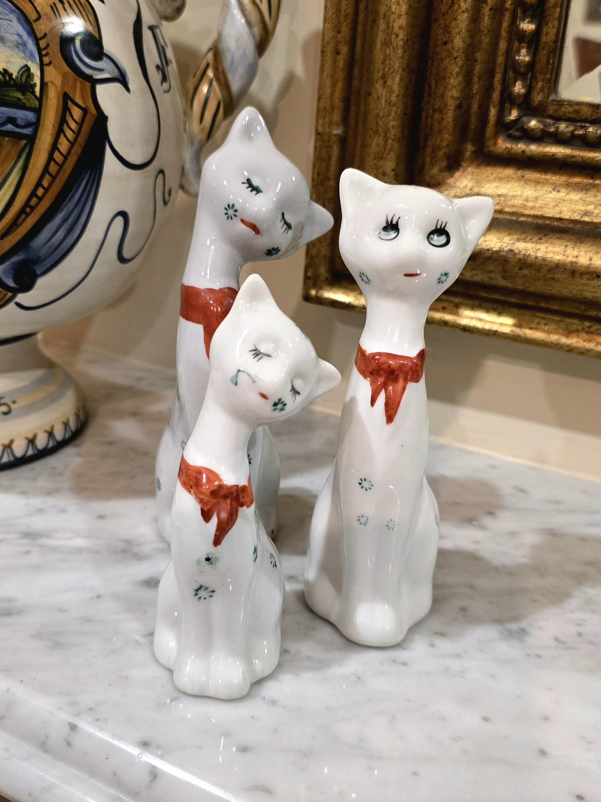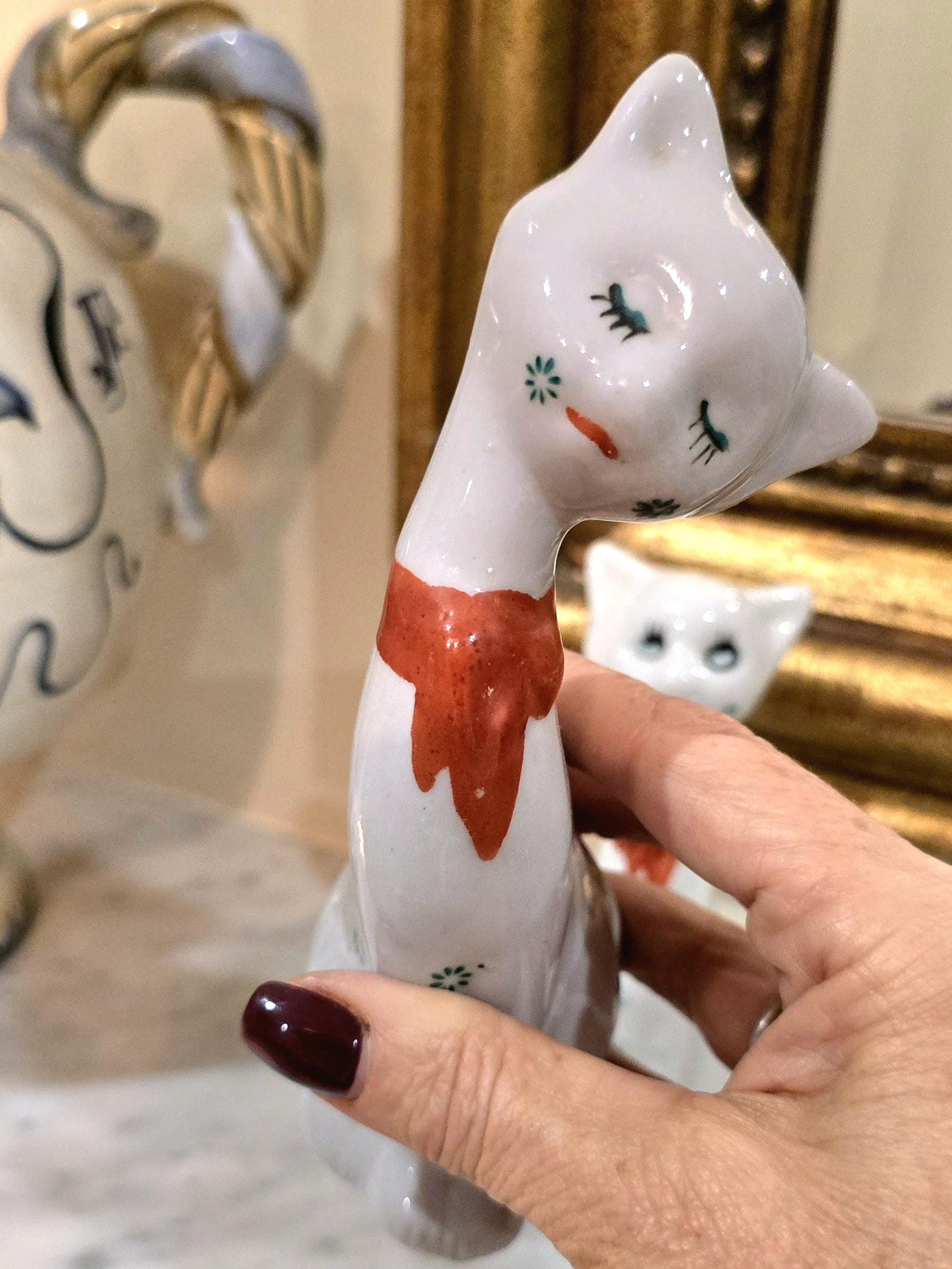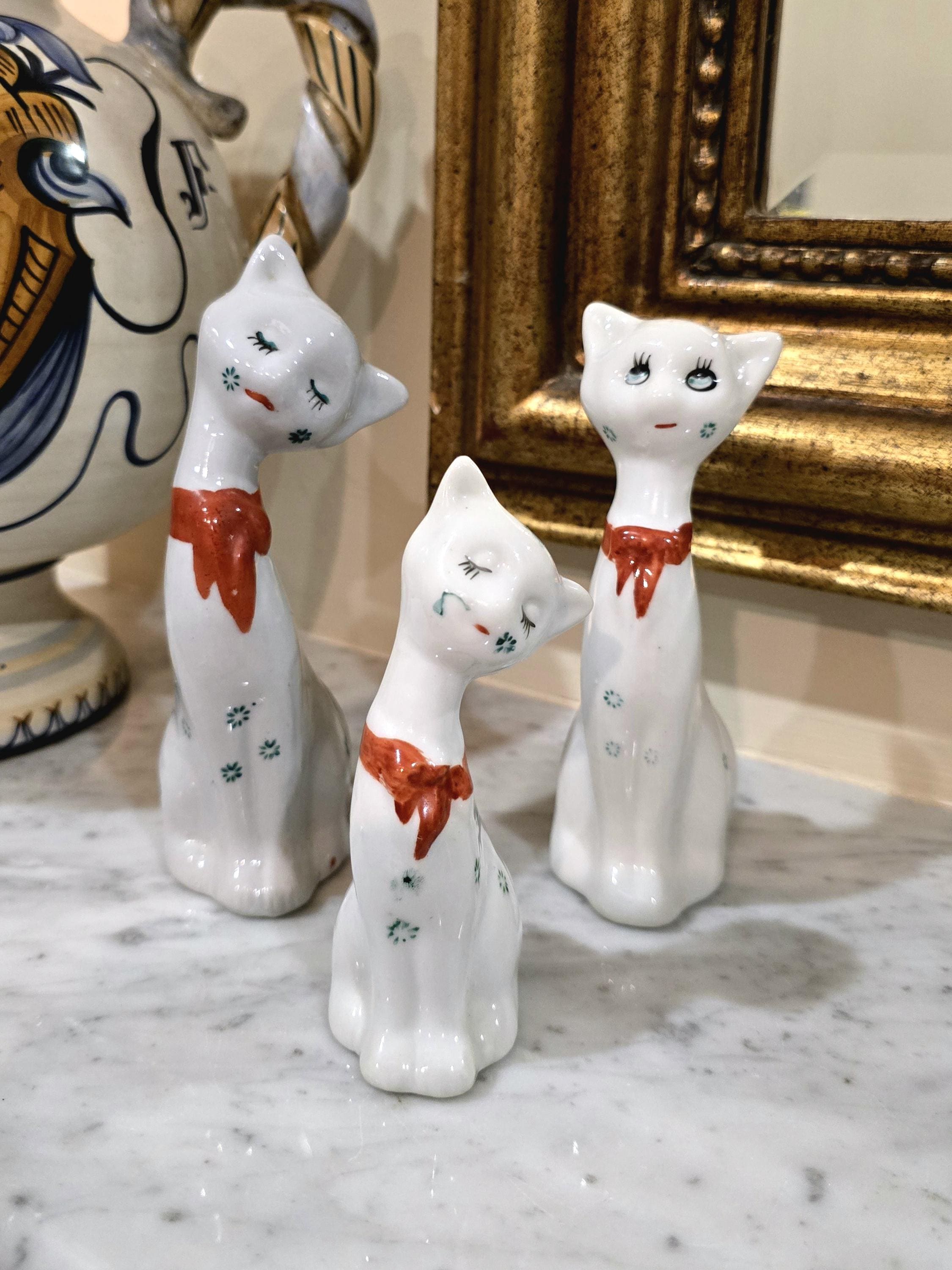 Elevate your "shelfie" game with this darling trio of mid-century sirens. These aren't just cats—they’re an entire mood. Featuring the iconic elongated necks of the 1950s and 60s, these feline beauties are all about the details: those dramatic "bat-them-at-you" eyelashes, hand-painted floral motifs, and chic burnt-orange bows.
