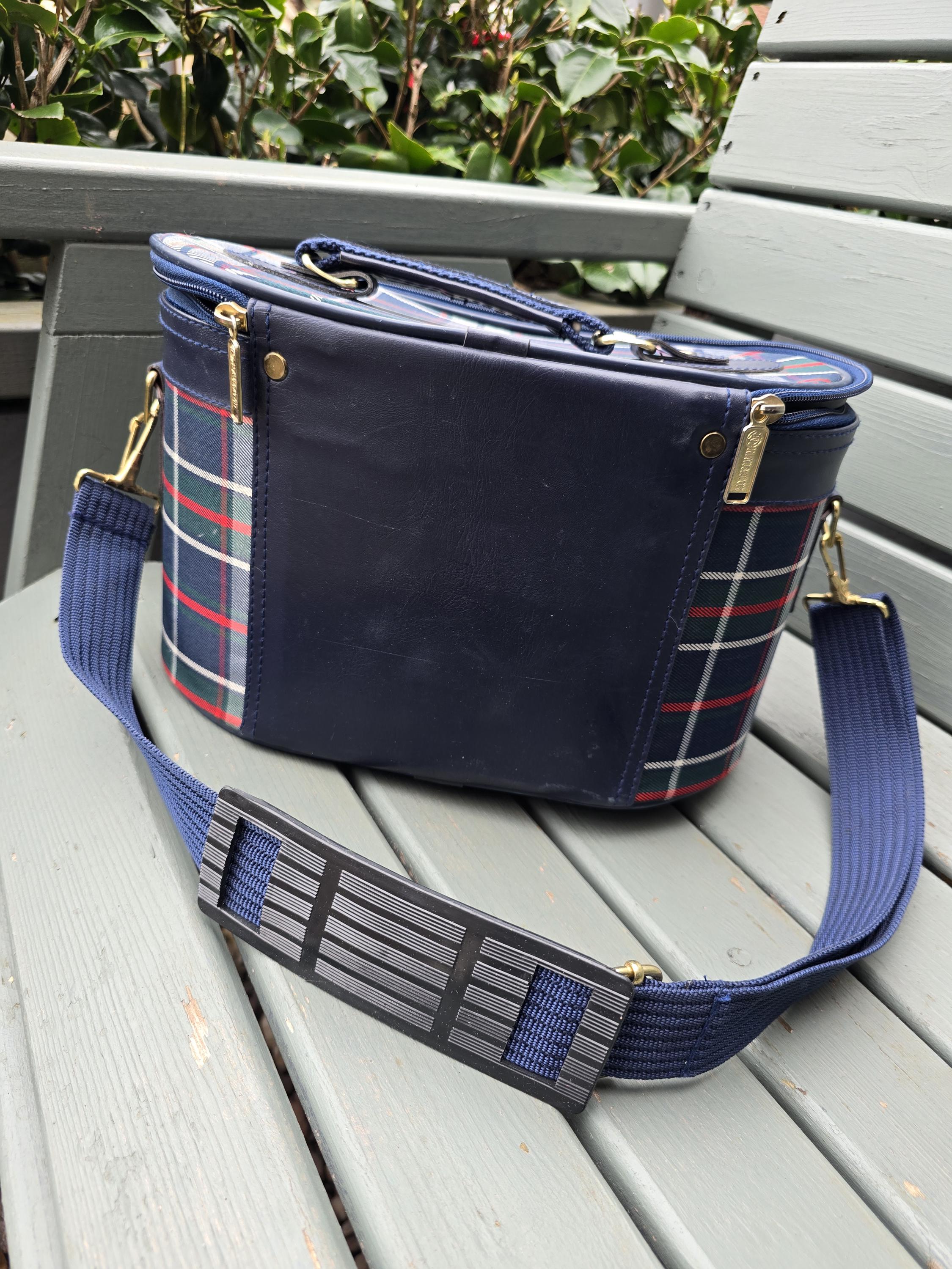 Featuring a classic navy, green, and red plaid (tartan) pattern, this structured vanity bag is as functional as it is stylish. Whether you’re using it to organise your daily makeup or as a unique overnight travel bag, its rigid "bucket" shape ensures your essentials stay protected.