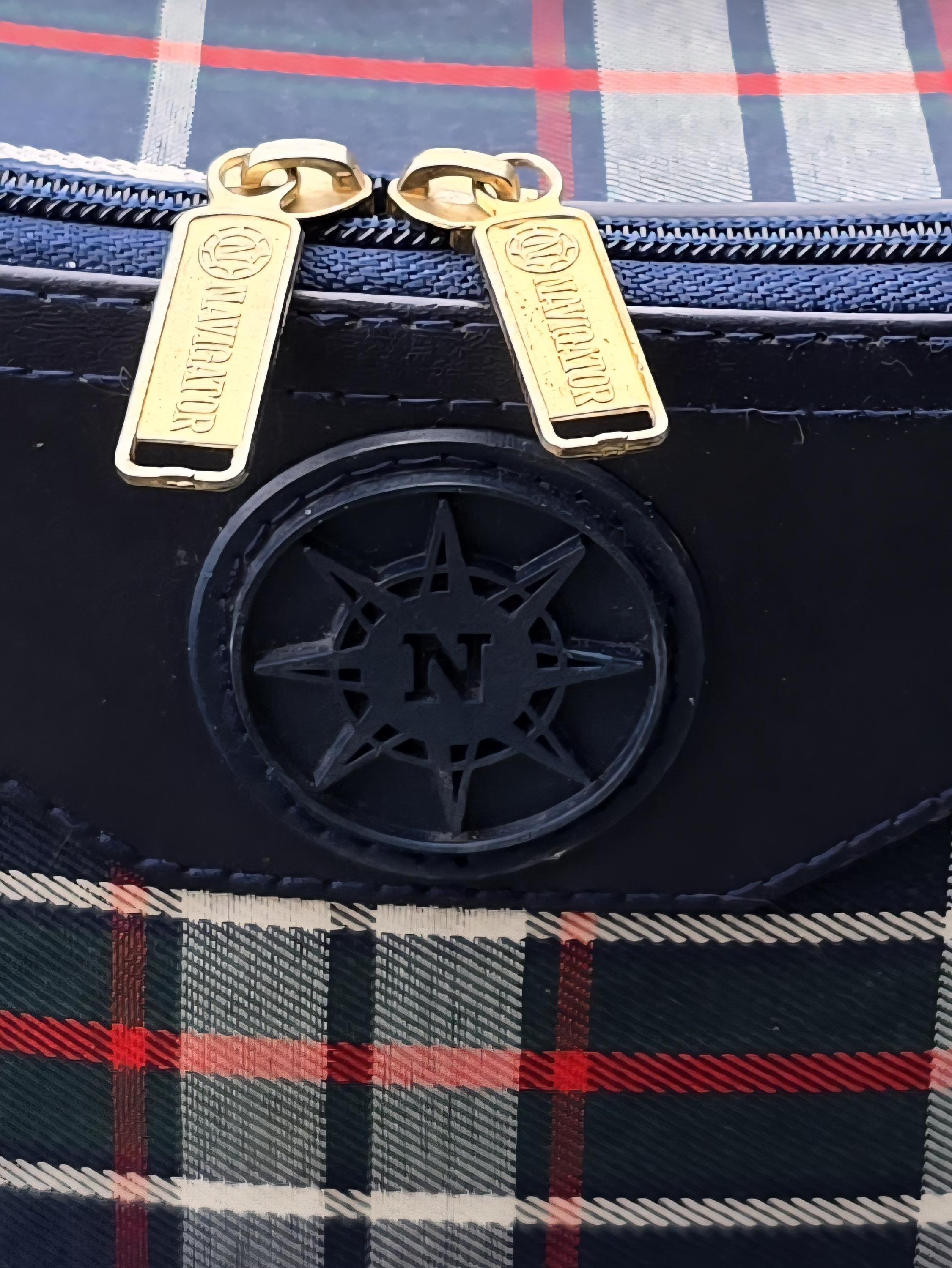 ​Classic Aesthetic: Navy blue faux-leather trim paired with a vibrant plaid fabric and gold-tone "Navigator" branded hardware.