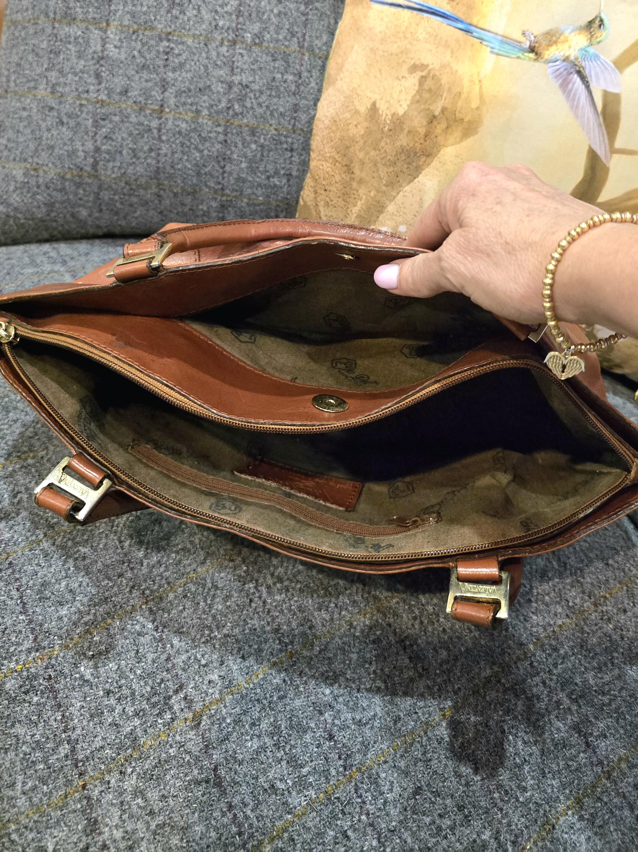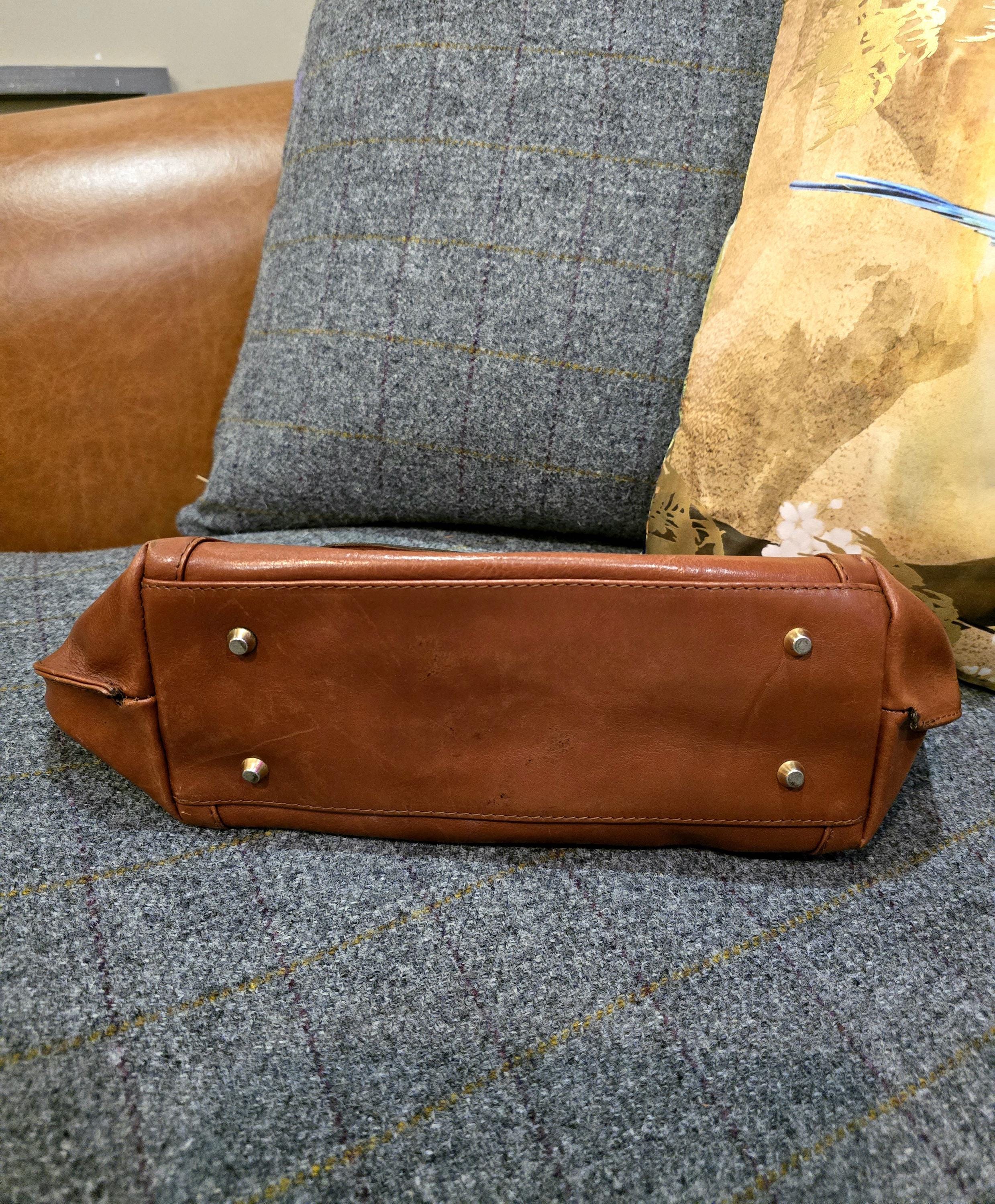 Crafted in Italy from high-quality genuine leather, this bag features a beautiful, warm tan hue that has developed a stunning natural patina over time. Its structured, tapered silhouette and dual rolled handles make it a perfect accessory for lovers of Rockabilly, Pin-up, or 1940s/50s vintage-inspired fashion.