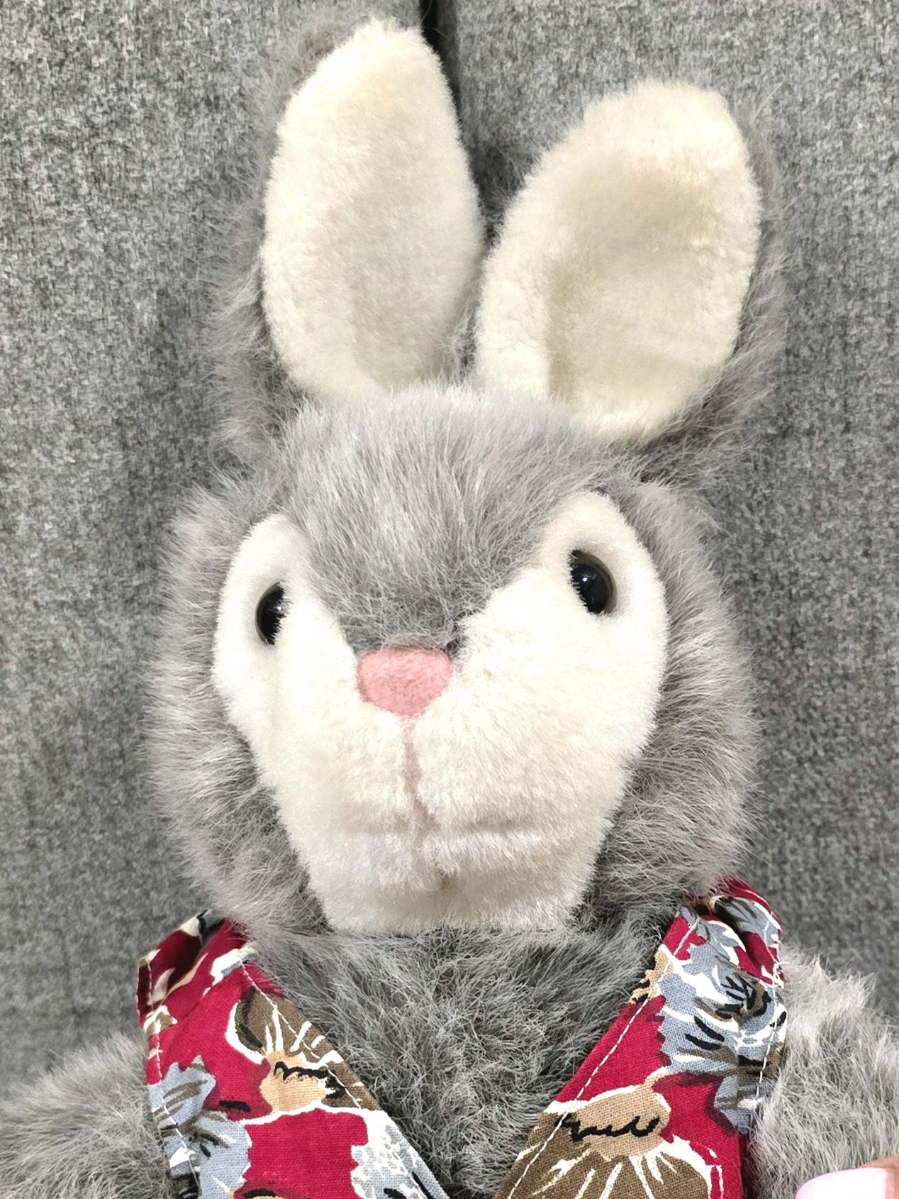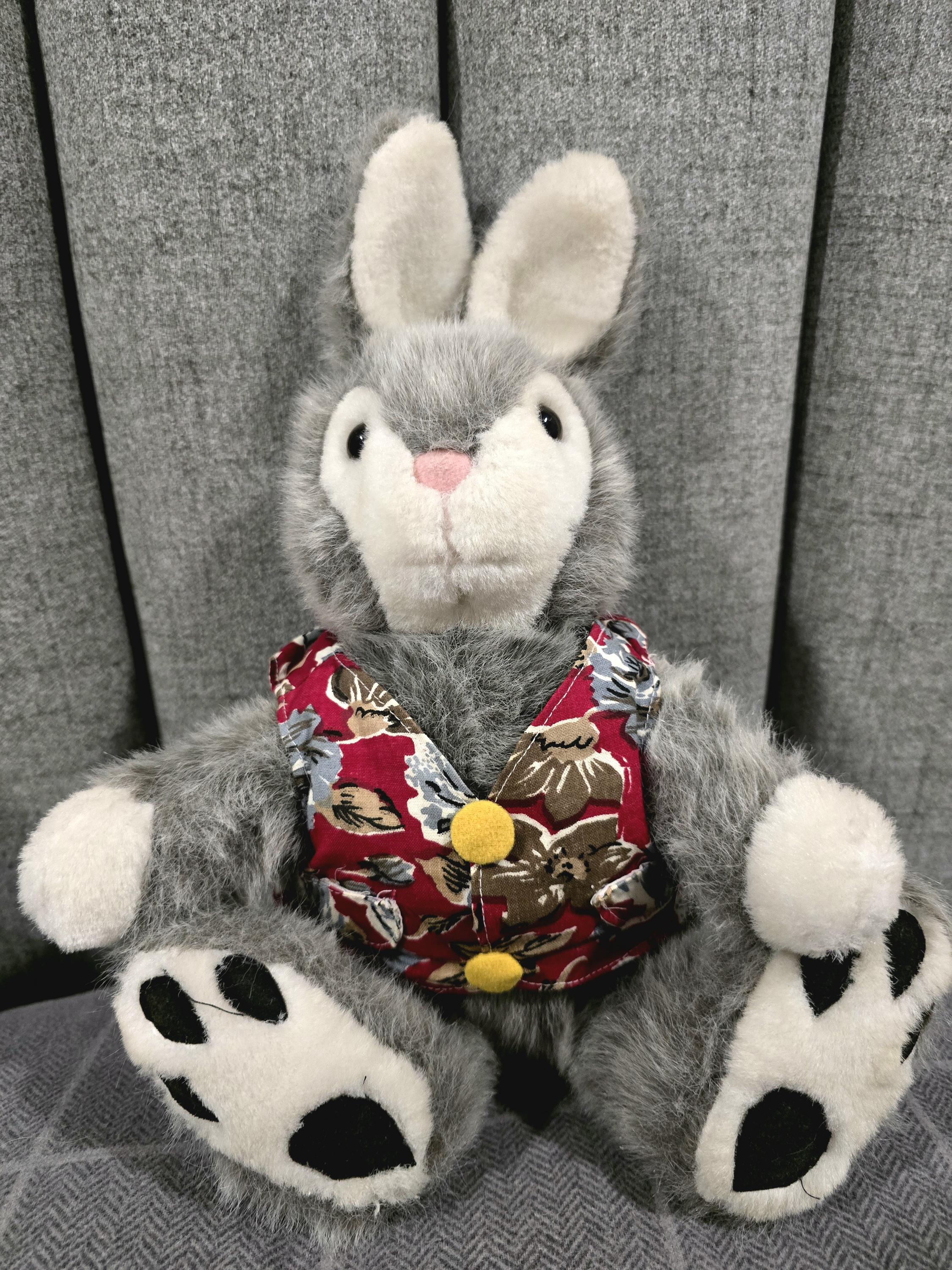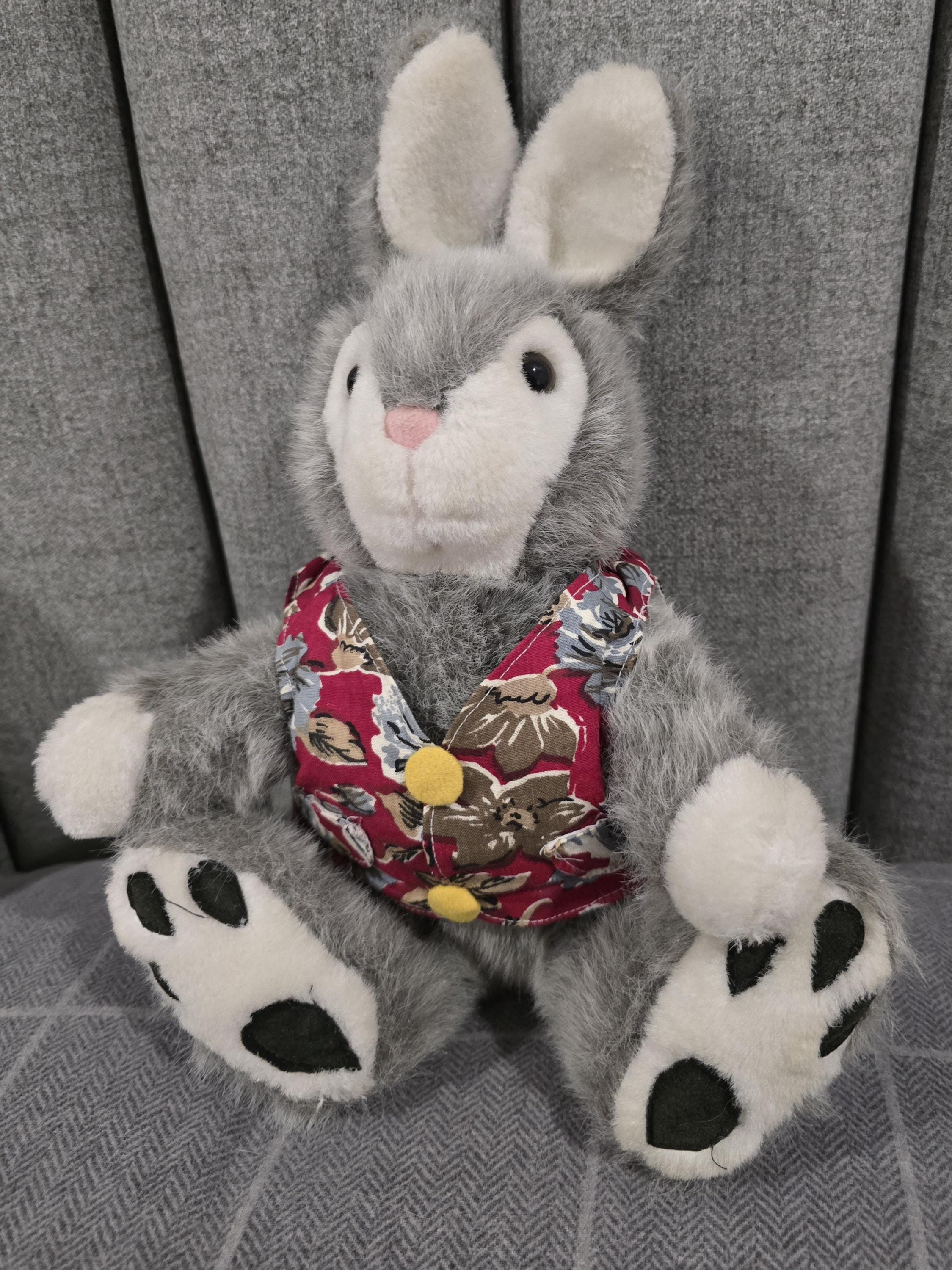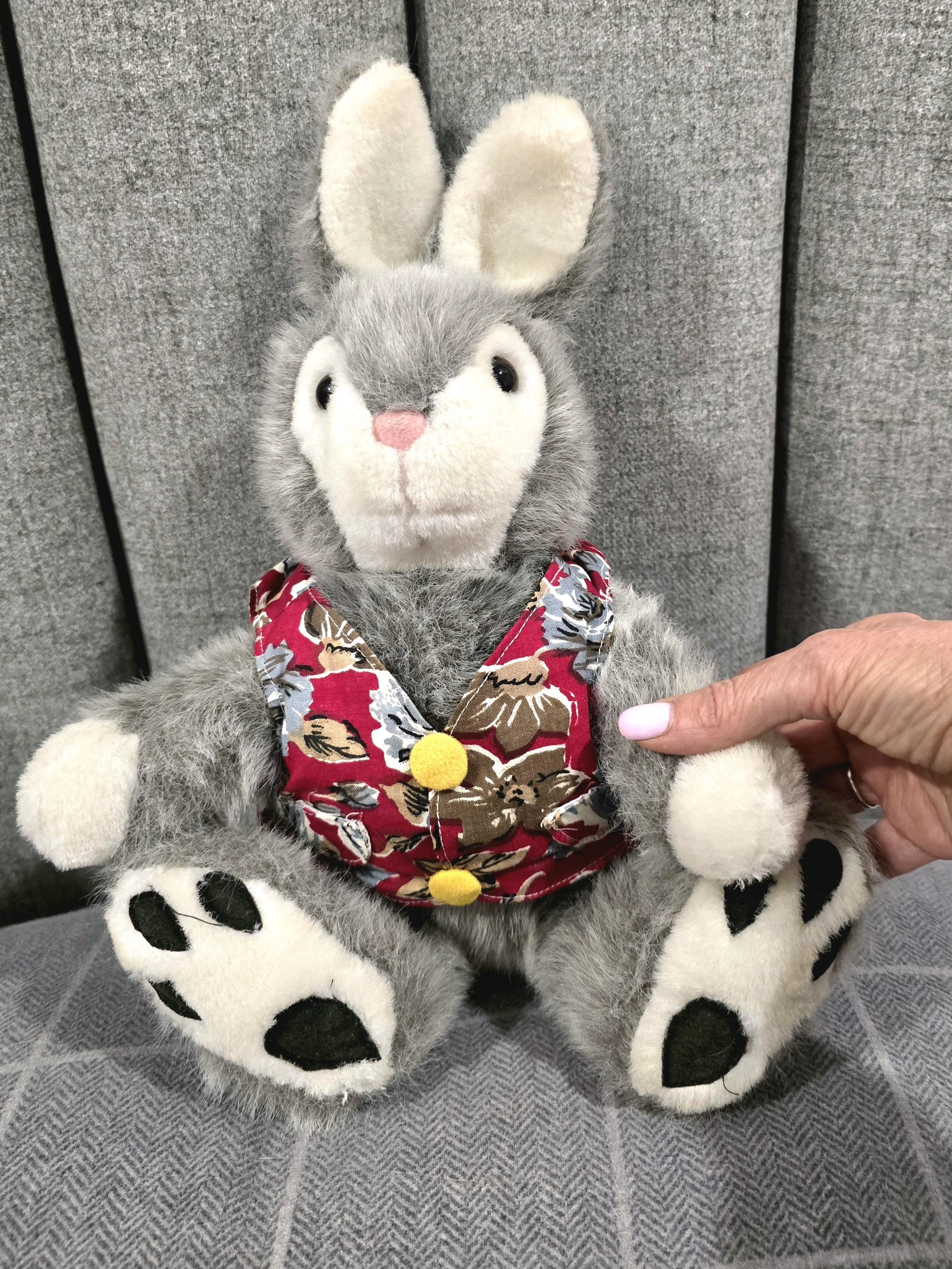Vintage Grey Plush Bunny in Floral Waistcoat - 13" Soft Toy Rabbit - Easter Gift